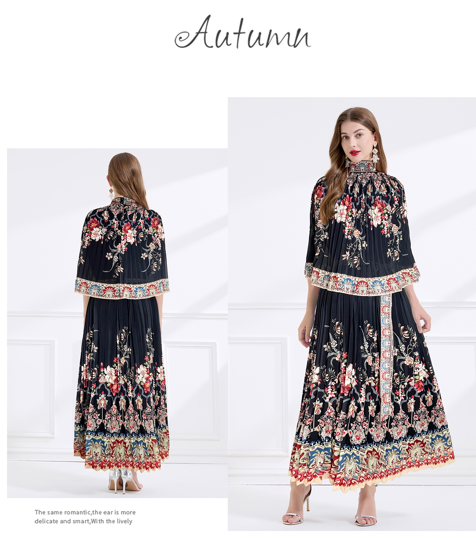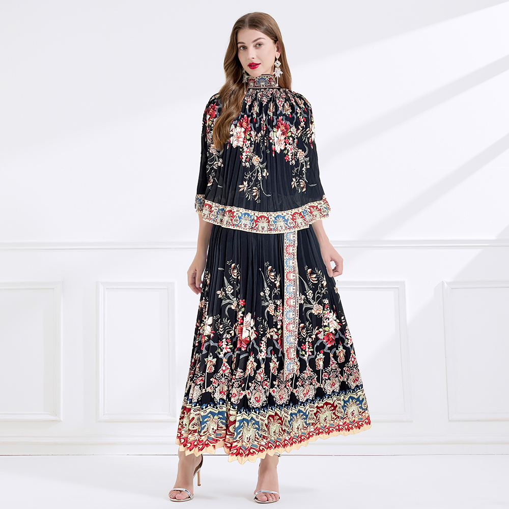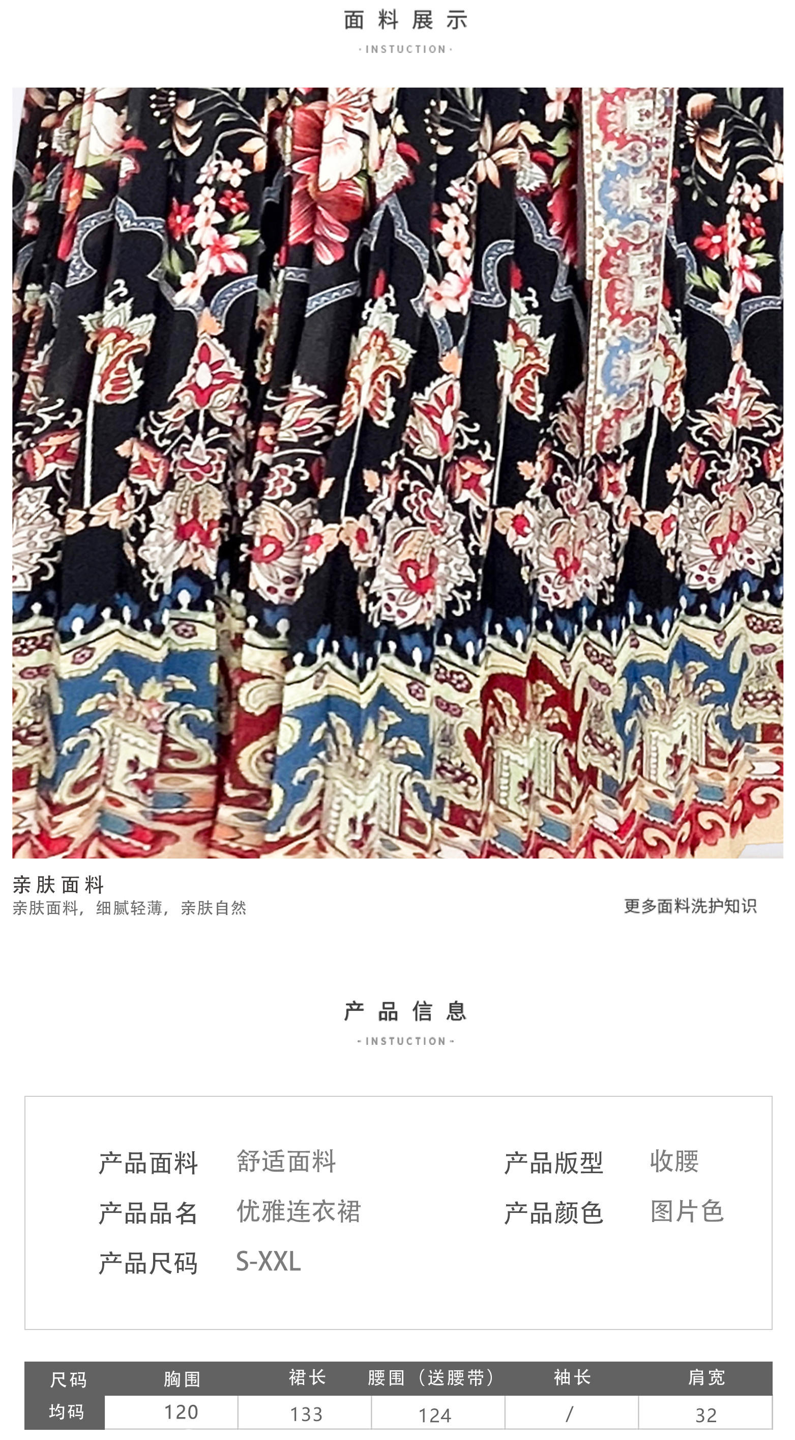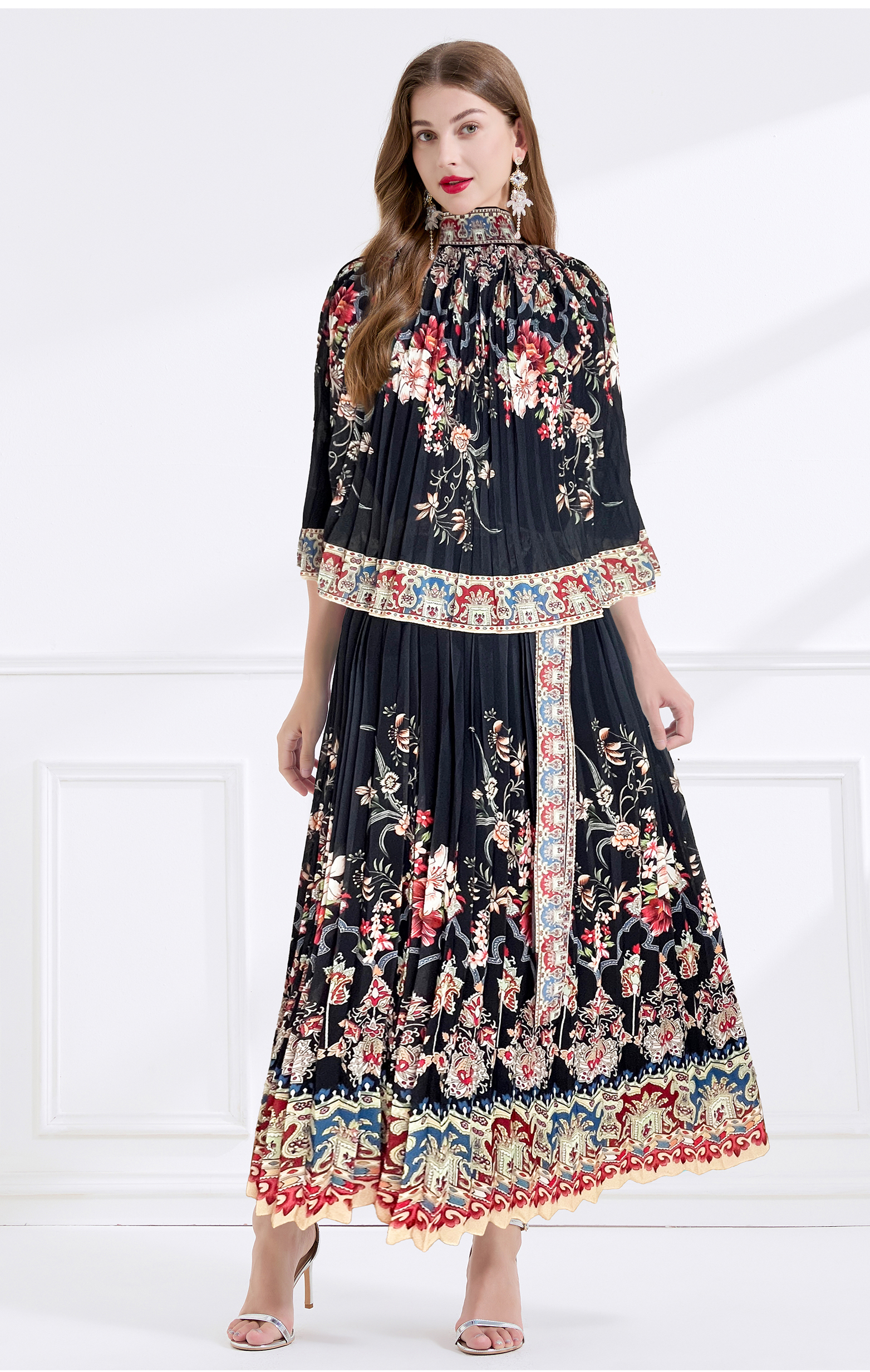 BY9191#度假风夏款雪纺立领印花百褶系带荷叶边长裙