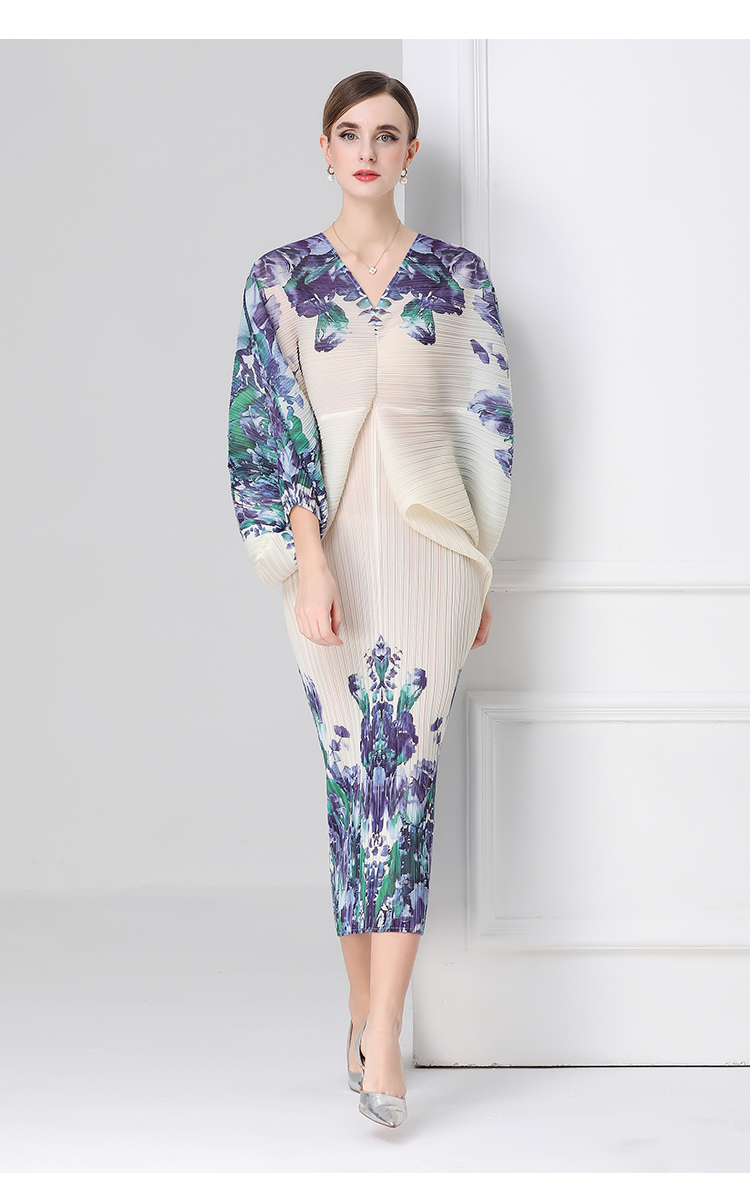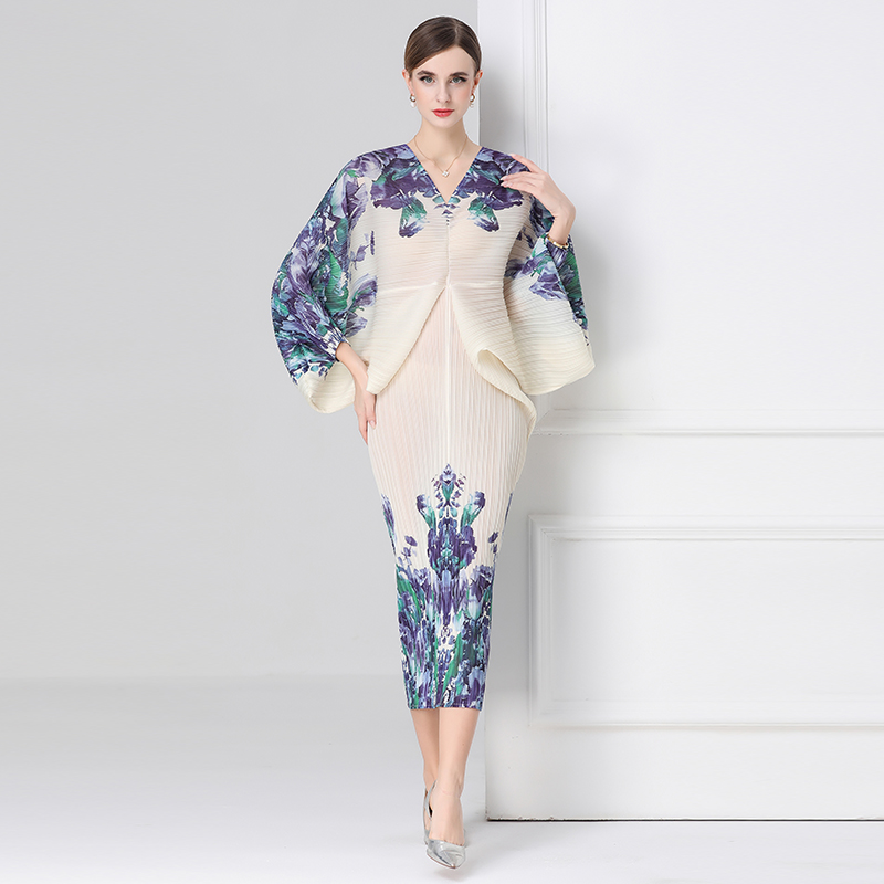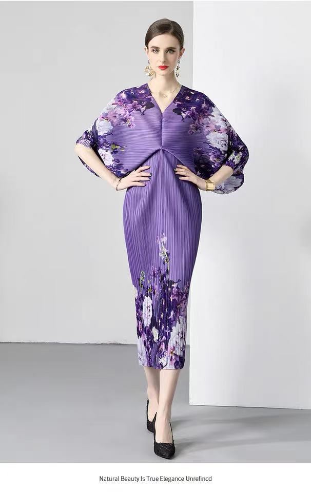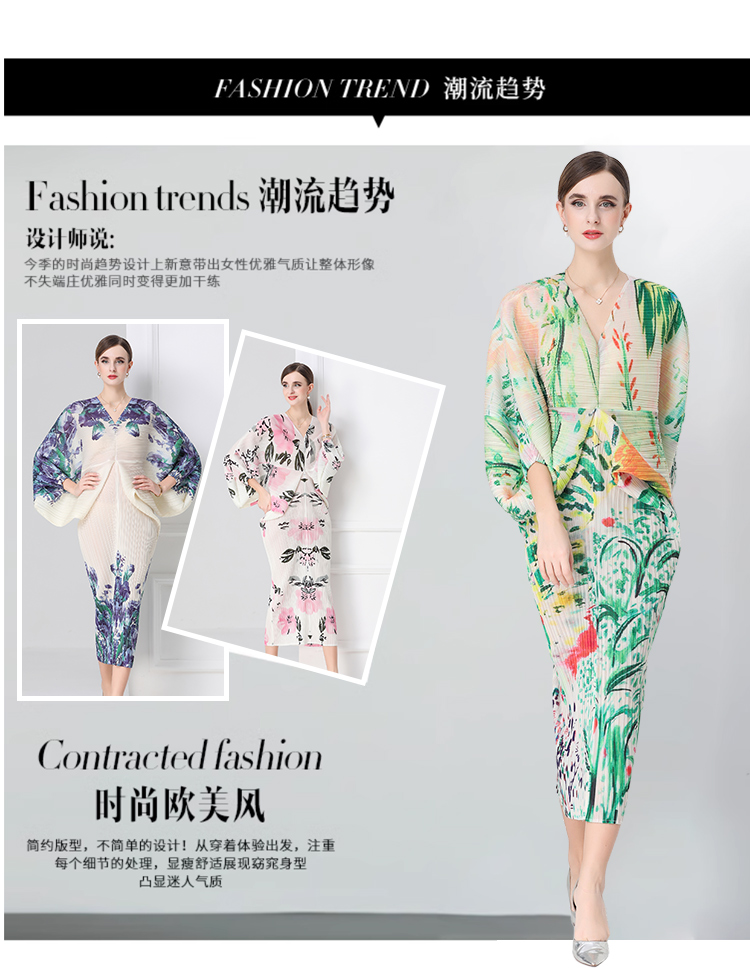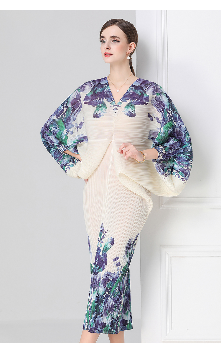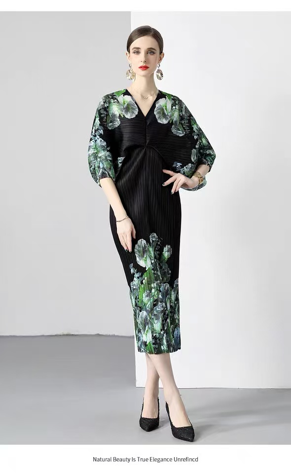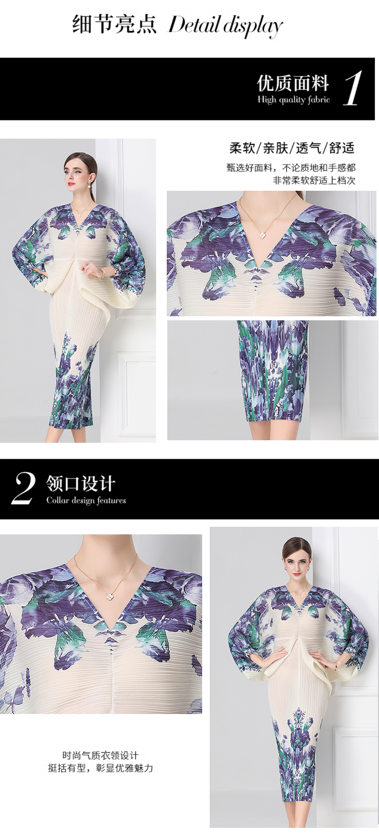 MY16722# 三宅褶皱2025设计感洋气大妈印花连衣裙女宽松蝙蝠袖显瘦长裙女裝貨源服裝批發