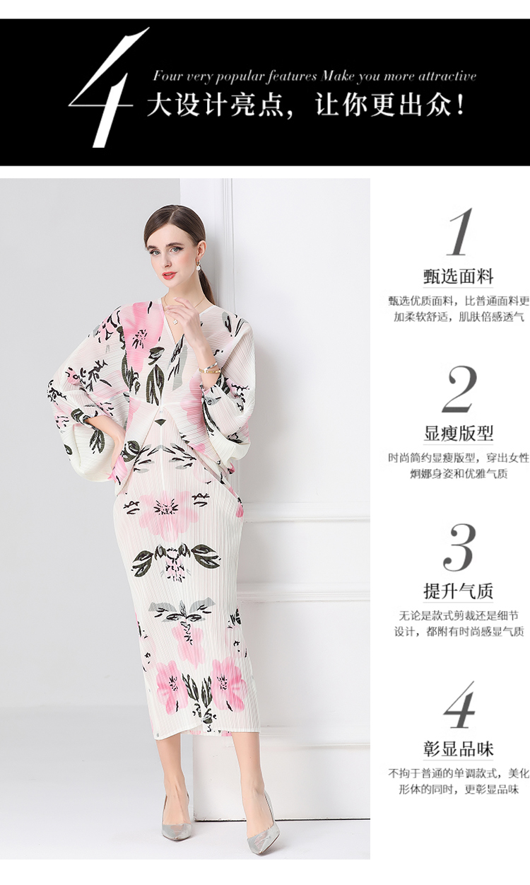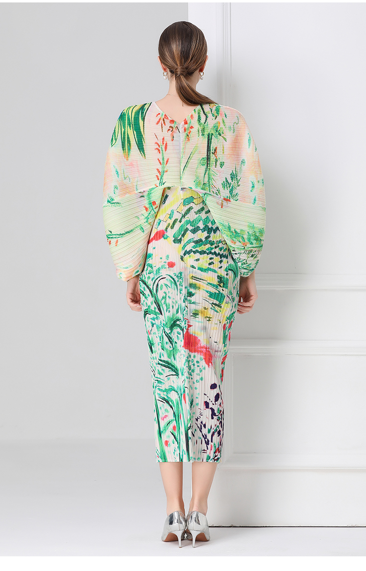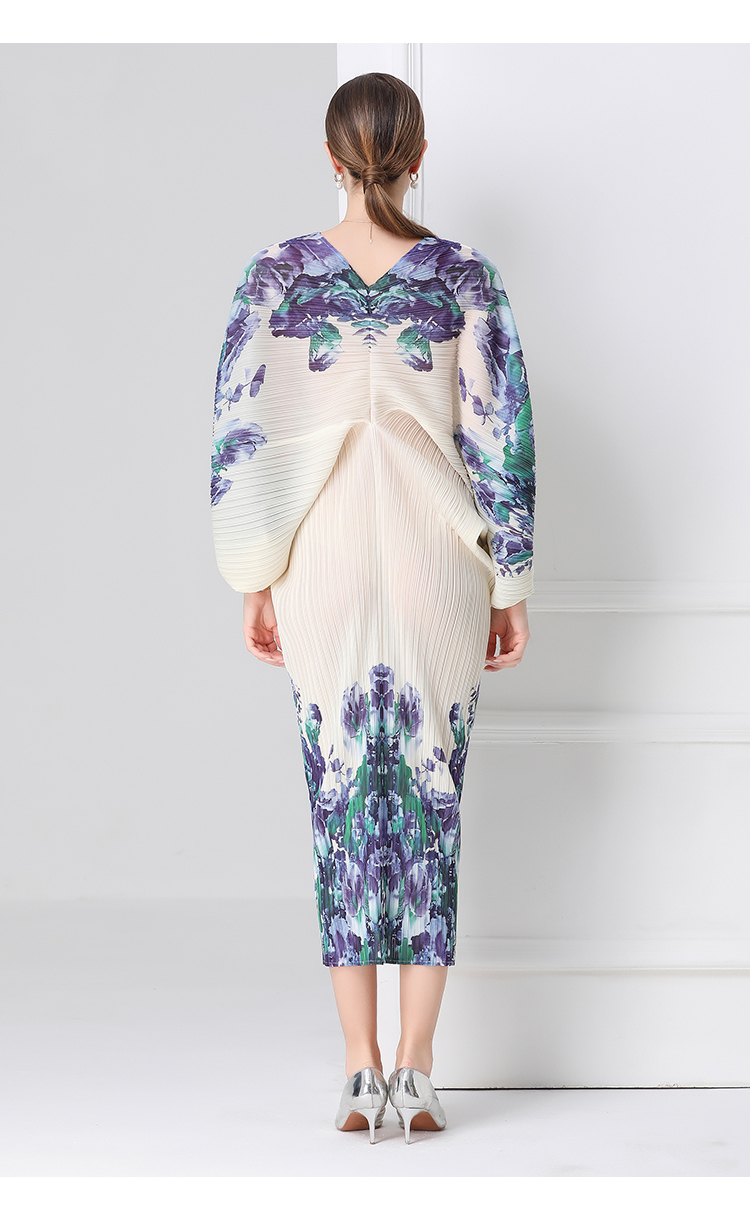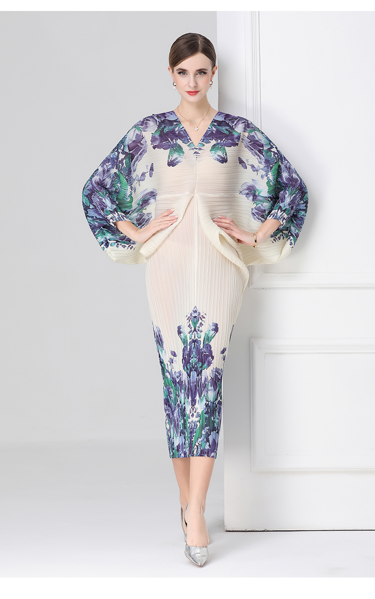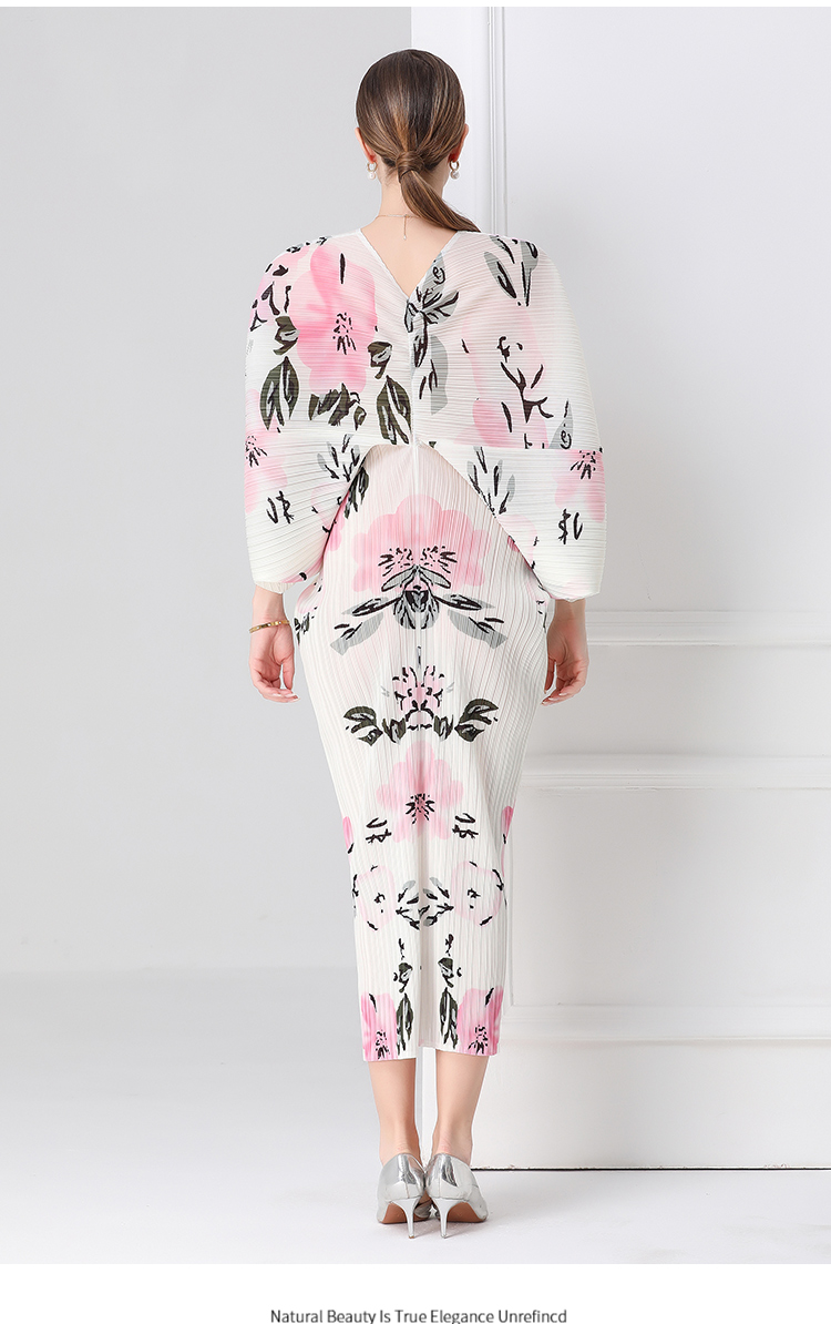MY16722# 三宅褶皱2025设计感洋气大妈印花连衣裙女宽松蝙蝠袖显瘦长裙女裝貨源服裝批發