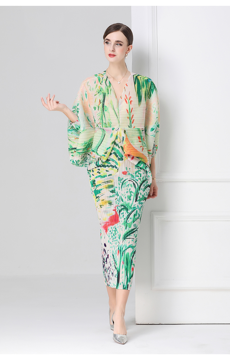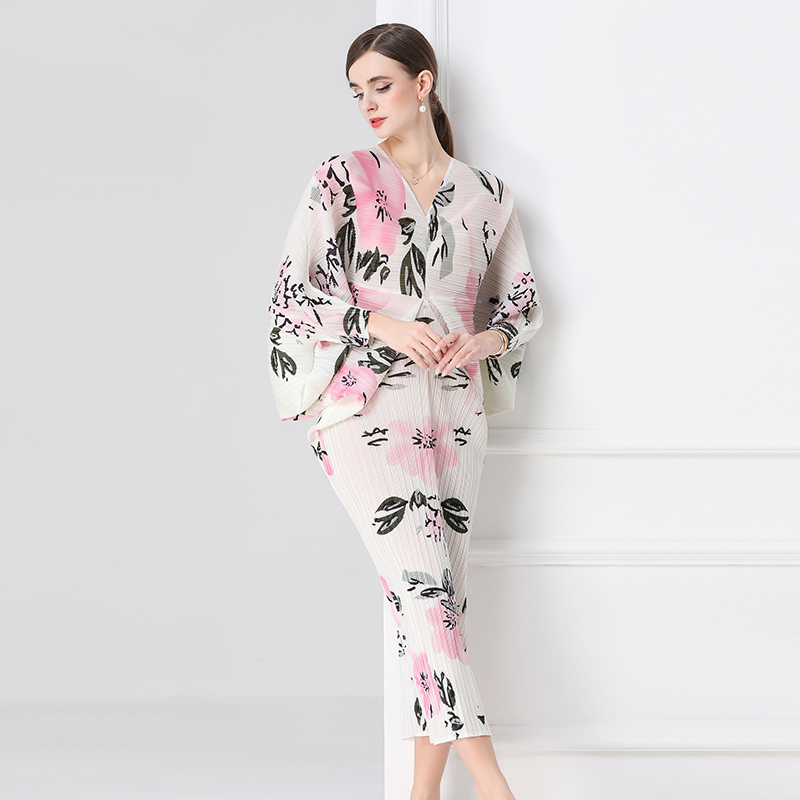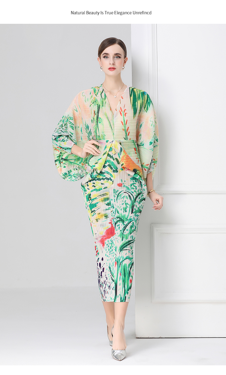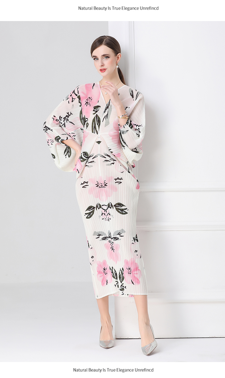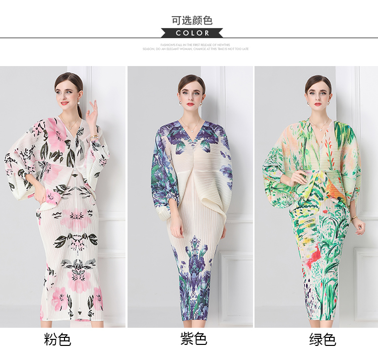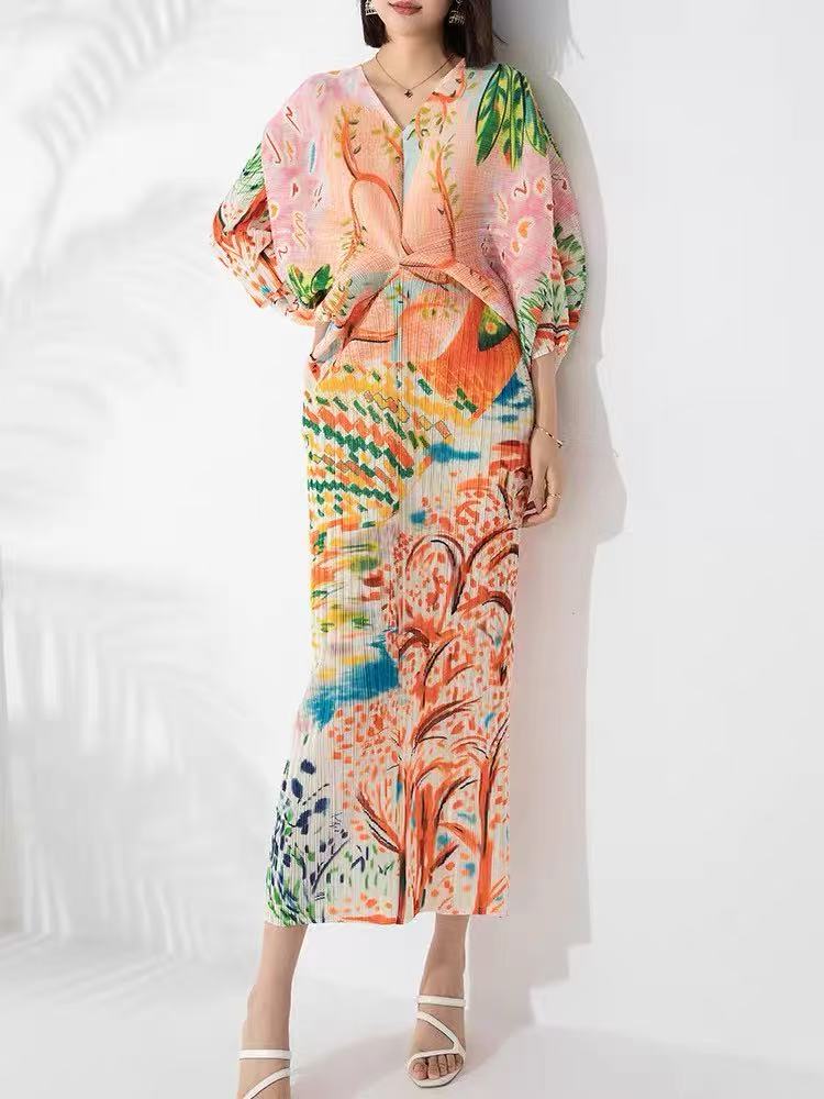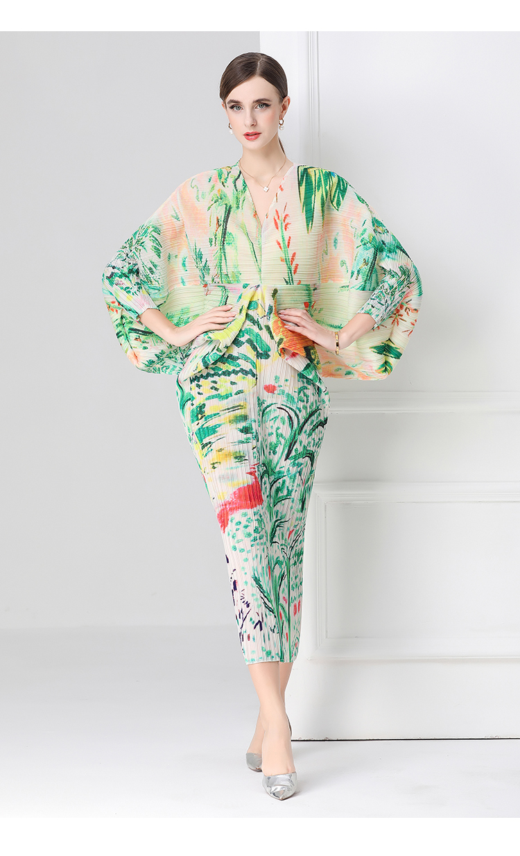MY16722# 三宅褶皱2025设计感洋气大妈印花连衣裙女宽松蝙蝠袖显瘦长裙女裝貨源服裝批發
