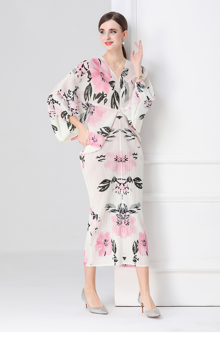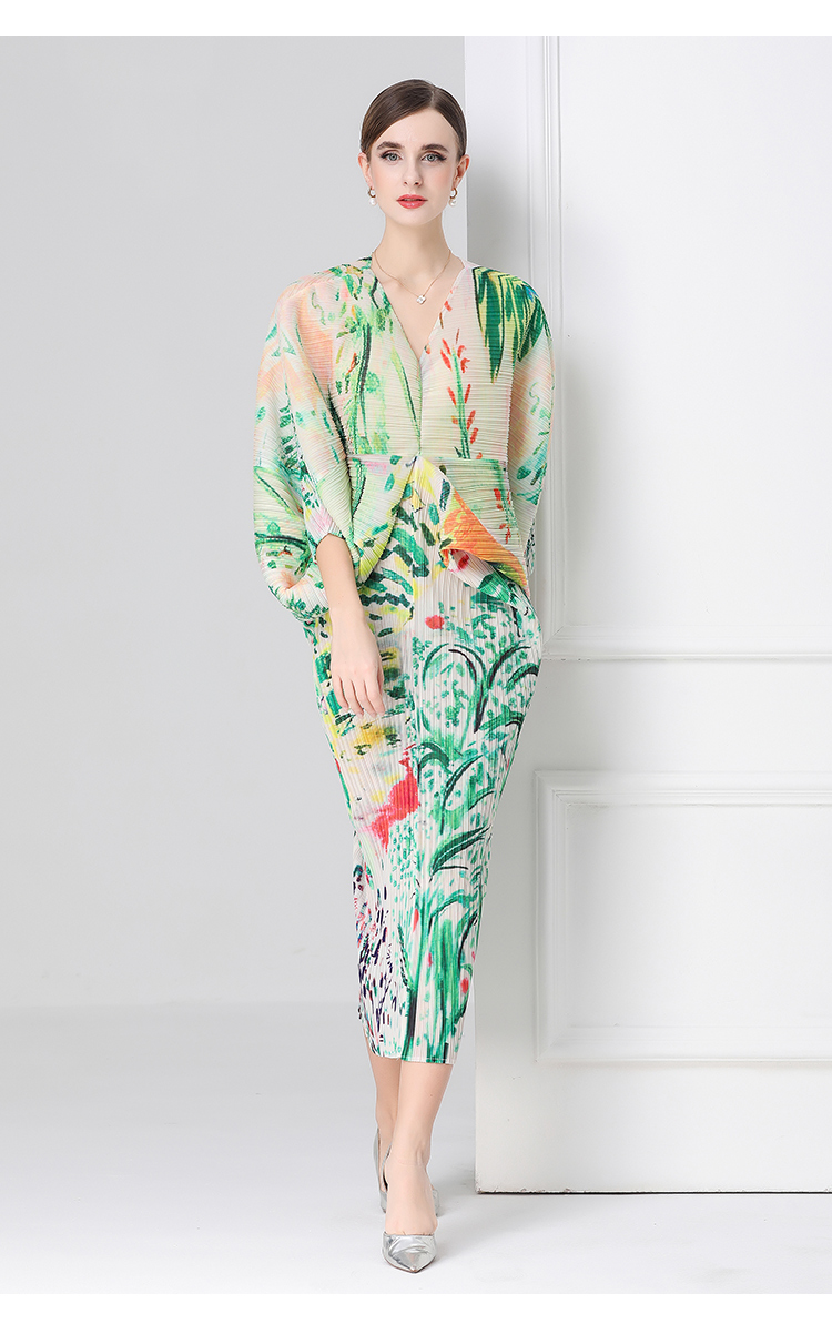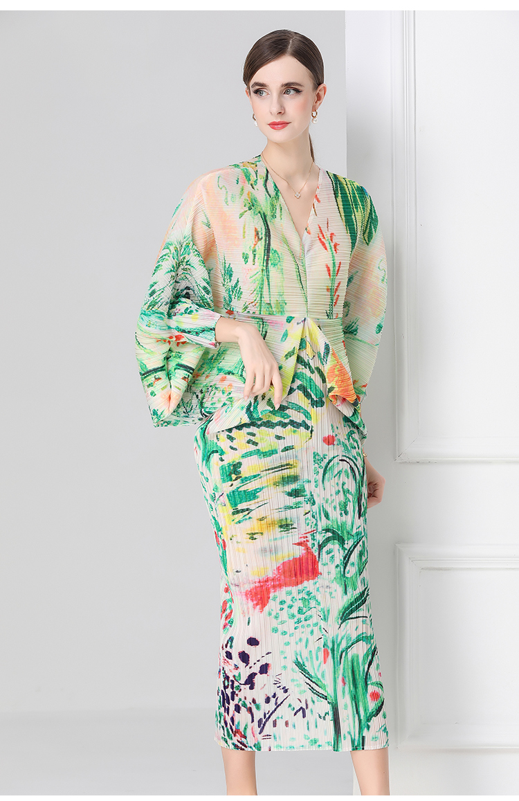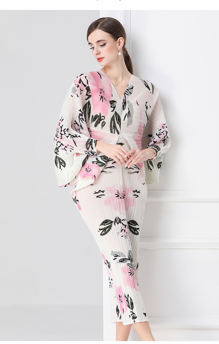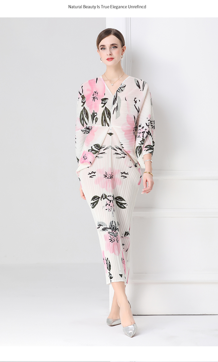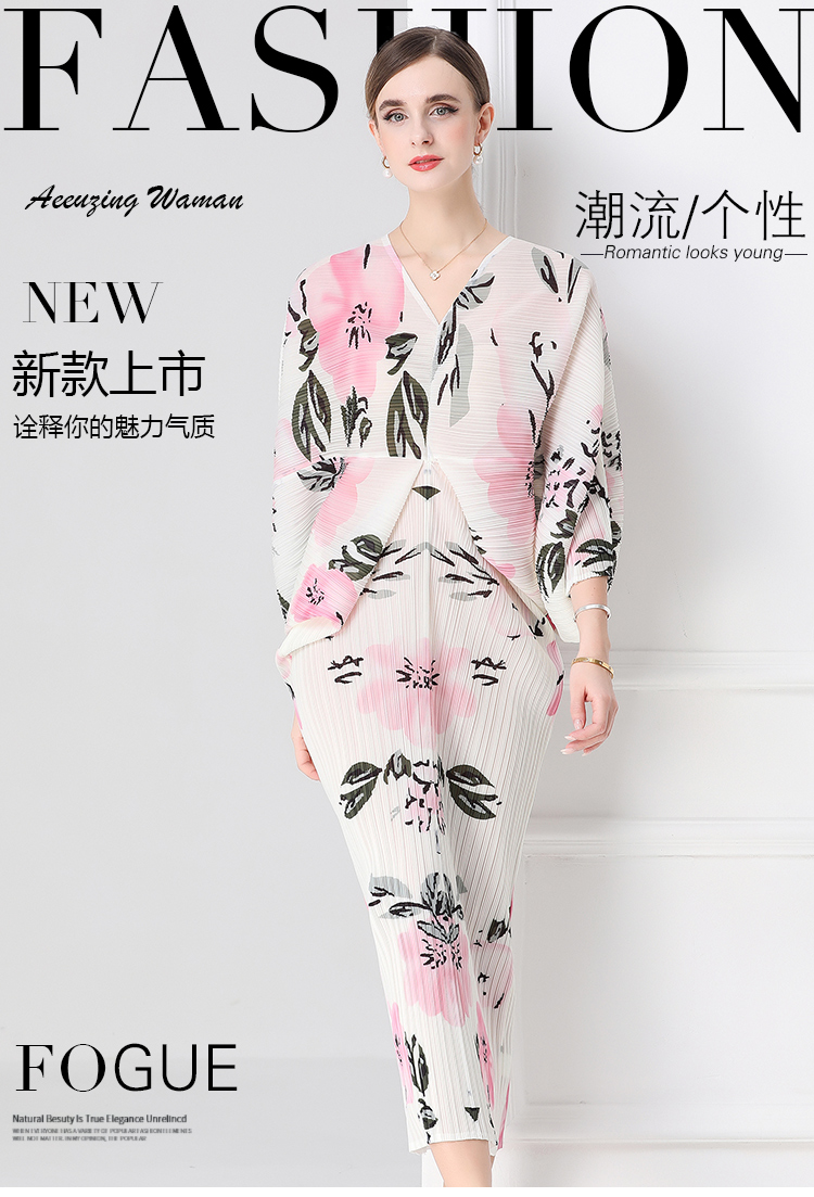 MY16722# 三宅褶皱2025设计感洋气大妈印花连衣裙女宽松蝙蝠袖显瘦长裙女裝貨源服裝批發