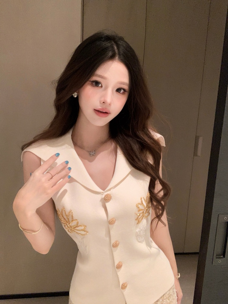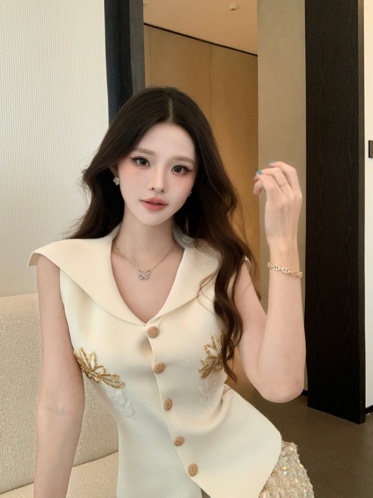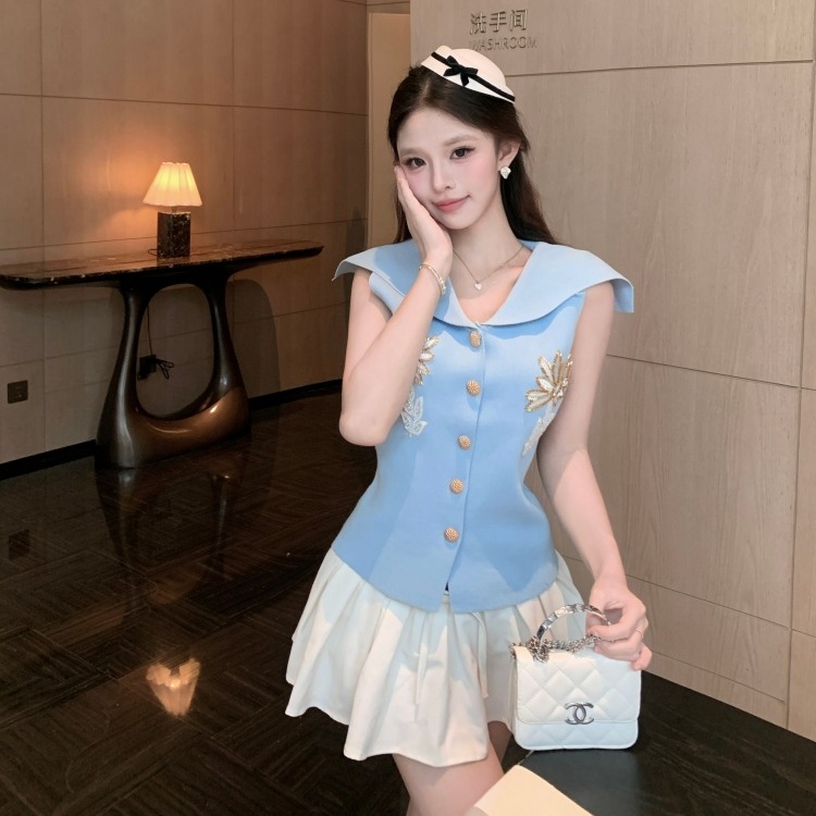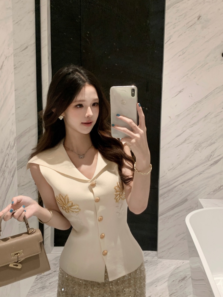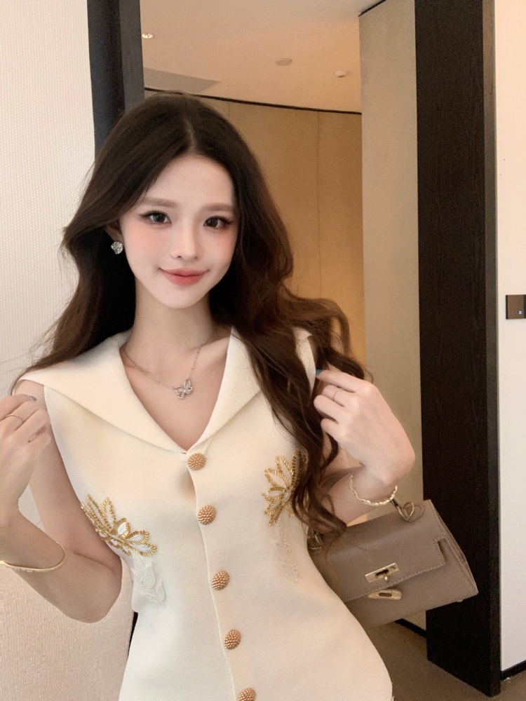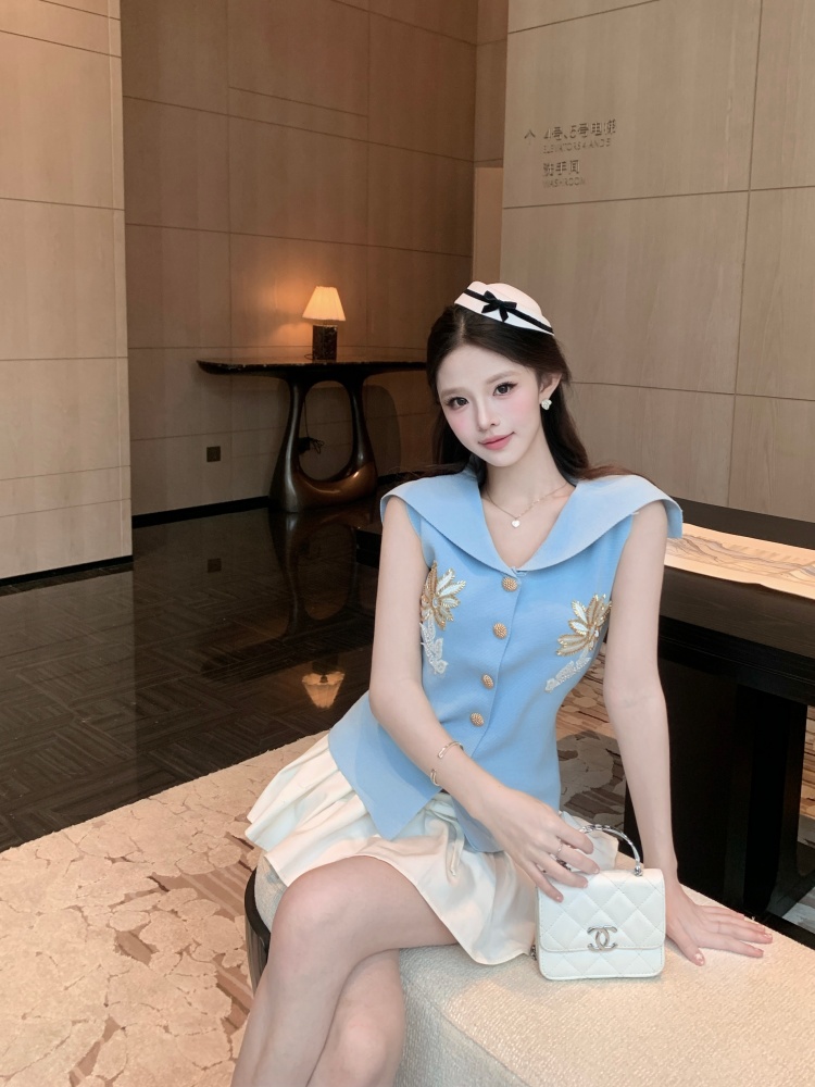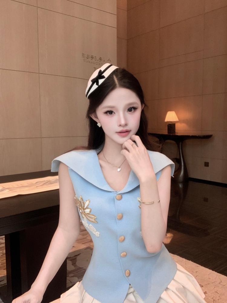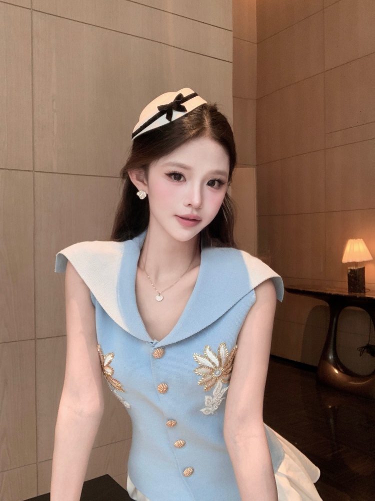 MY16730# 法式甜美海军风针织背心 刺绣花朵V领收腰小个子上衣女女裝貨源服裝批發