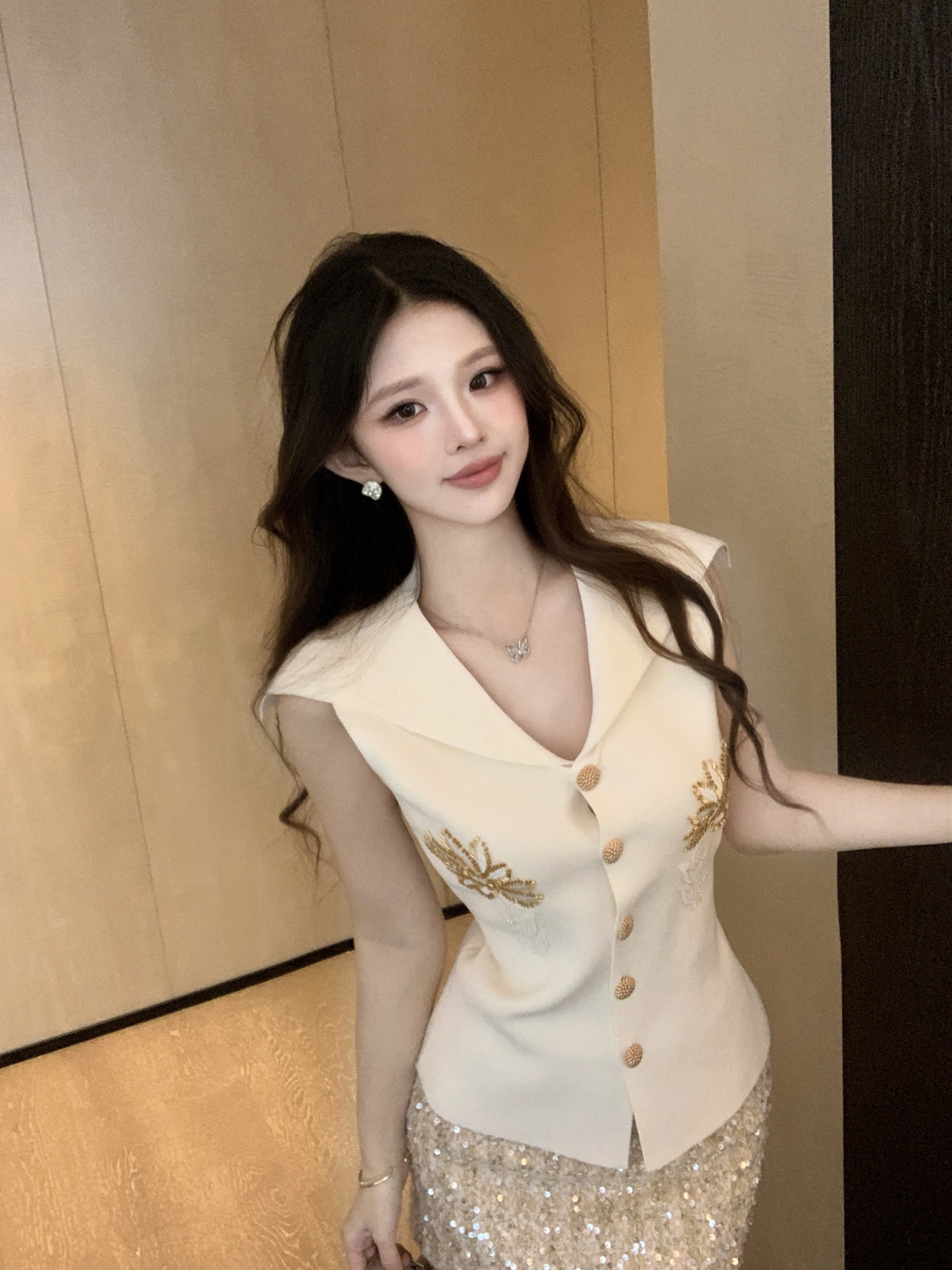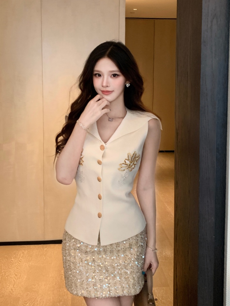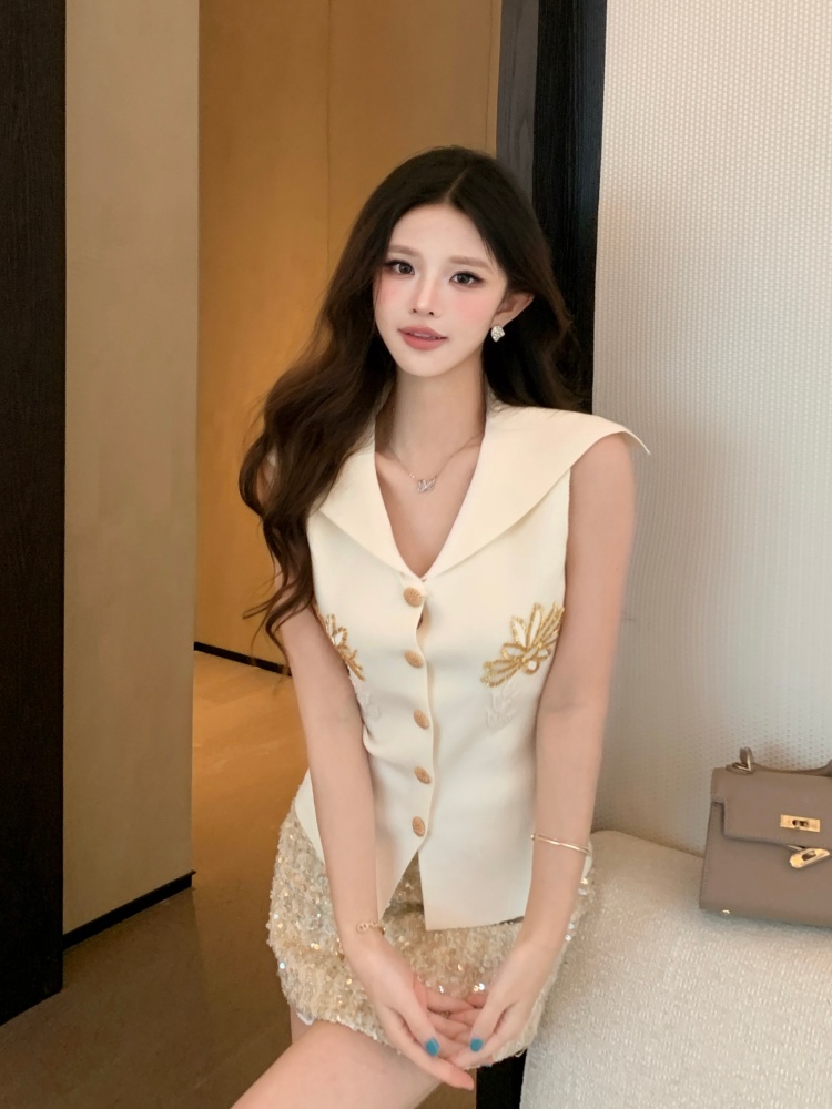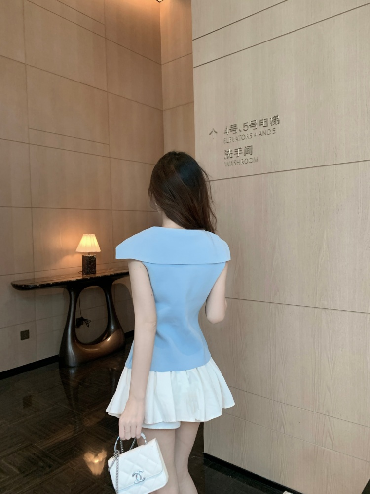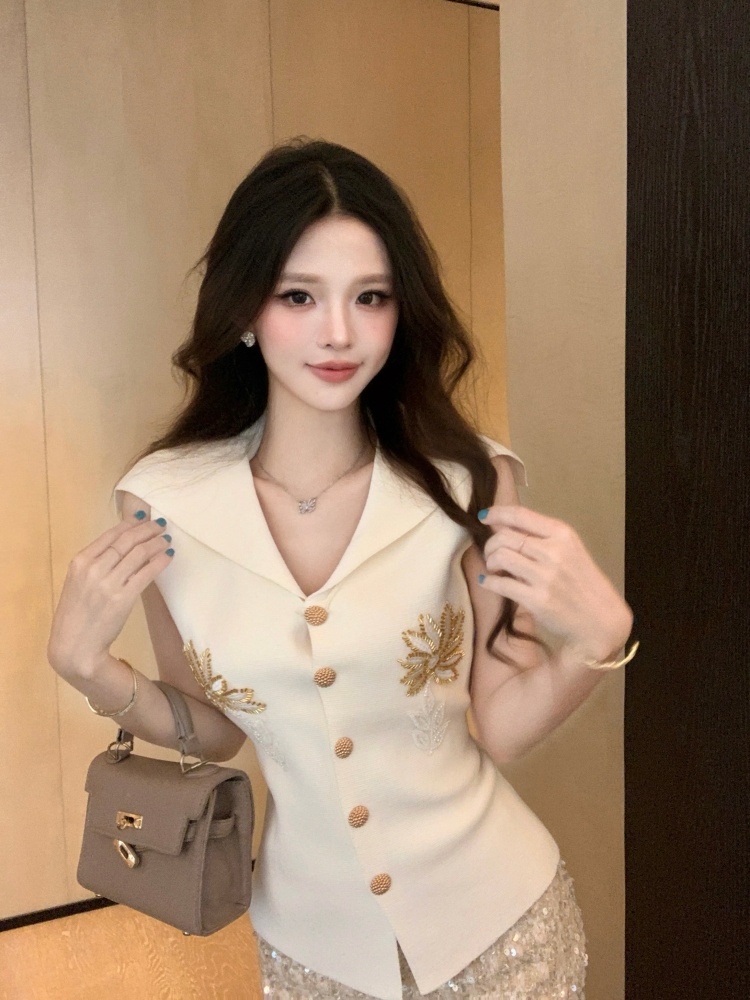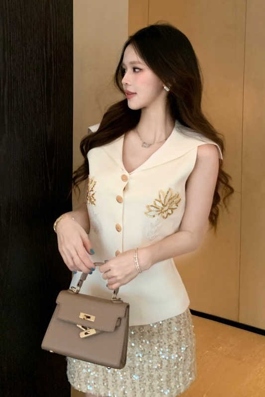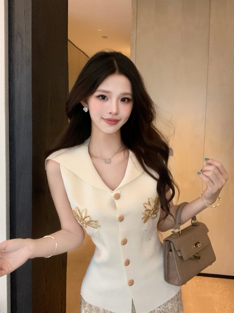 MY16730# 法式甜美海军风针织背心 刺绣花朵V领收腰小个子上衣女女裝貨源服裝批發