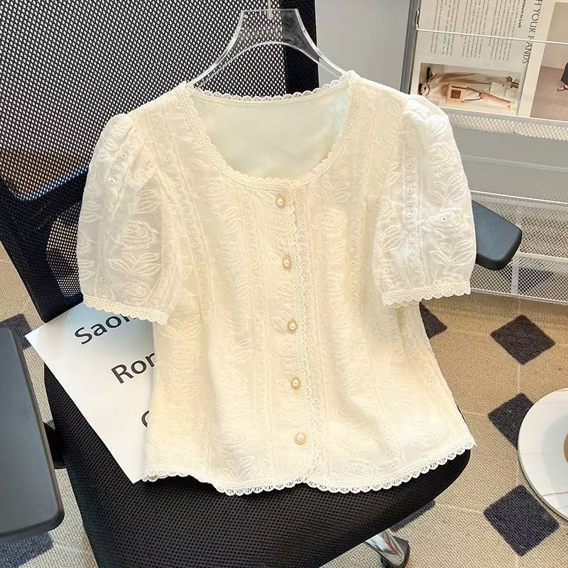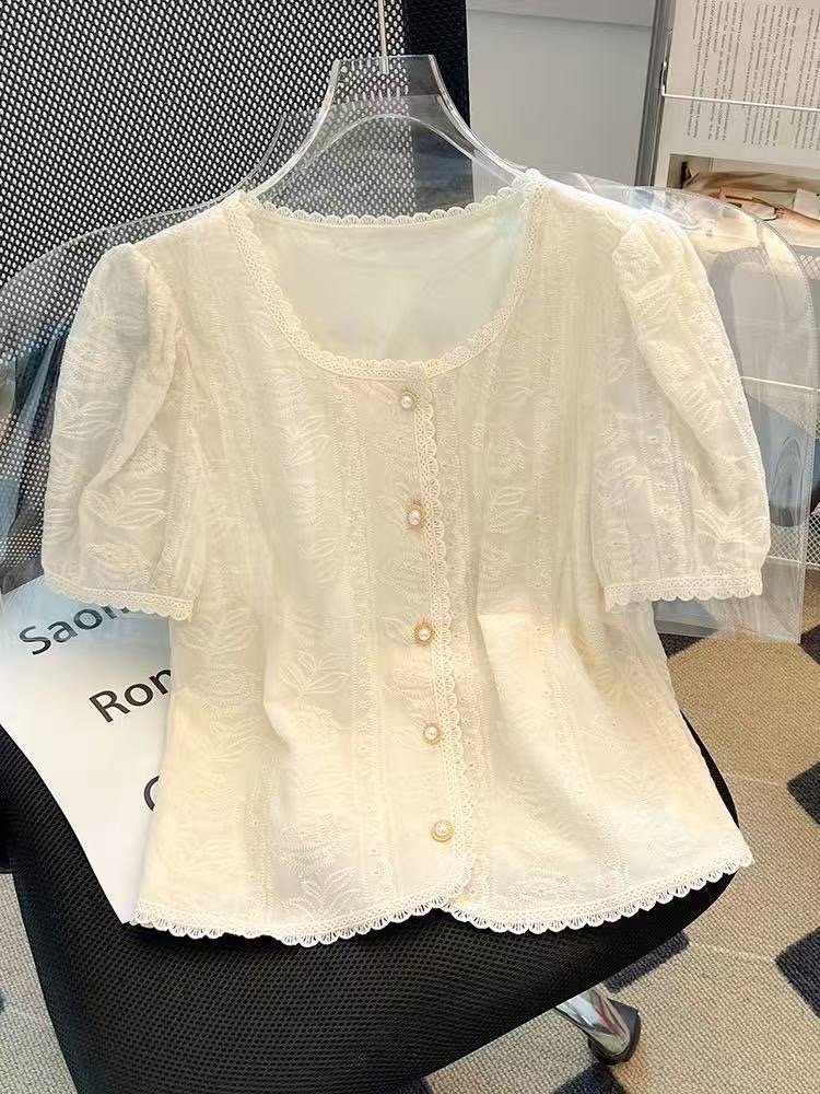 MY16818# 方领刺绣蕾丝衬衫短袖欧货减龄洋气法式小衫短款泡泡袖上衣女裝貨源服裝批發