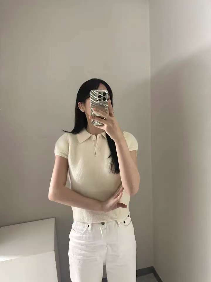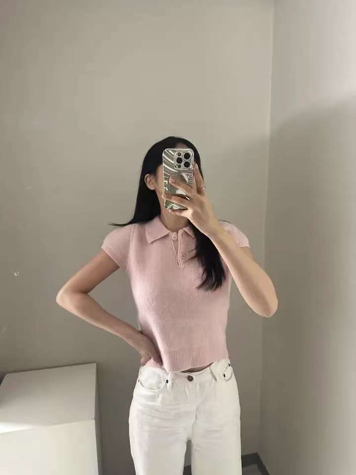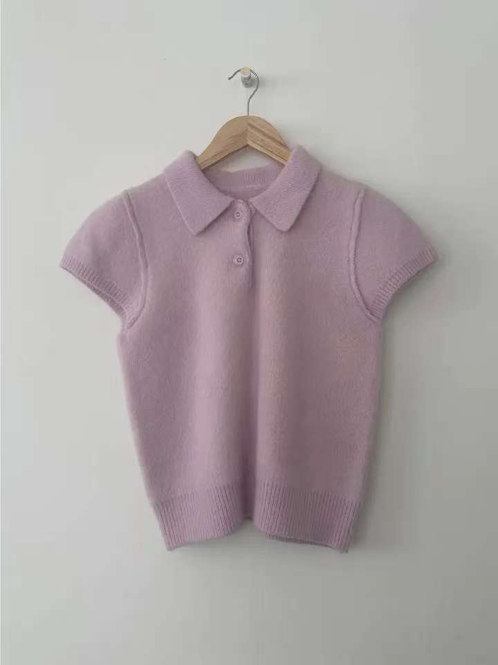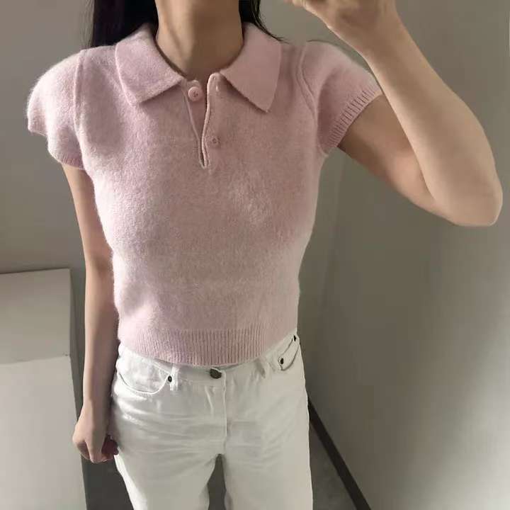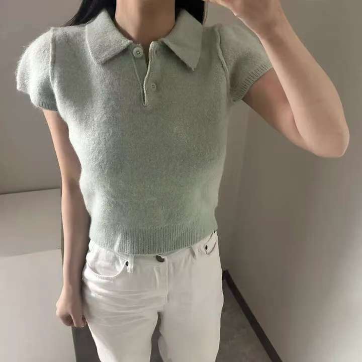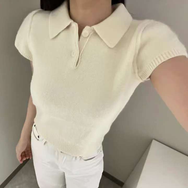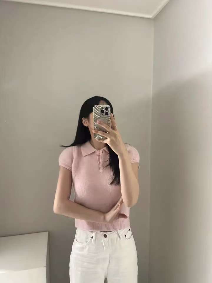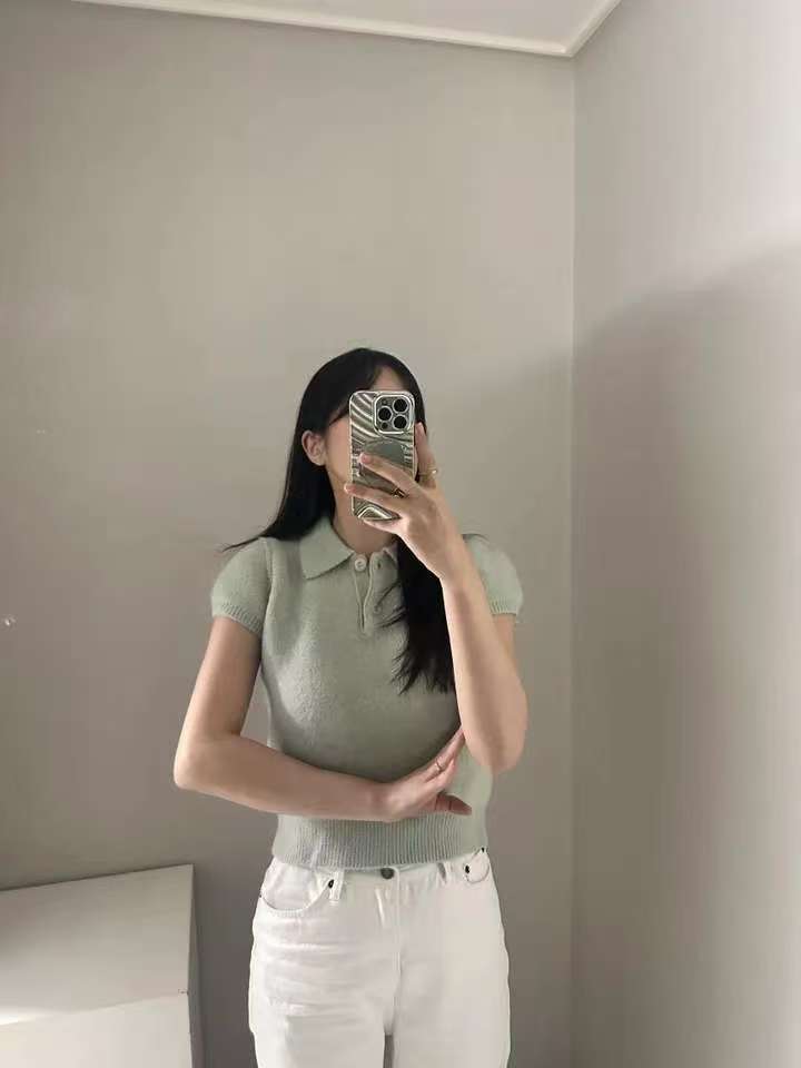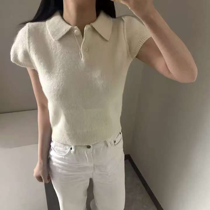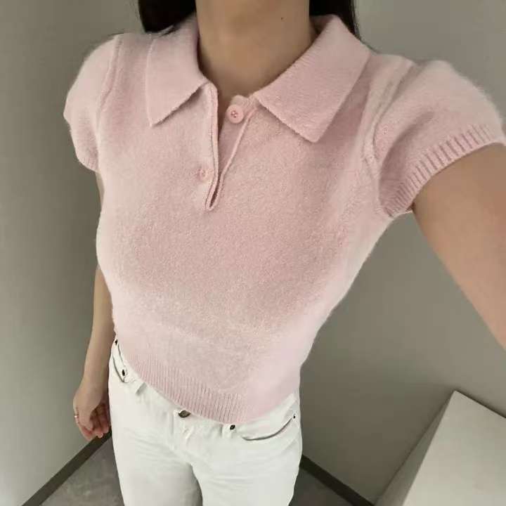 MY16819# 韩国ins 甜美气质POLO领休闲纯色短袖软糯针织上衣女裝貨源服裝批發