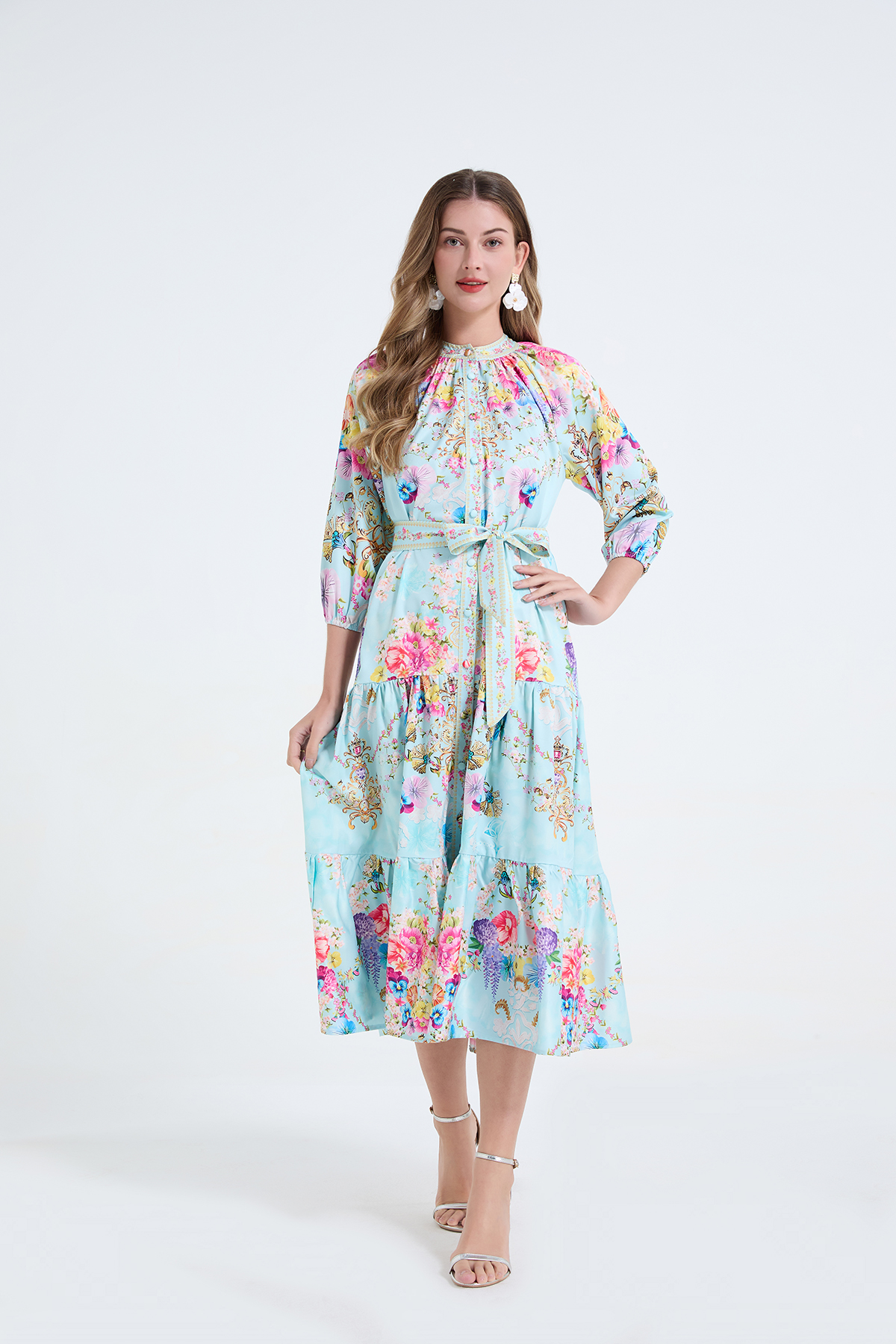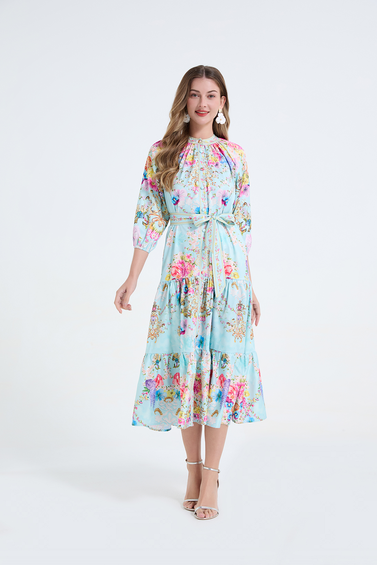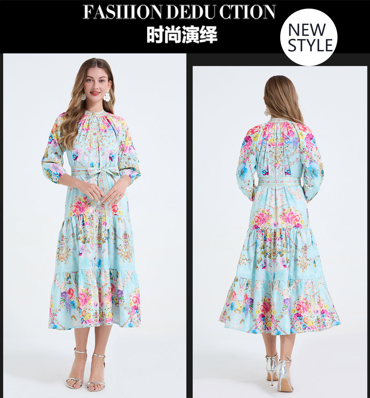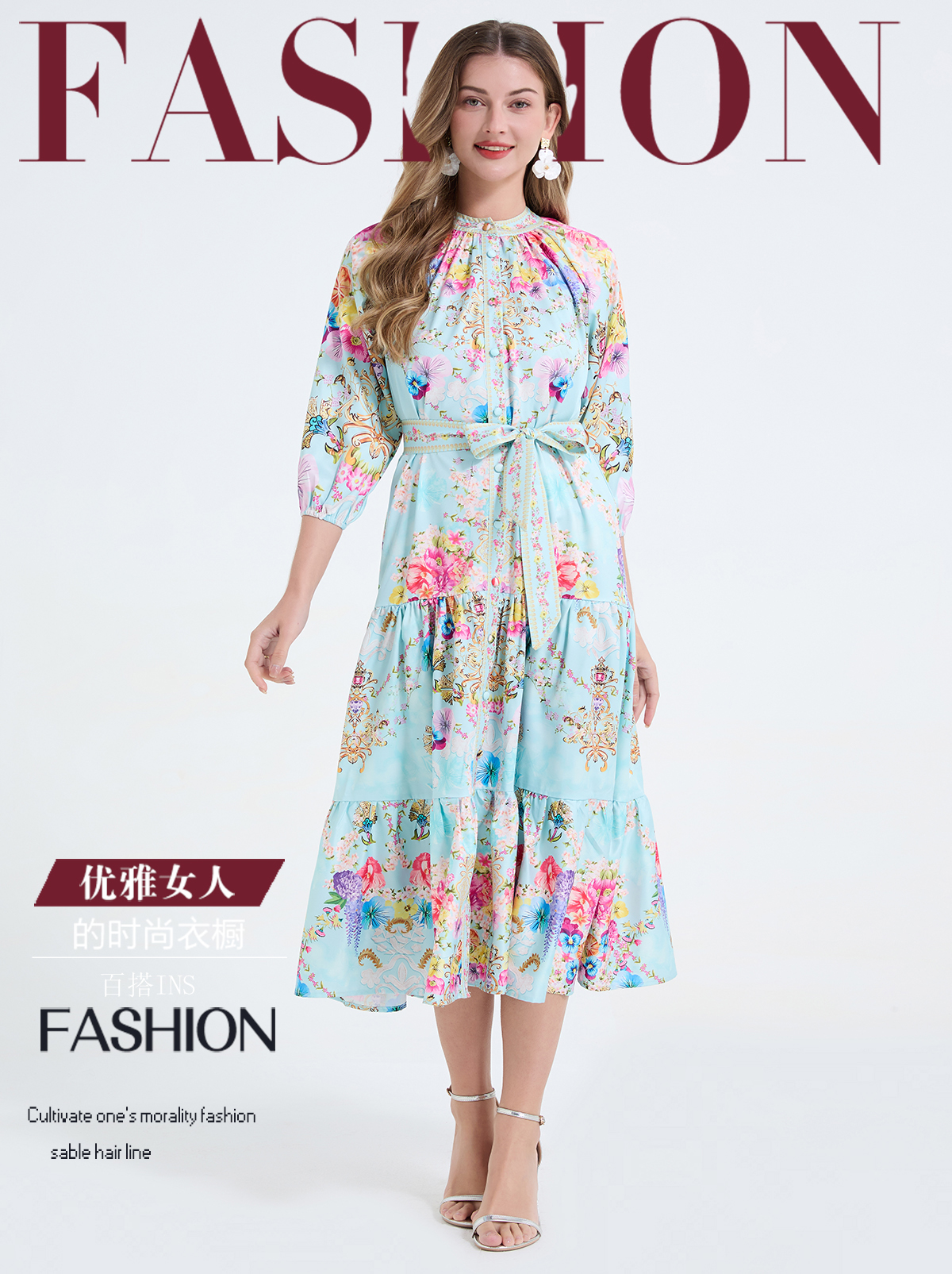 MY17625# 欧美定位印花立领系带收腰连衣裙 三层大摆长裙女裝貨源服裝批發