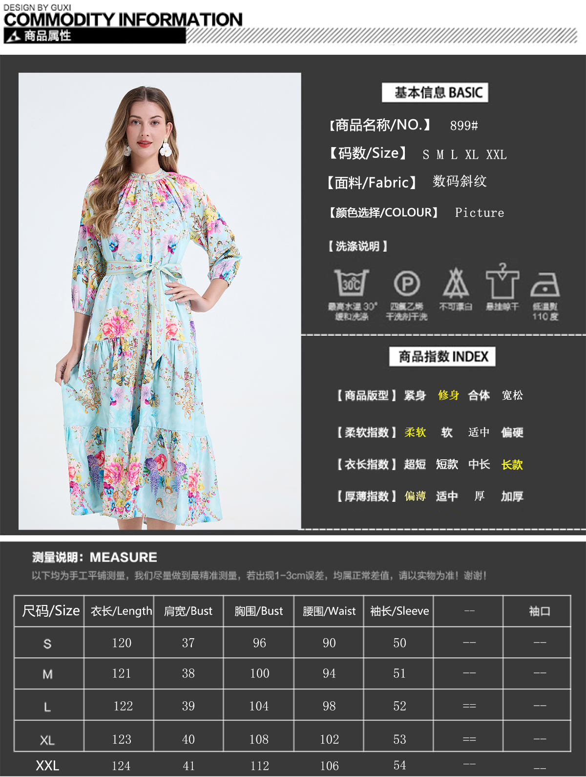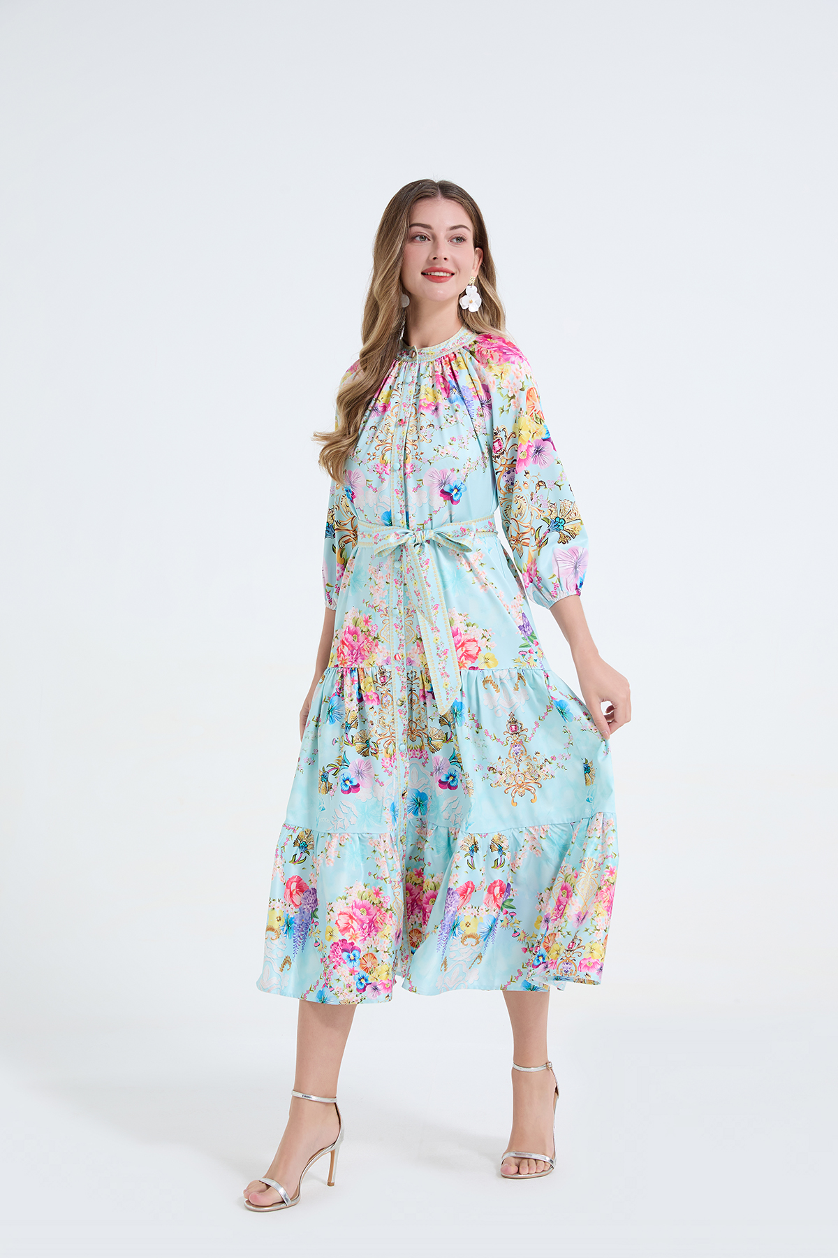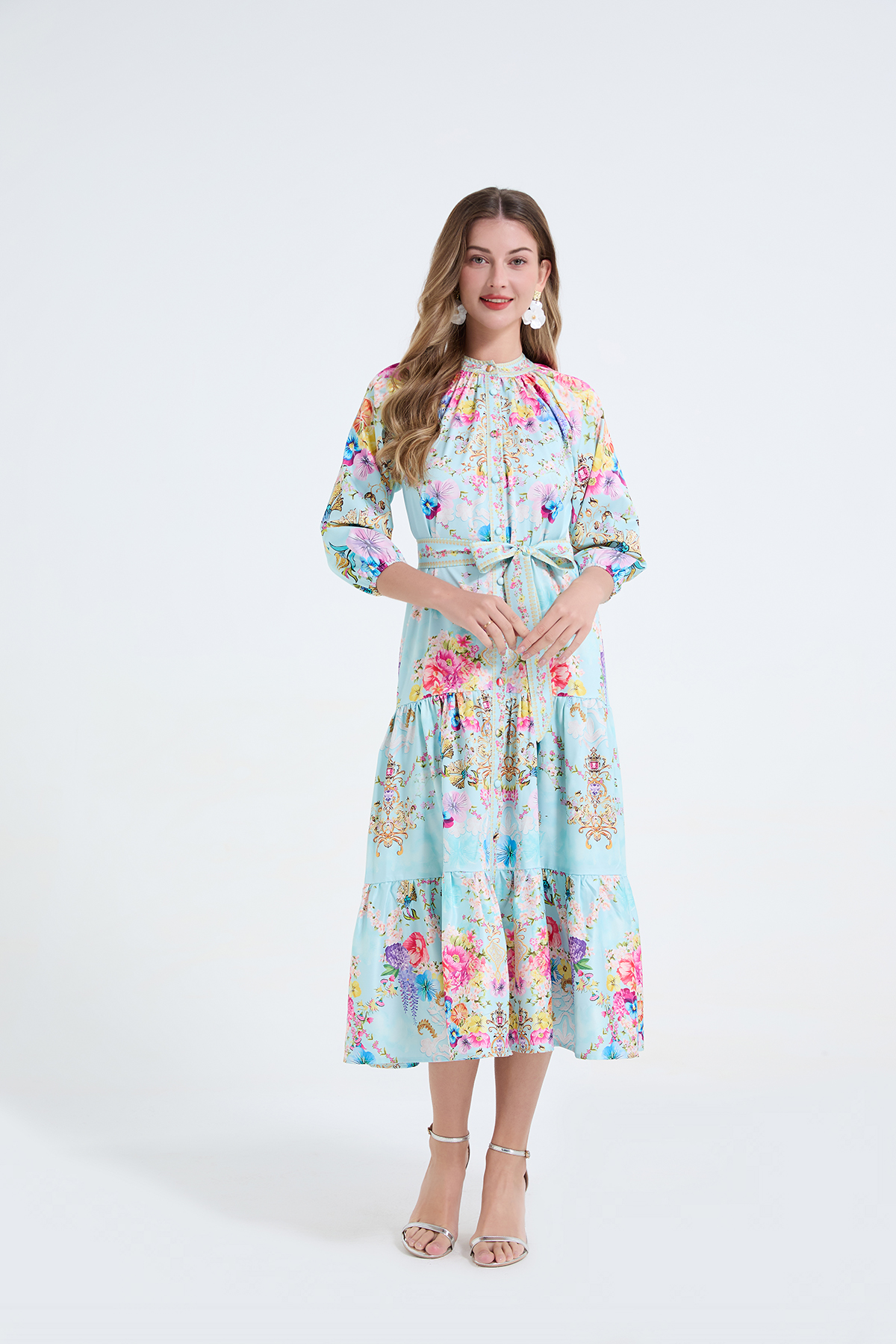 MY17625# 欧美定位印花立领系带收腰连衣裙 三层大摆长裙女裝貨源服裝批發