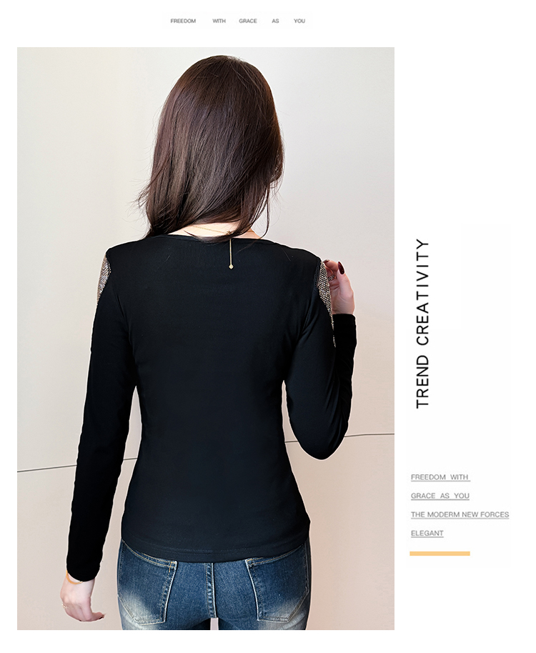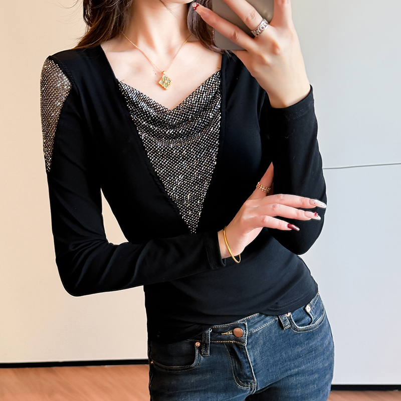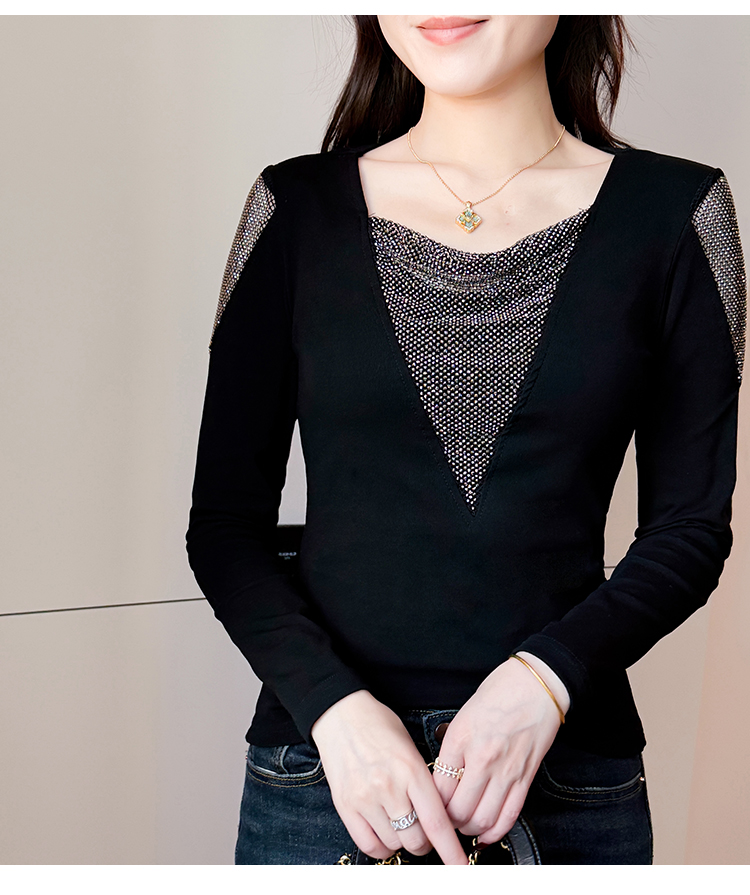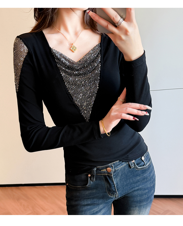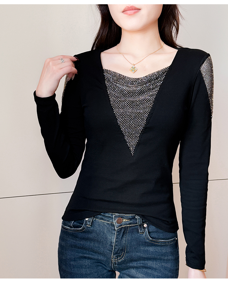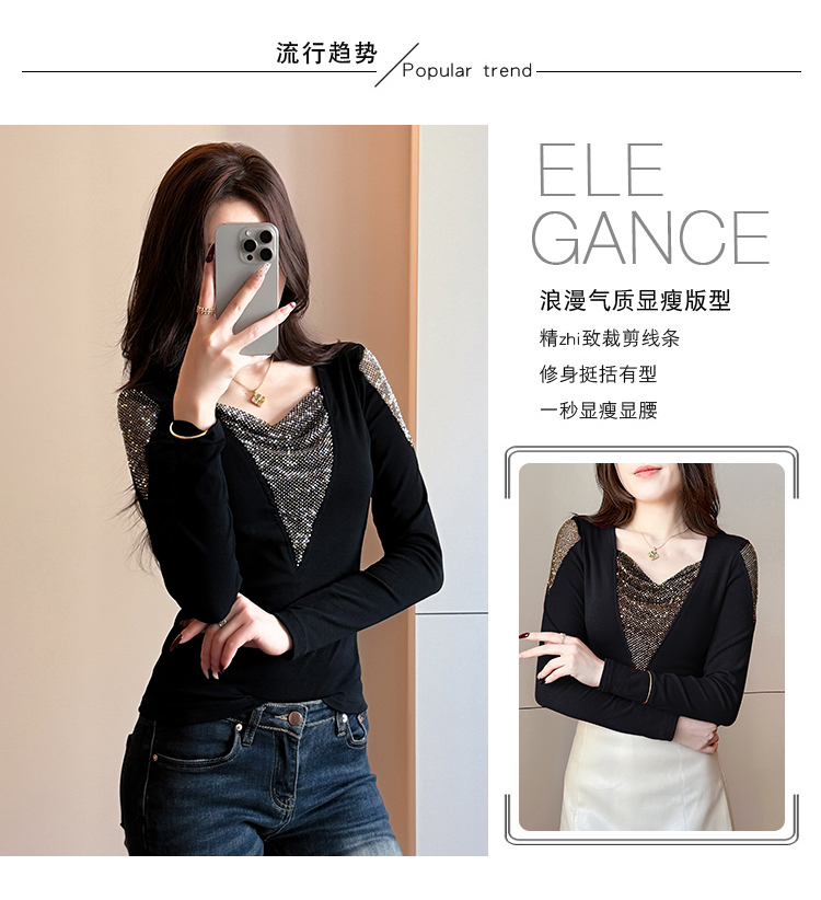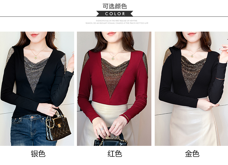 MY17631# 时尚高级感V领烫钻修身显瘦打底衫拼接洋气长袖女T恤女裝貨源服裝批發