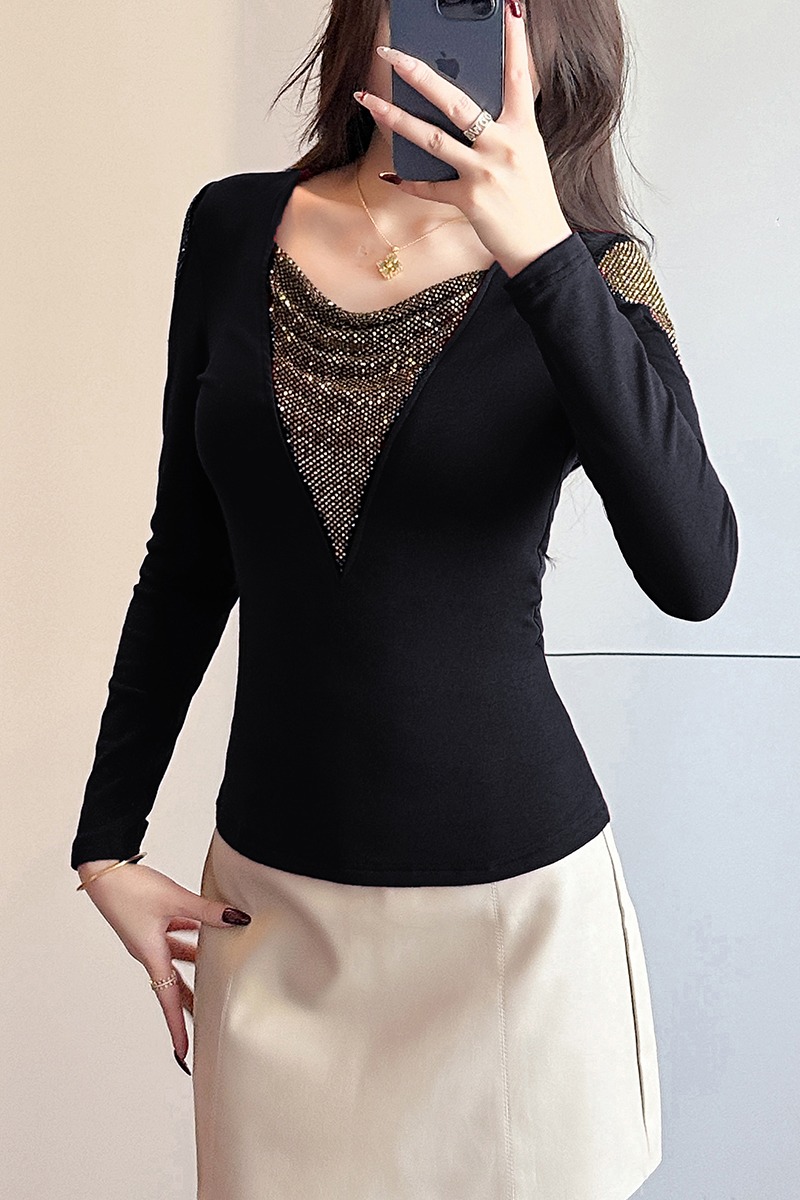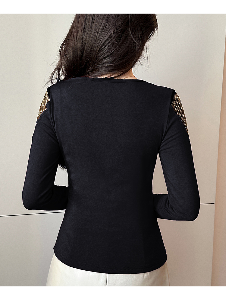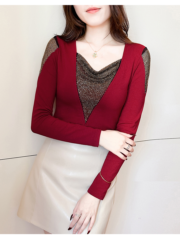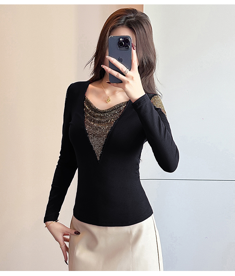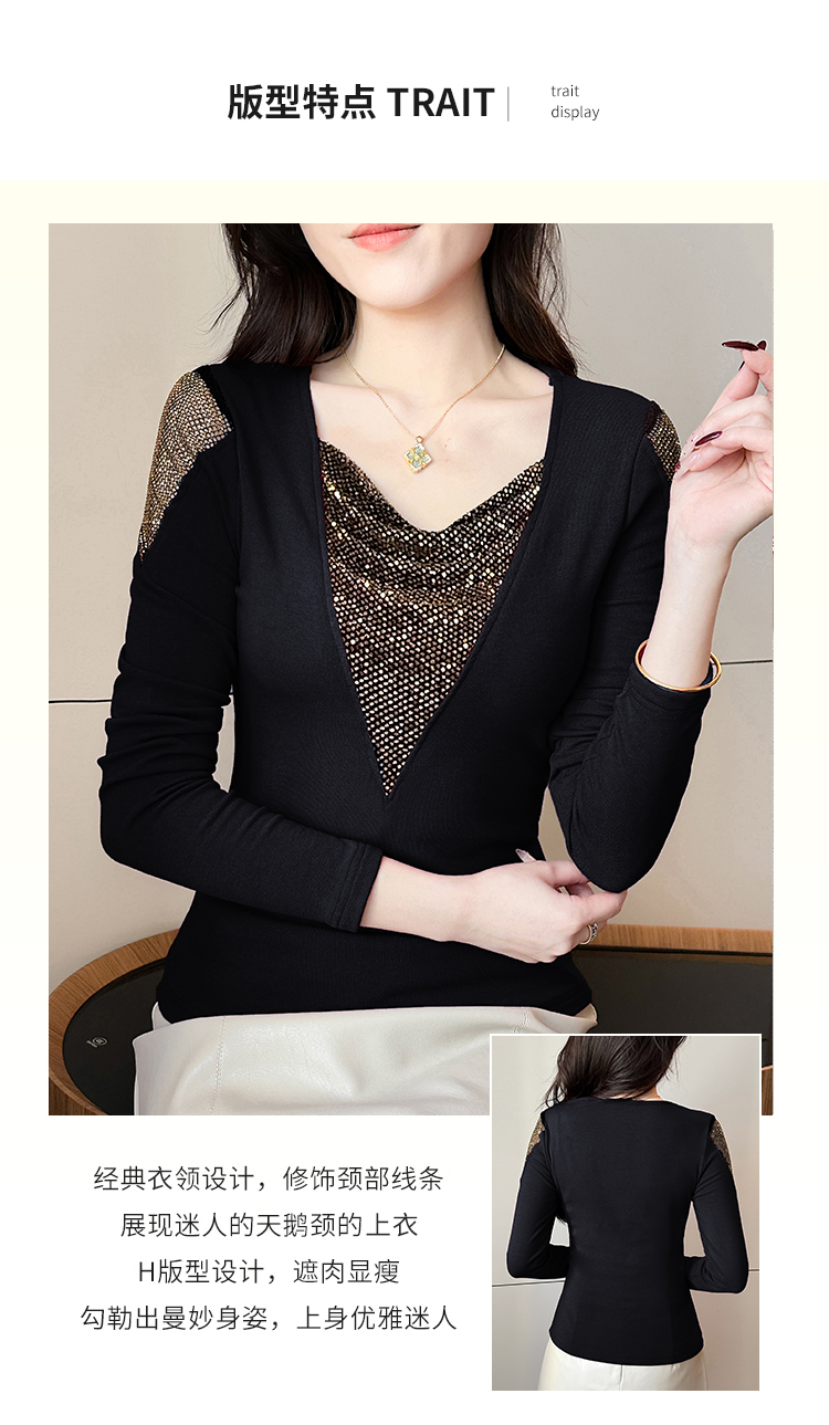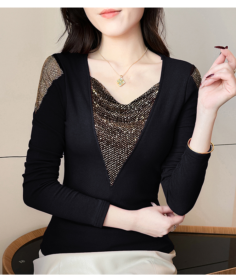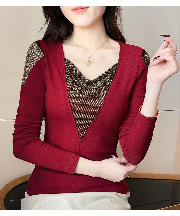 MY17631# 时尚高级感V领烫钻修身显瘦打底衫拼接洋气长袖女T恤女裝貨源服裝批發