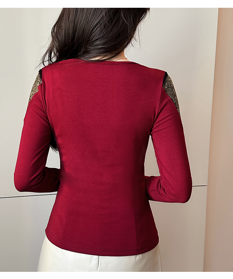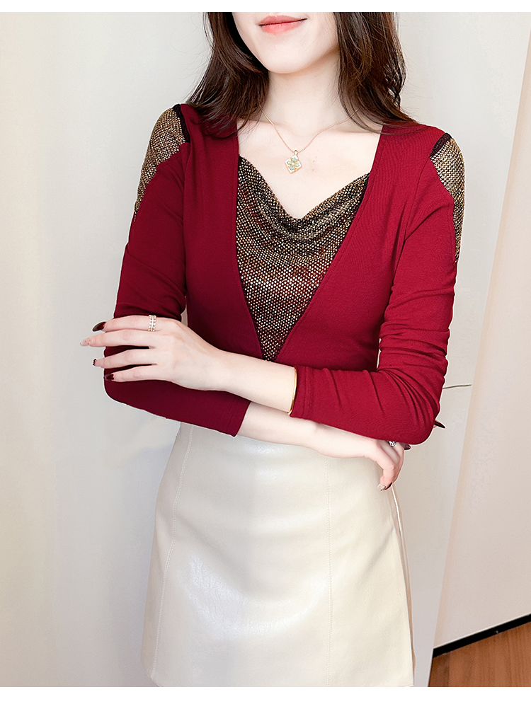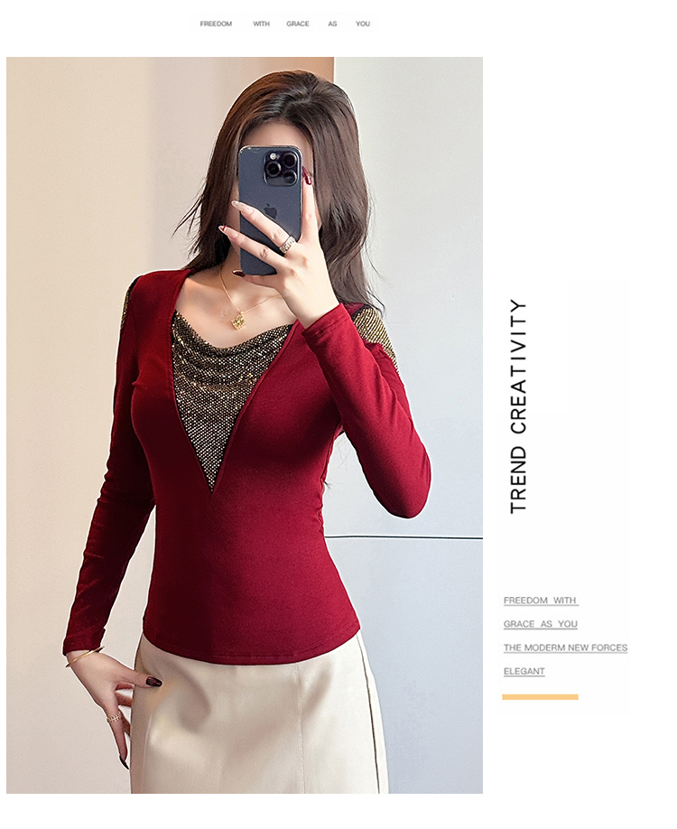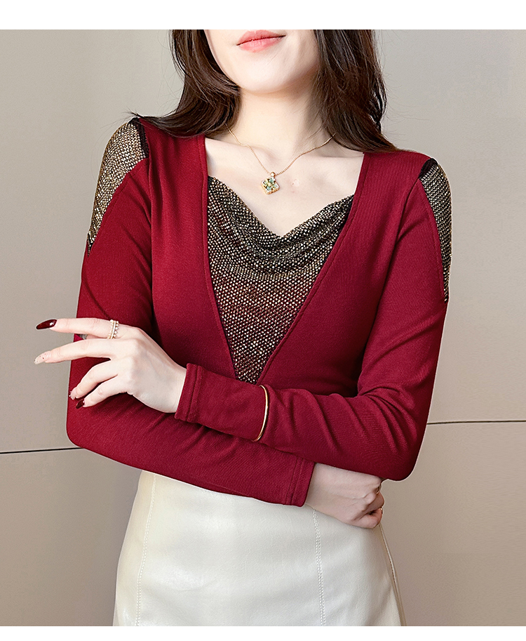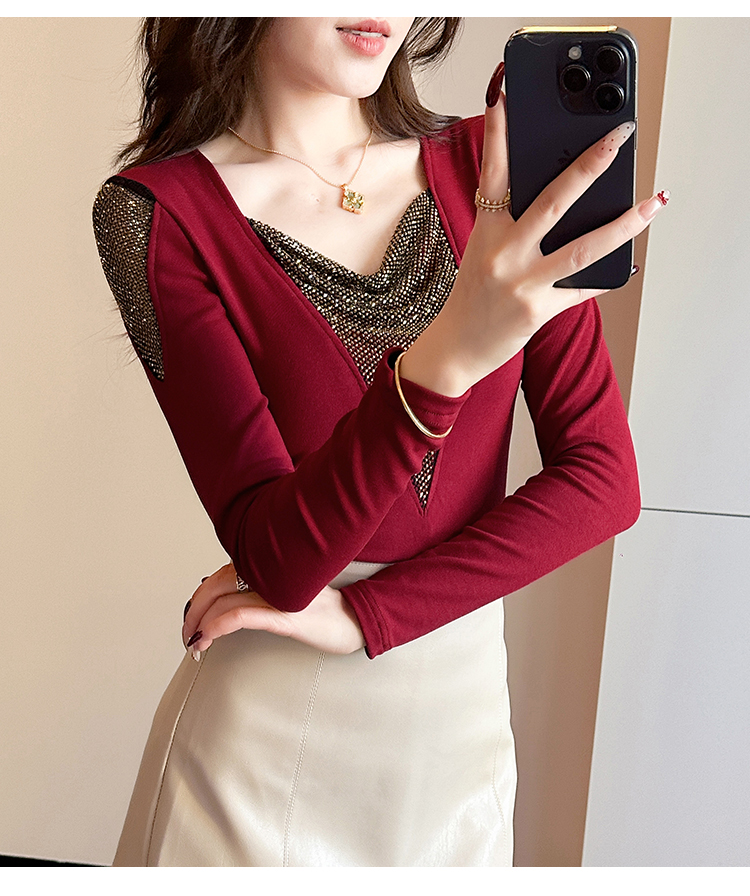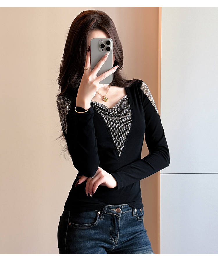 MY17631# 时尚高级感V领烫钻修身显瘦打底衫拼接洋气长袖女T恤女裝貨源服裝批發