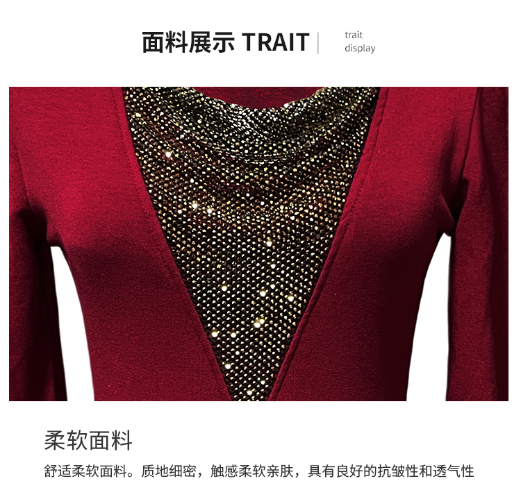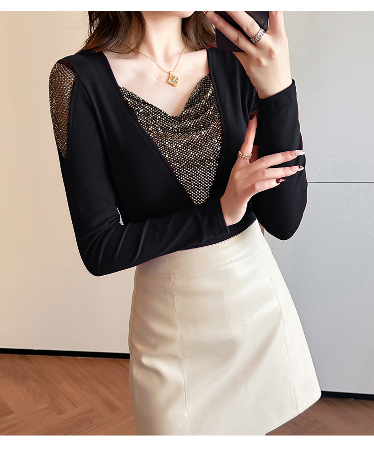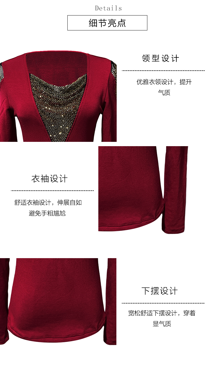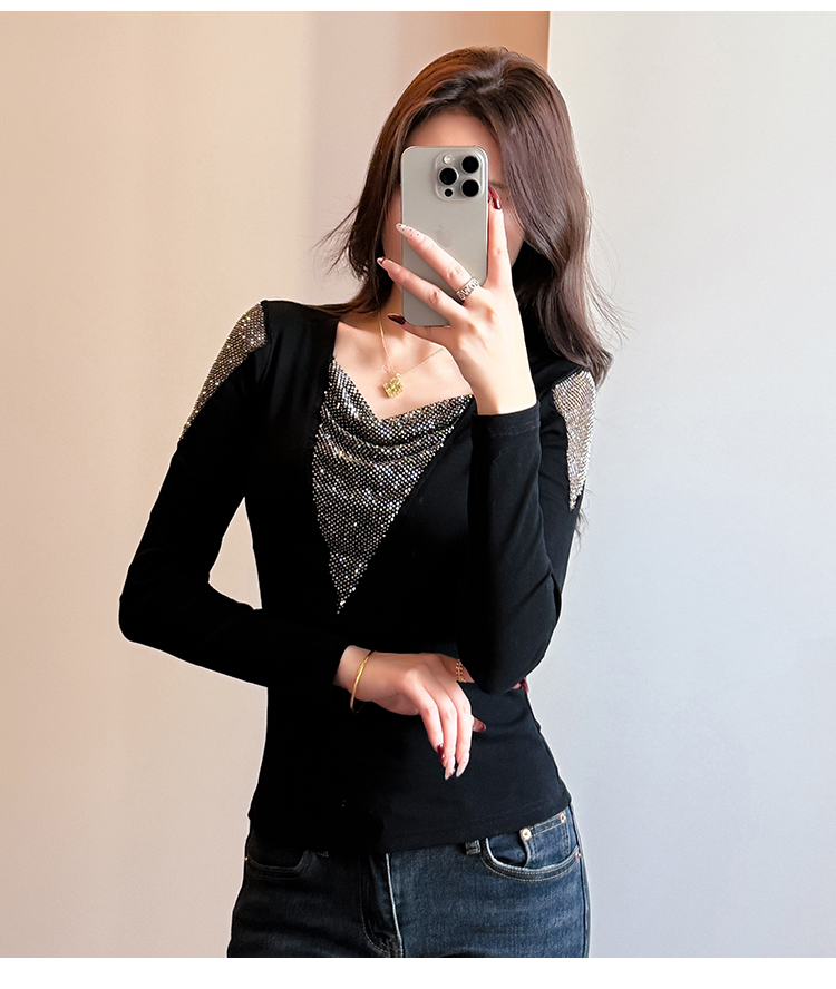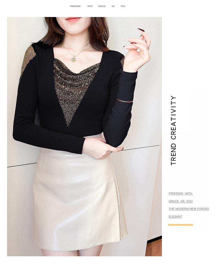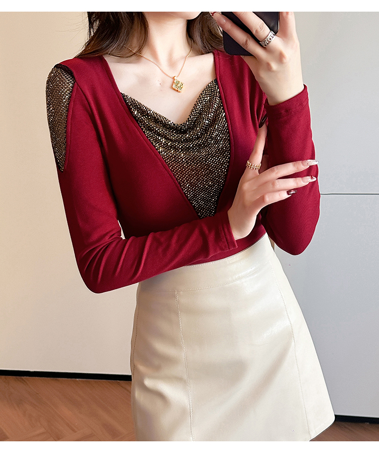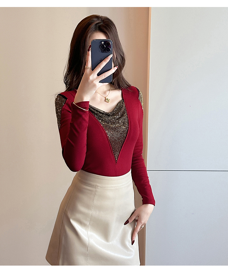 MY17631# 时尚高级感V领烫钻修身显瘦打底衫拼接洋气长袖女T恤女裝貨源服裝批發