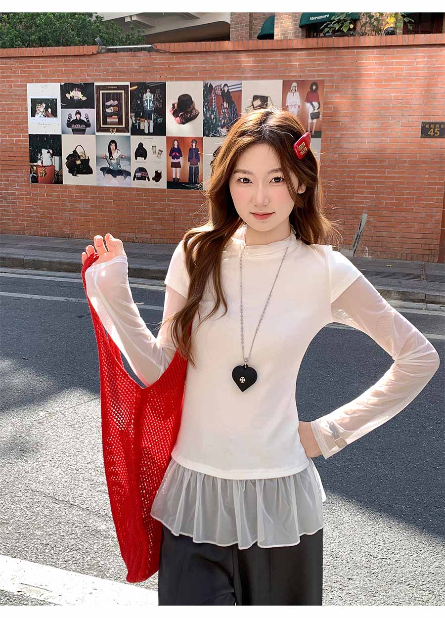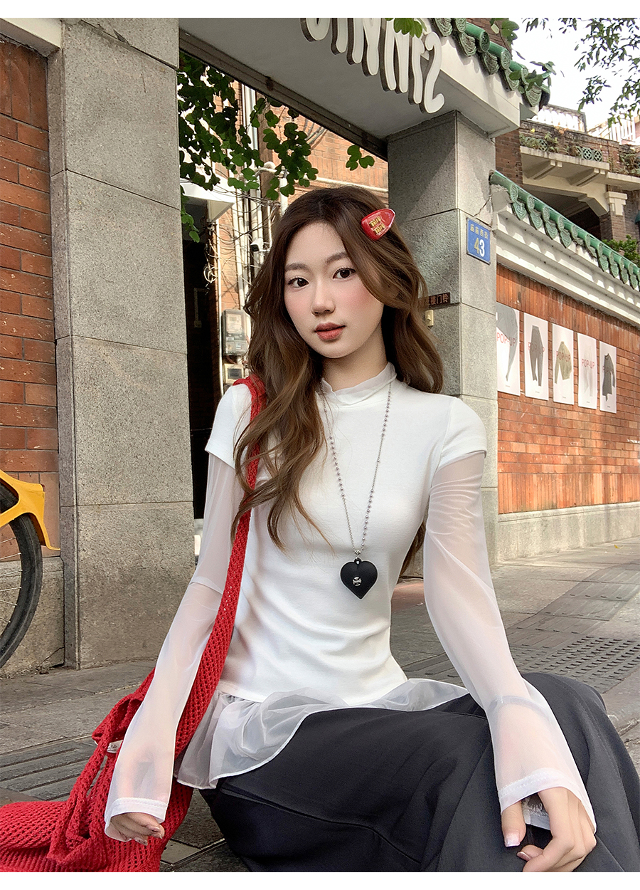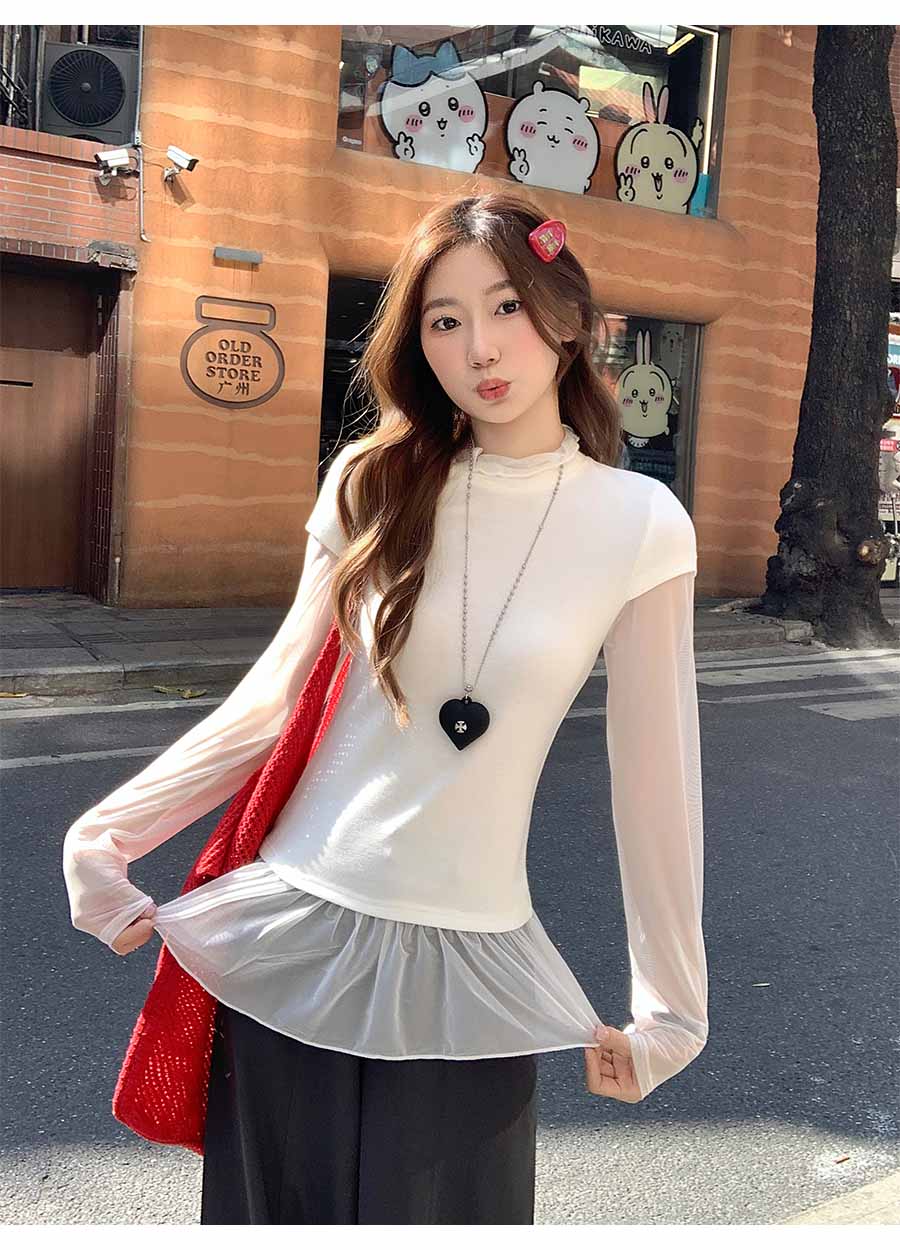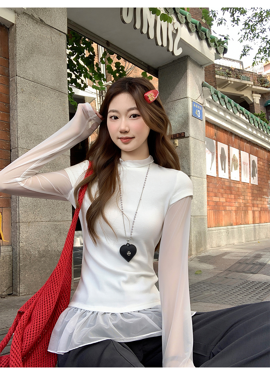 MY17647# 纯欲网纱拼接圆领打底衫新款修身显瘦超好看假两件上衣女裝貨源服裝批發