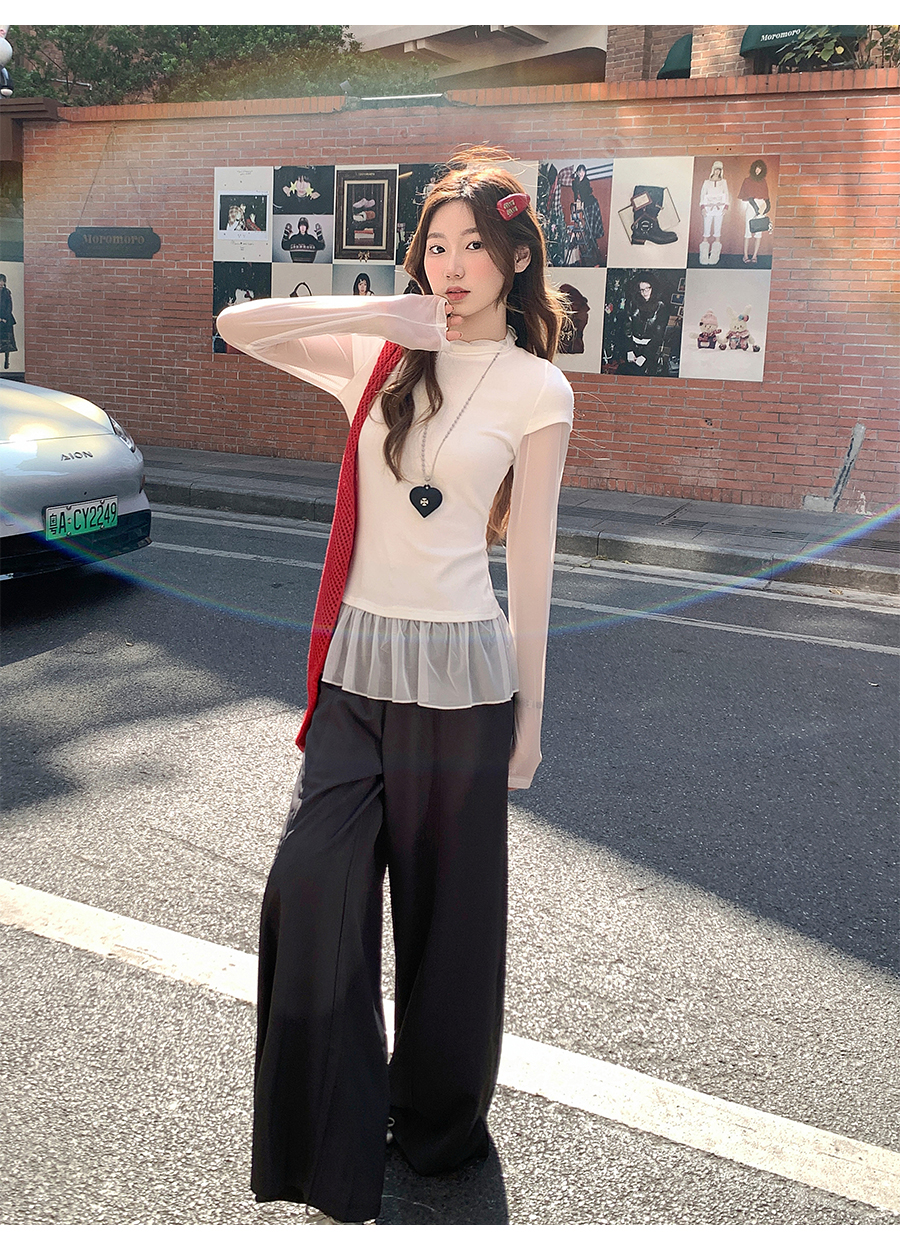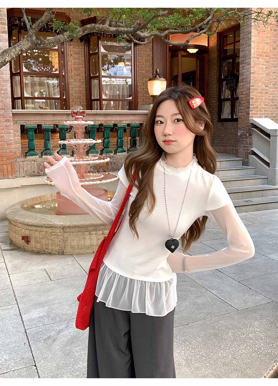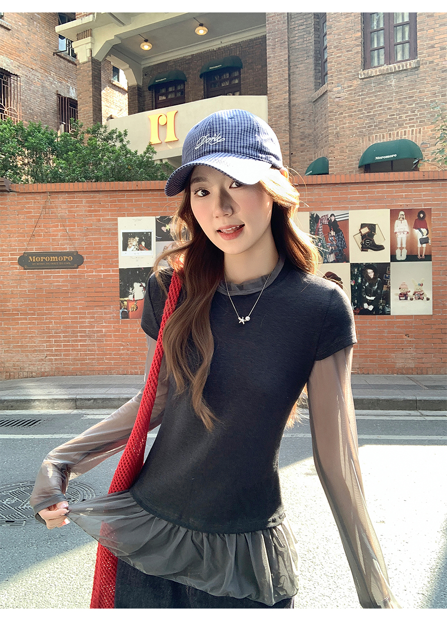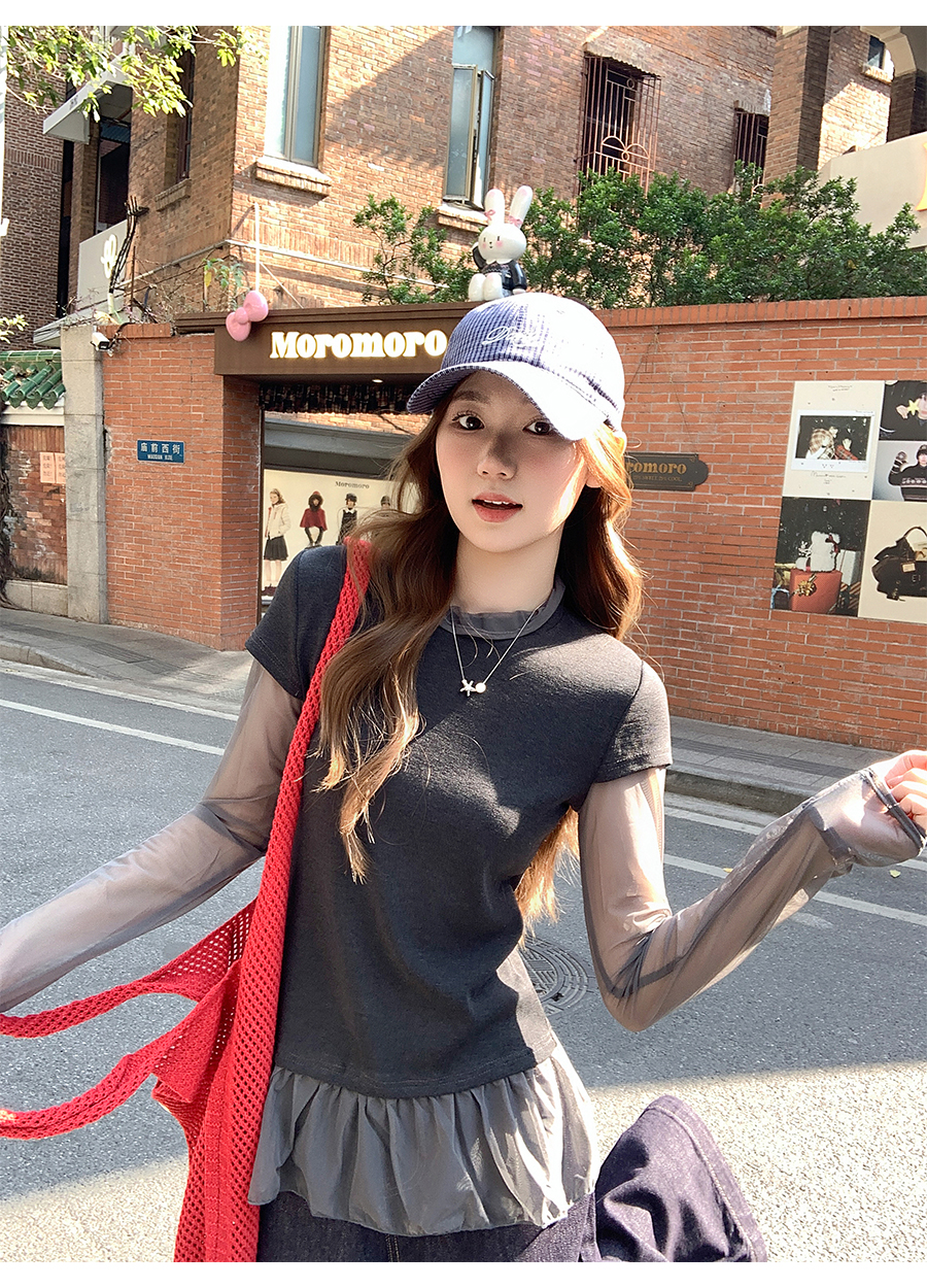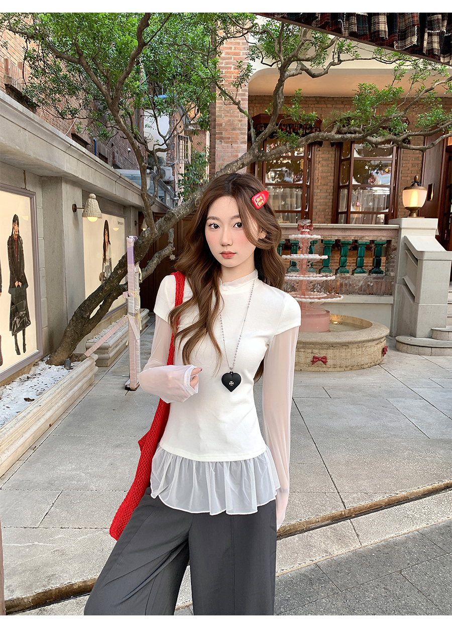 MY17647# 纯欲网纱拼接圆领打底衫新款修身显瘦超好看假两件上衣女裝貨源服裝批發