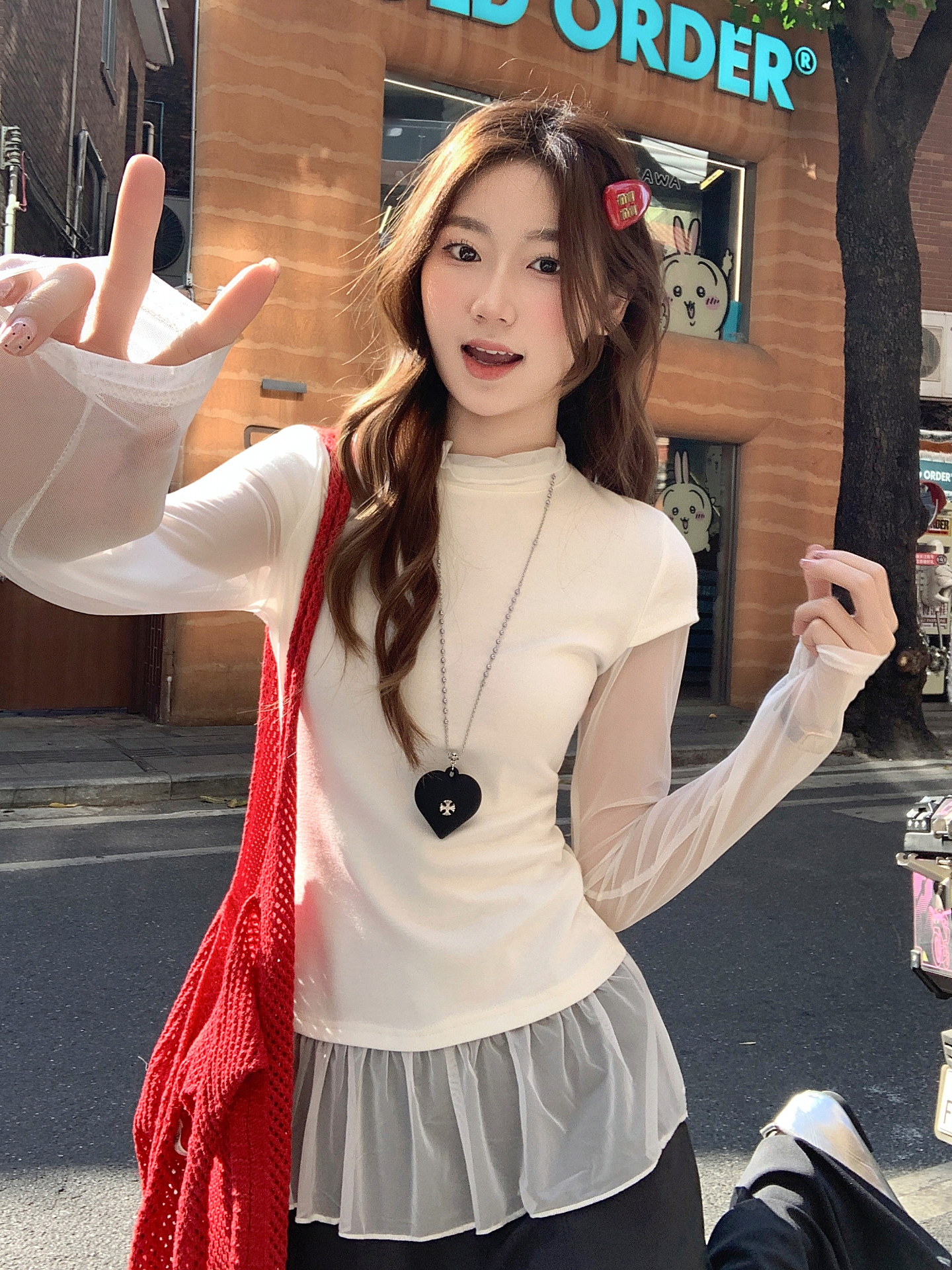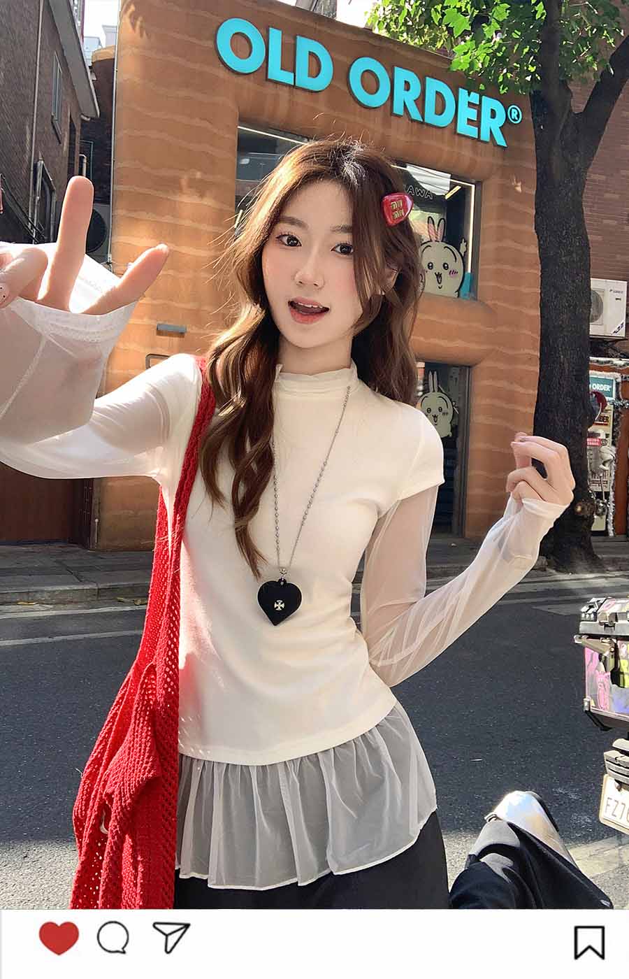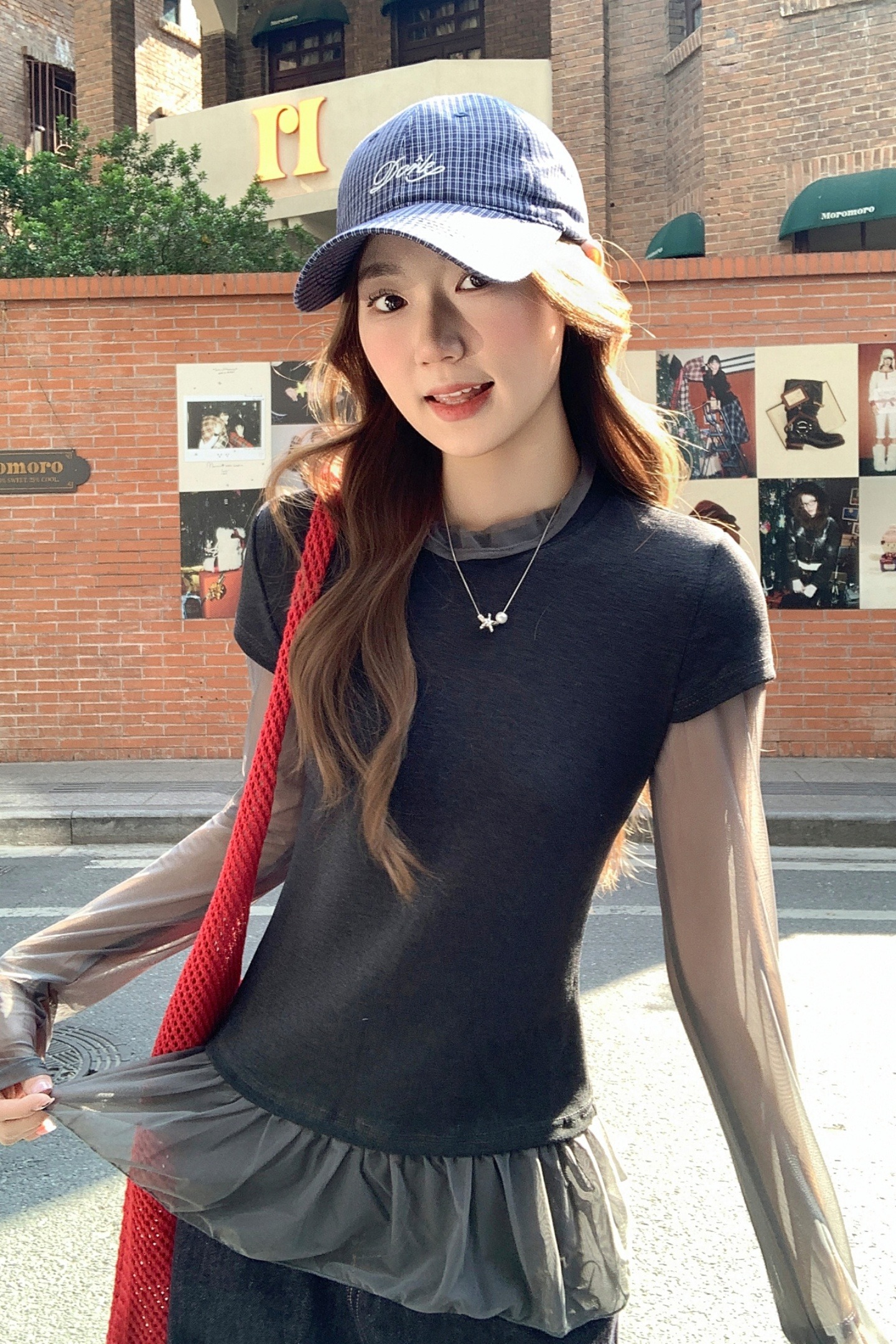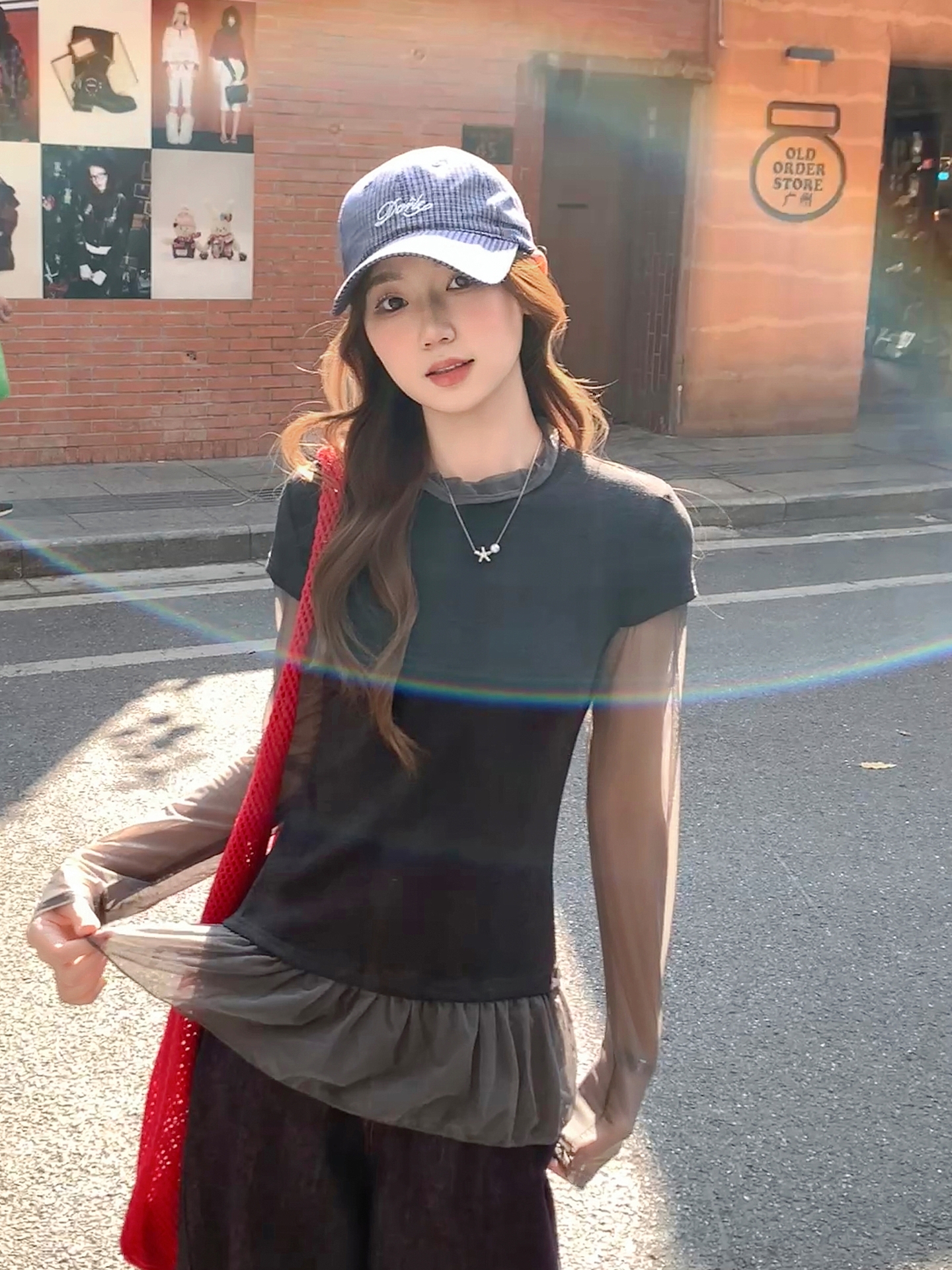 MY17647# 纯欲网纱拼接圆领打底衫新款修身显瘦超好看假两件上衣女裝貨源服裝批發
