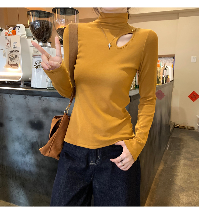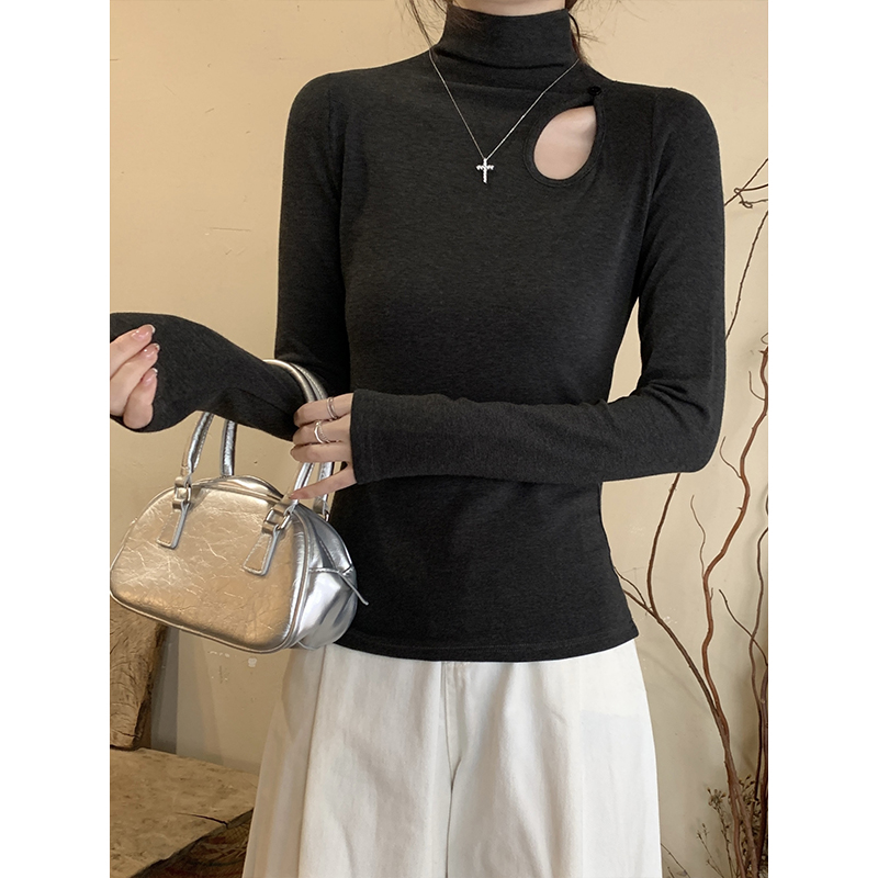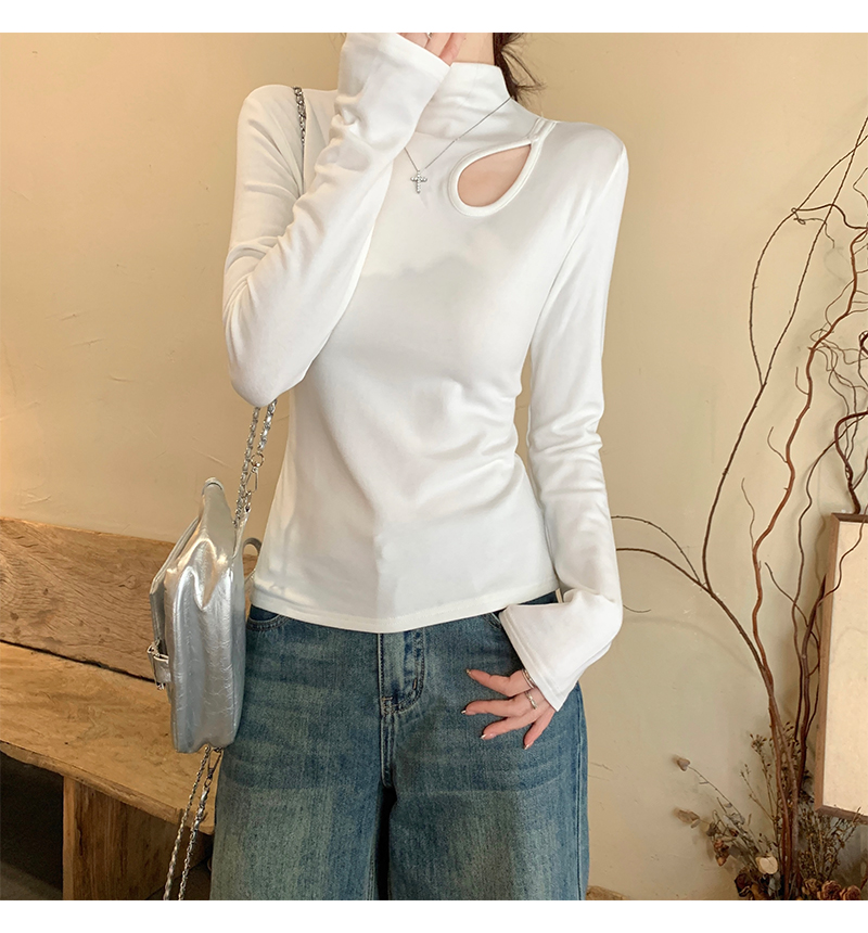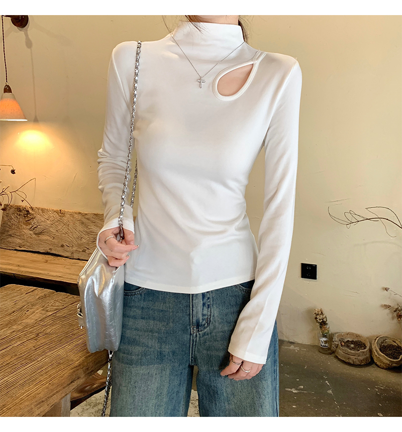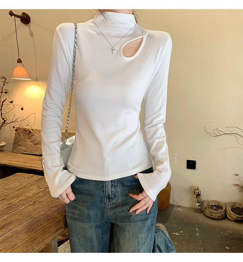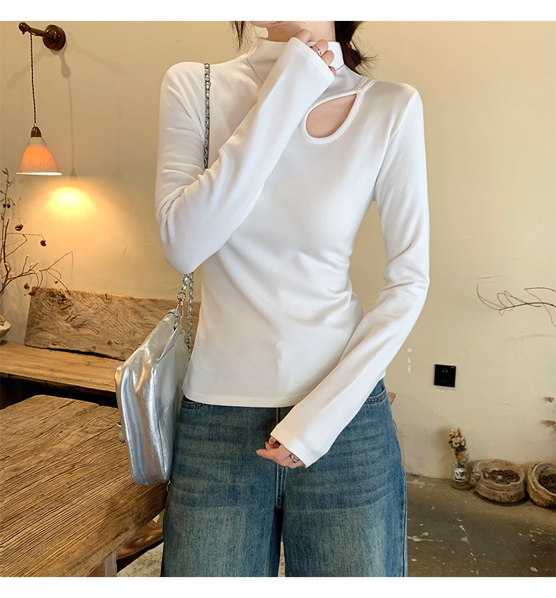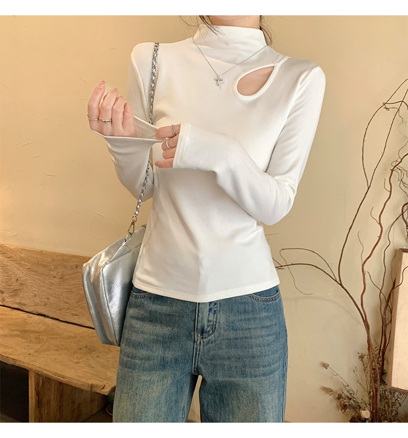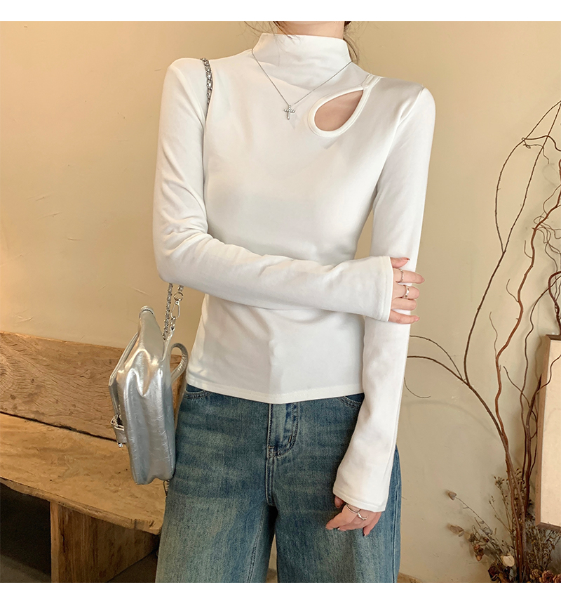 MY17654# 镂空露肩长袖t恤新款洋气磨毛薄绒修身内搭打底衫上衣女裝貨源服裝批發