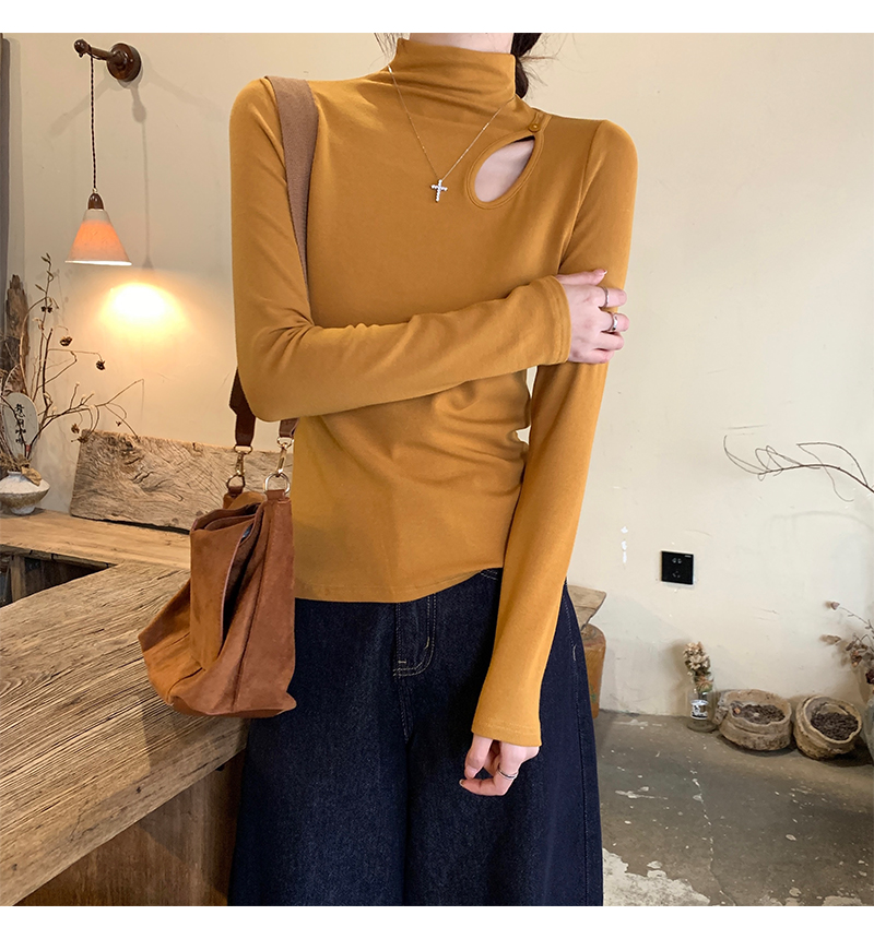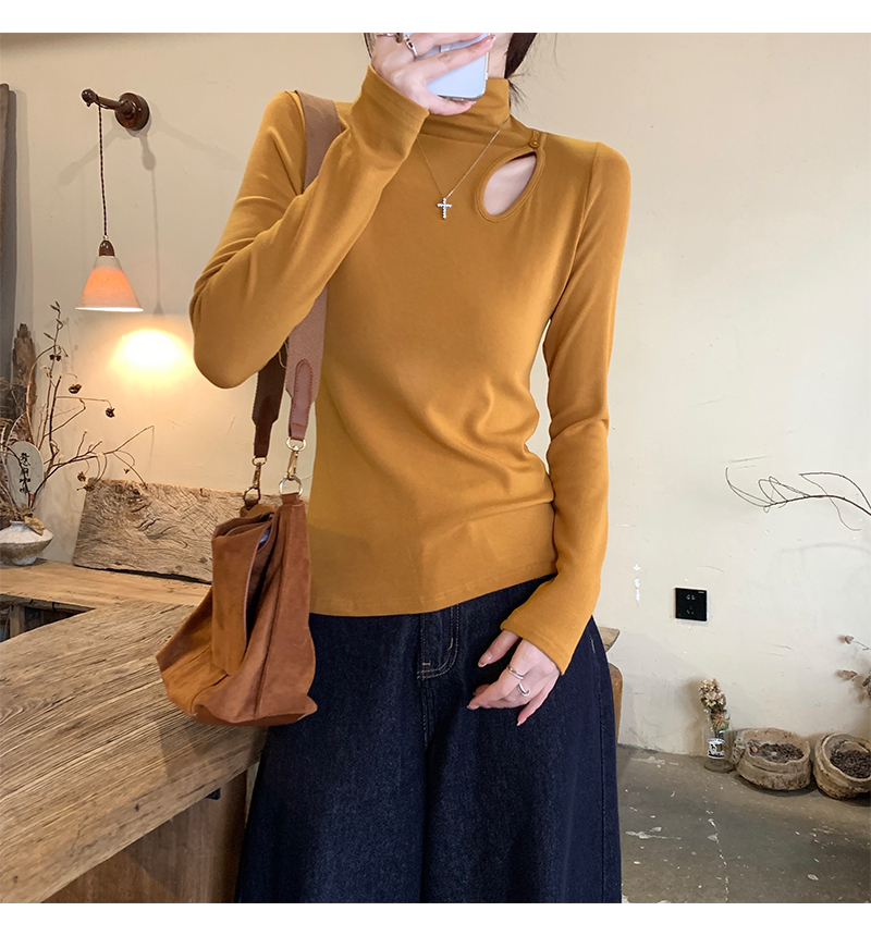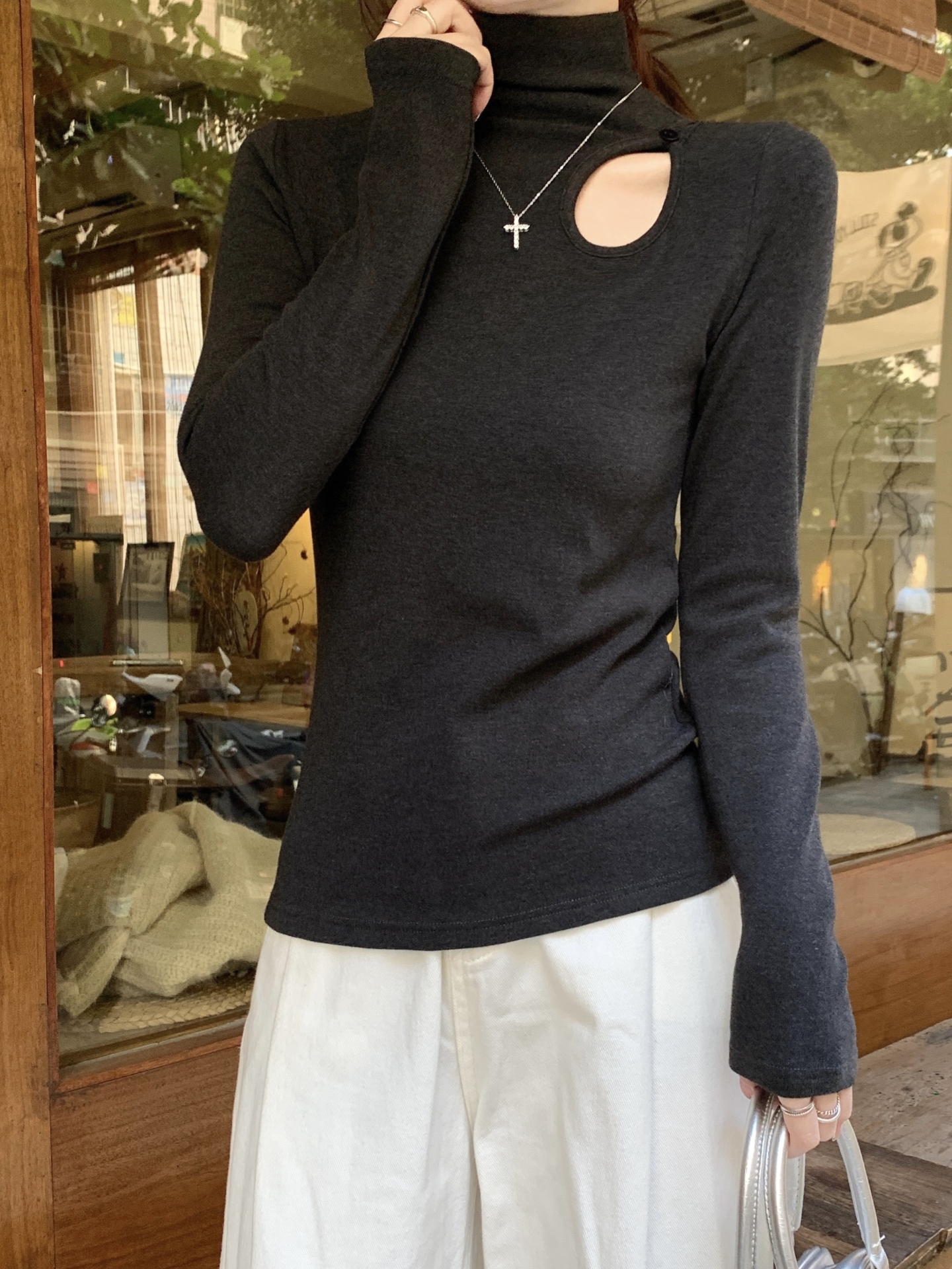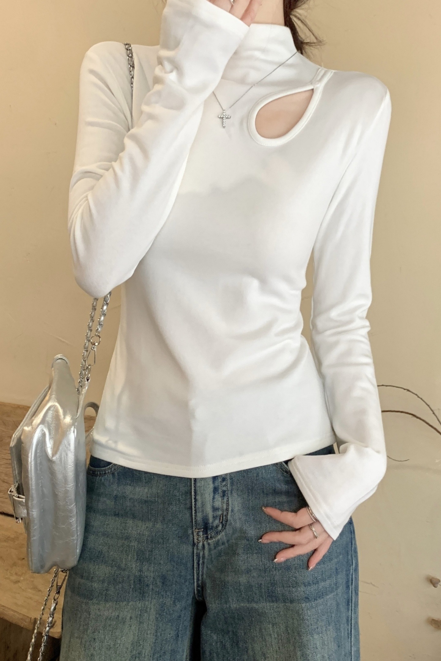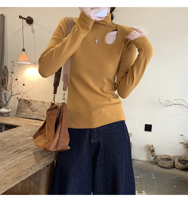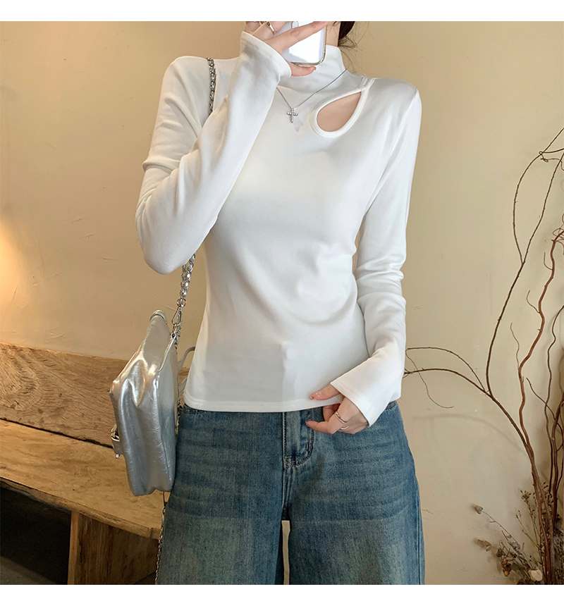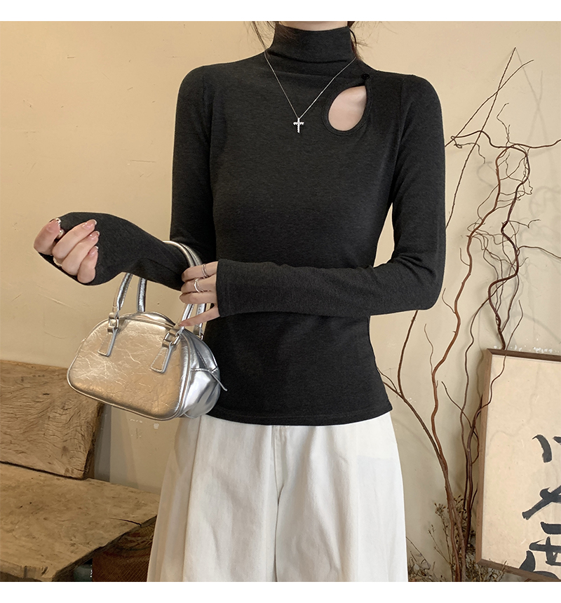 MY17654# 镂空露肩长袖t恤新款洋气磨毛薄绒修身内搭打底衫上衣女裝貨源服裝批發