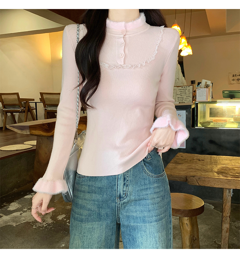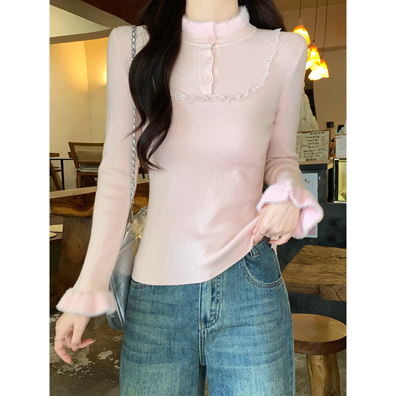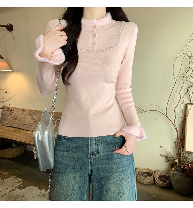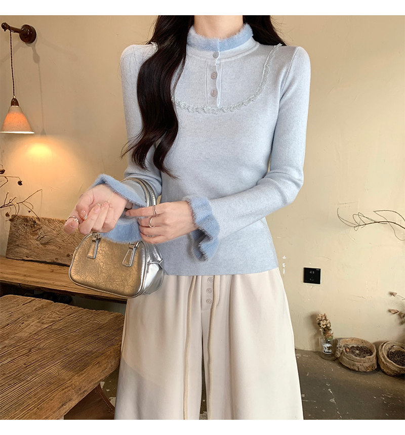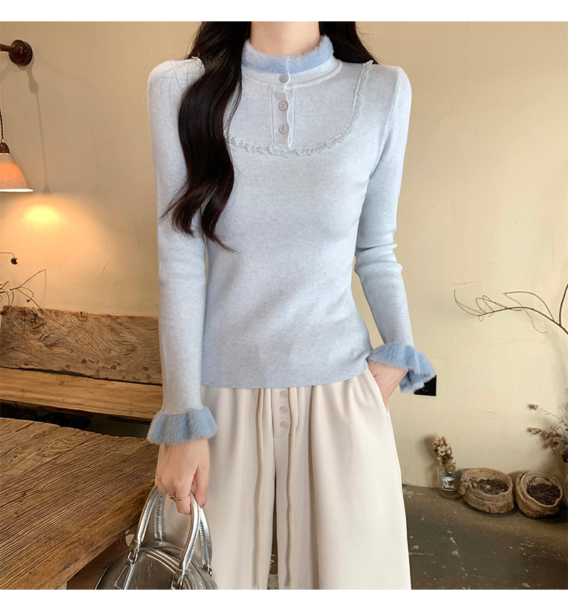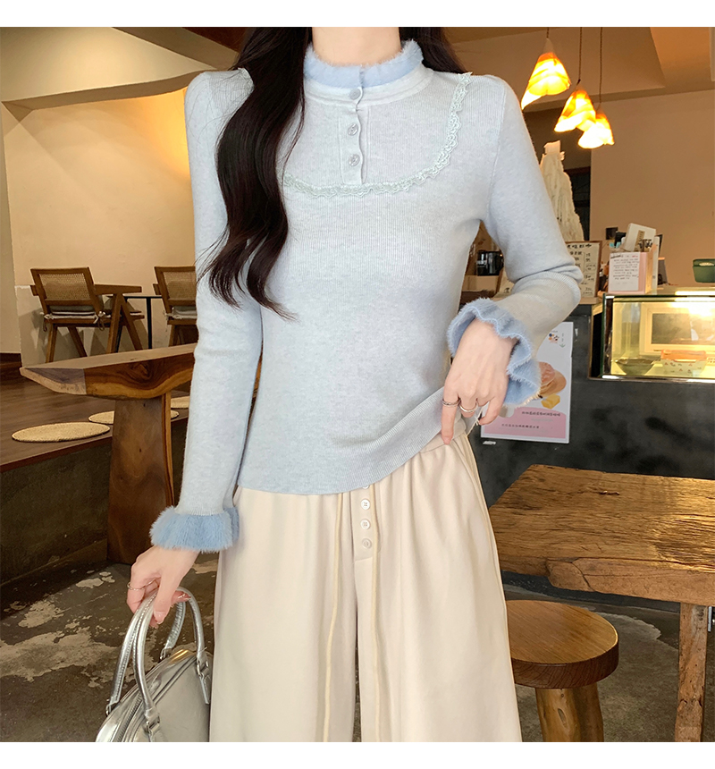 MY17656# 法式蕾丝毛毛拼接针织衫新款高级感修身显瘦内搭打底衫上衣女裝貨源服裝批發