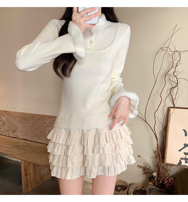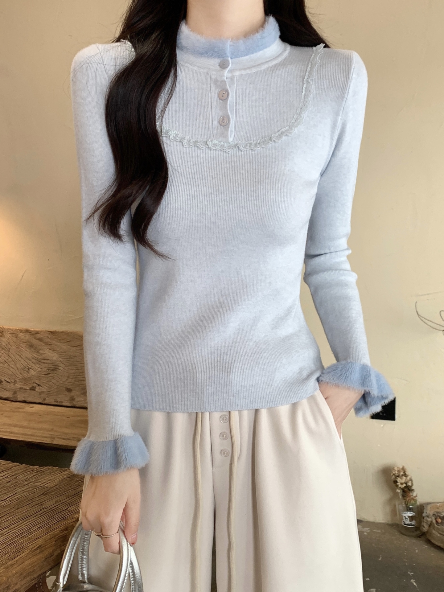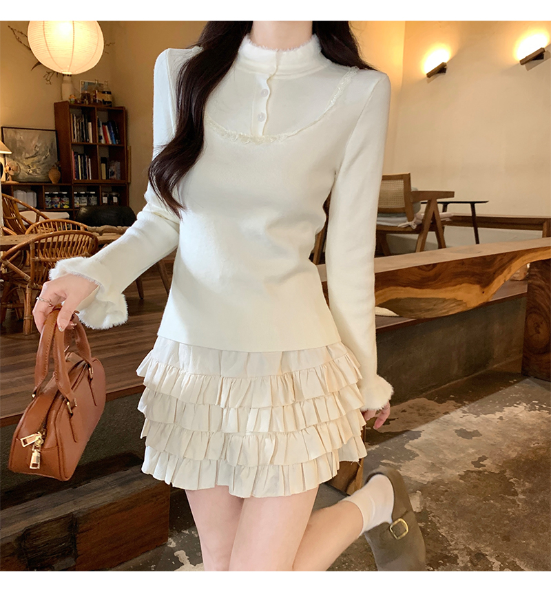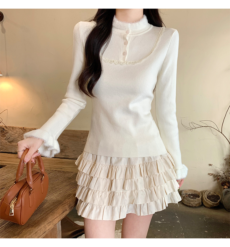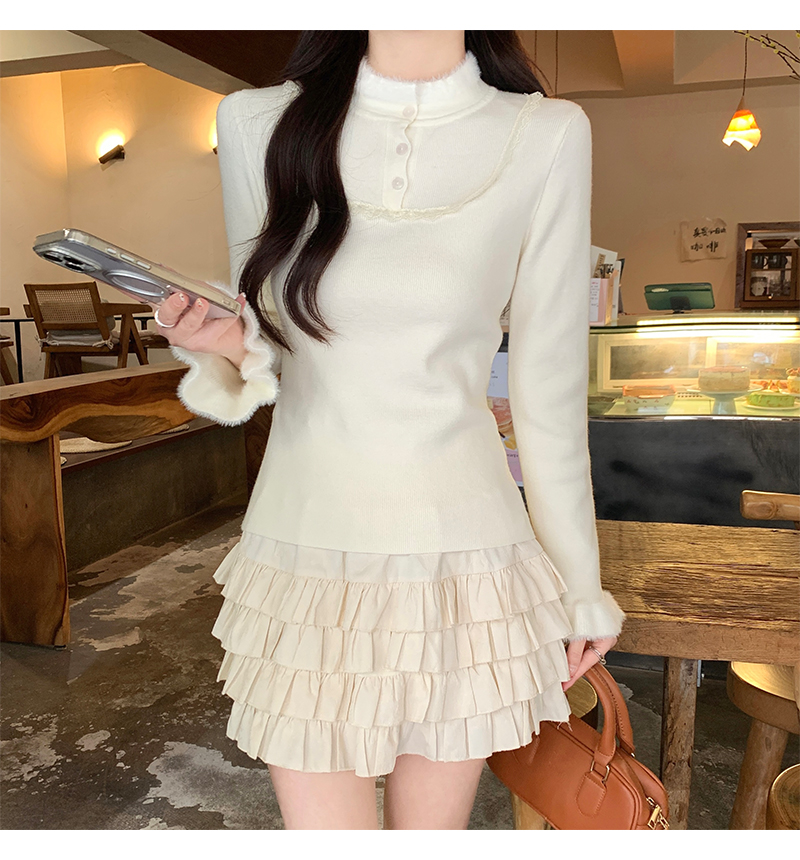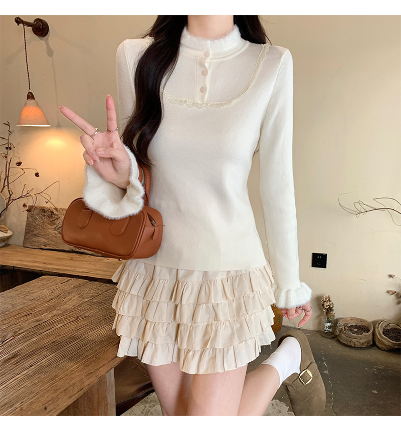 MY17656# 法式蕾丝毛毛拼接针织衫新款高级感修身显瘦内搭打底衫上衣女裝貨源服裝批發