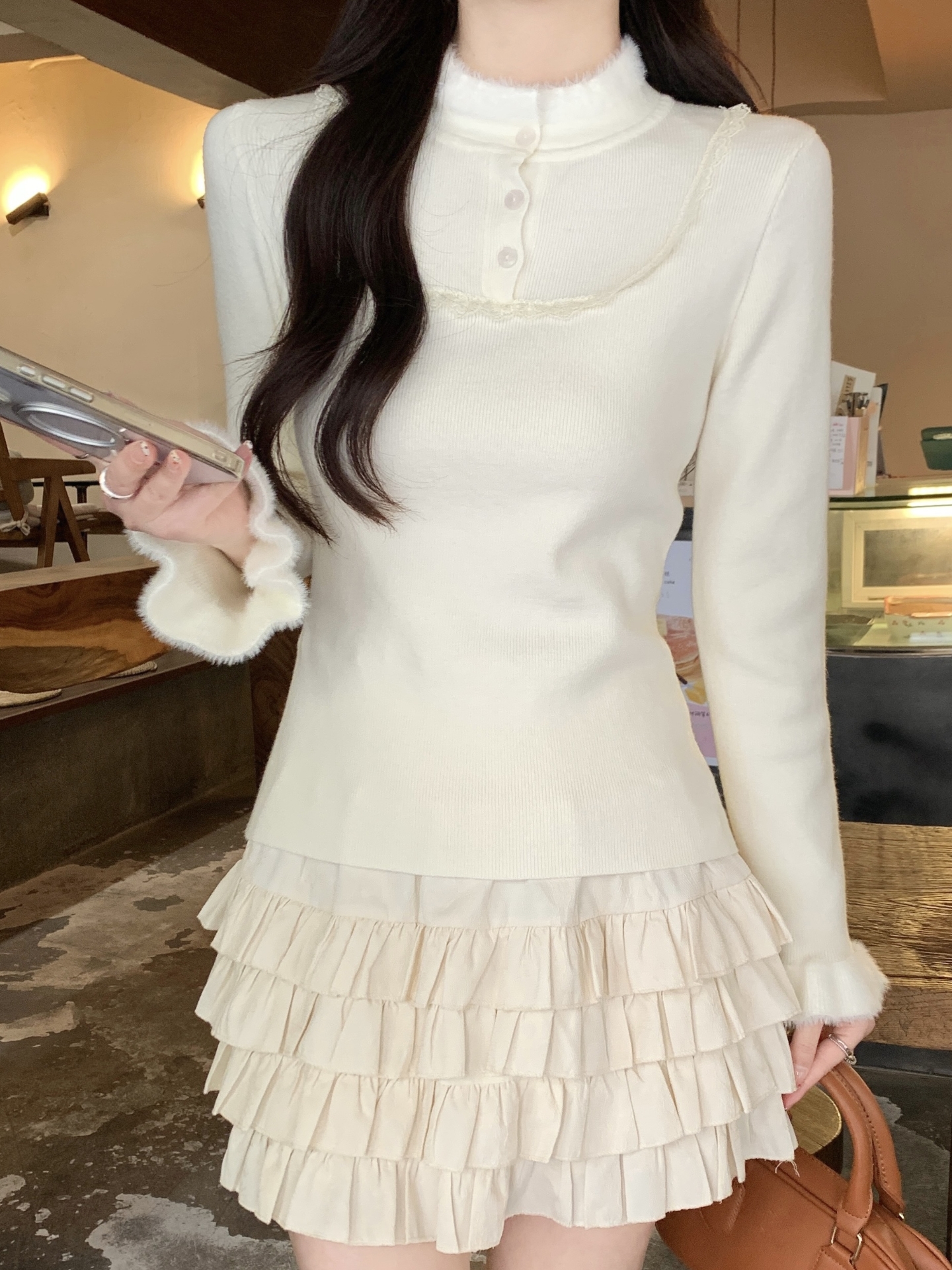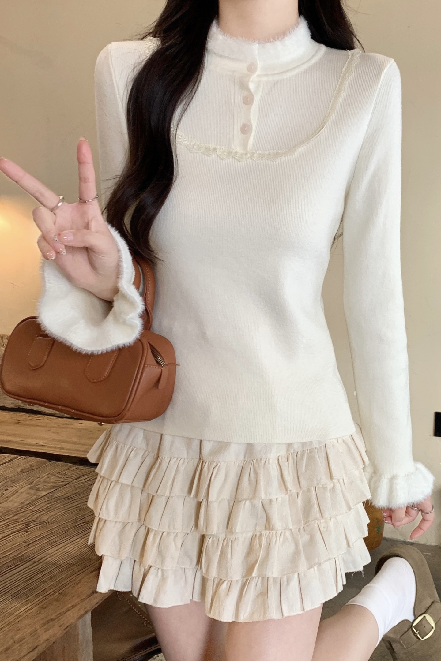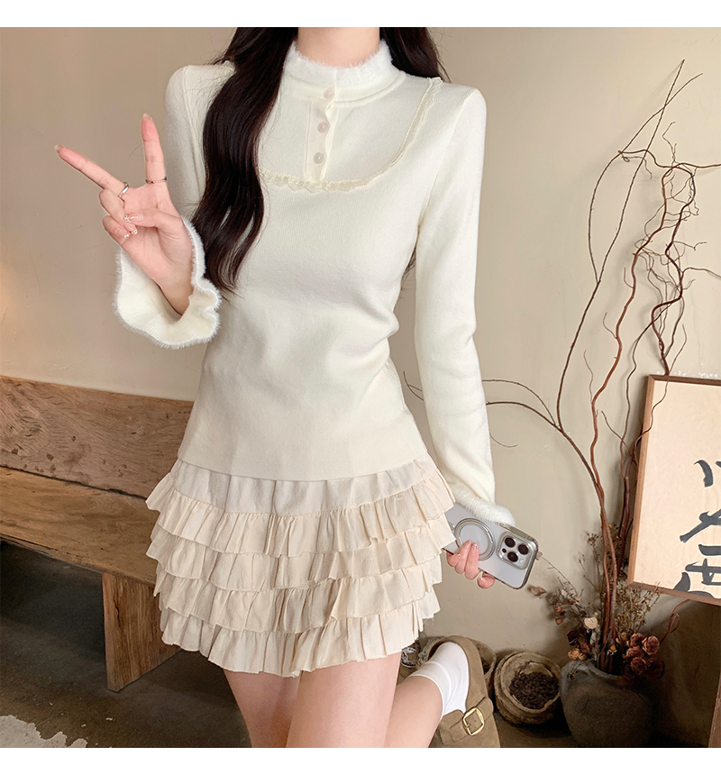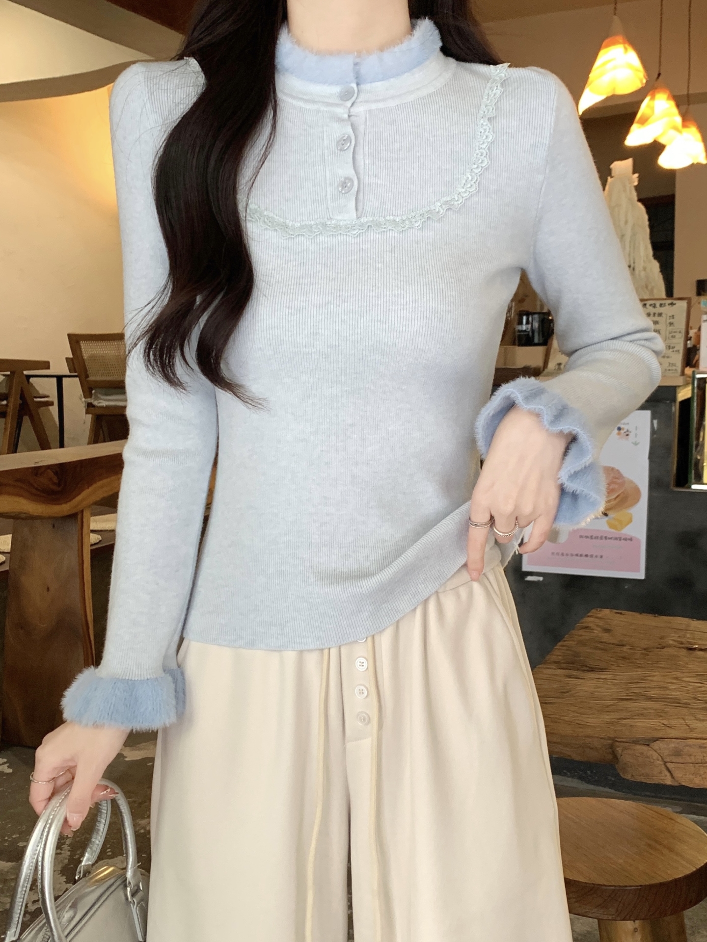 MY17656# 法式蕾丝毛毛拼接针织衫新款高级感修身显瘦内搭打底衫上衣女裝貨源服裝批發