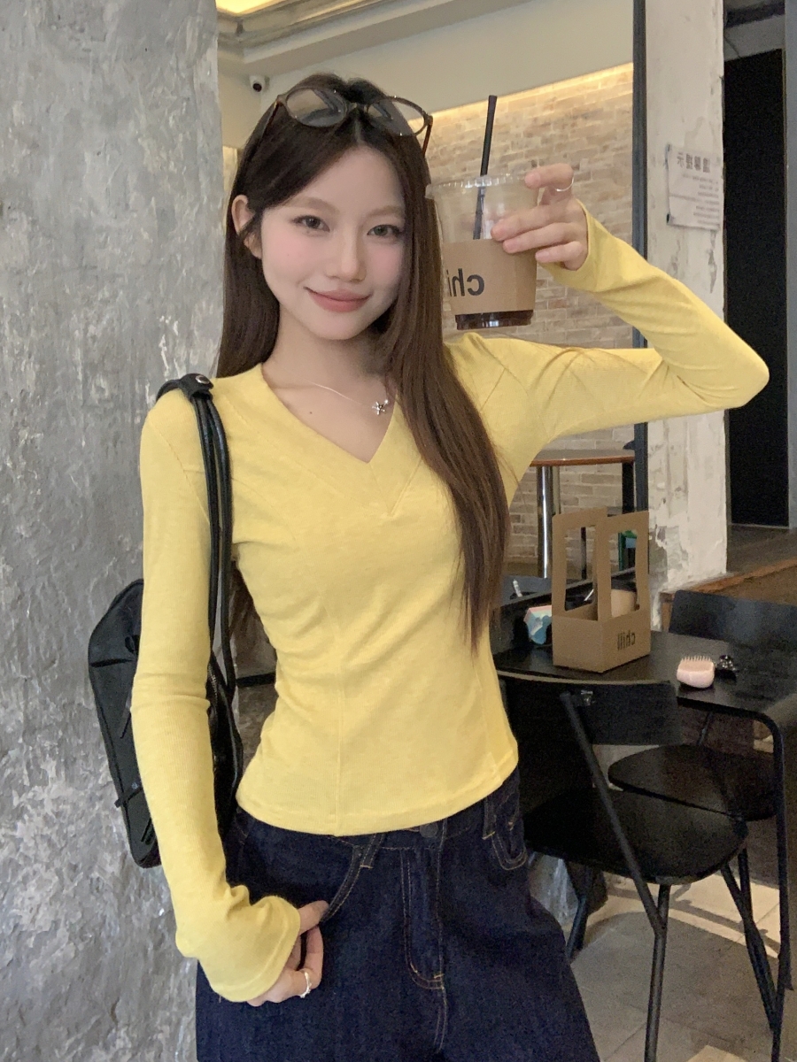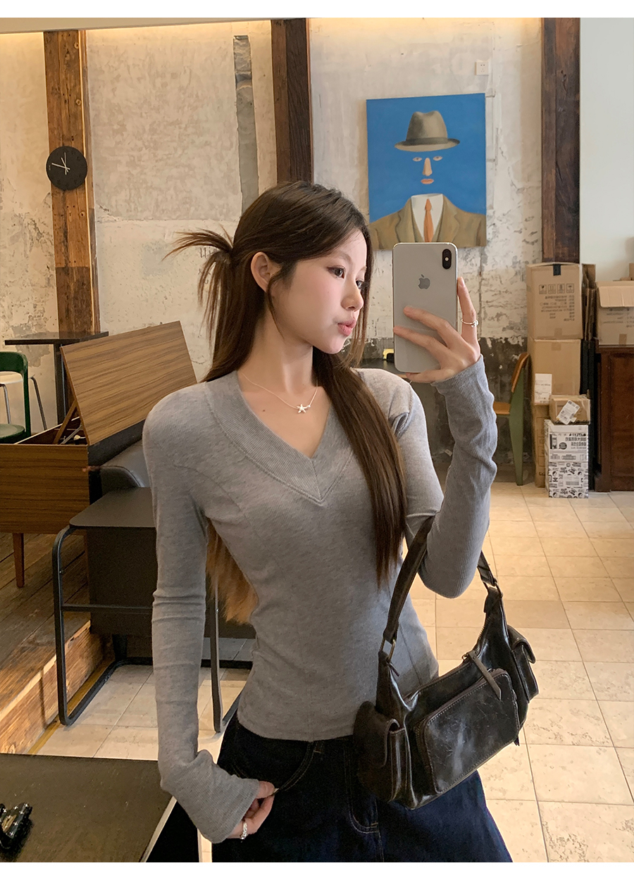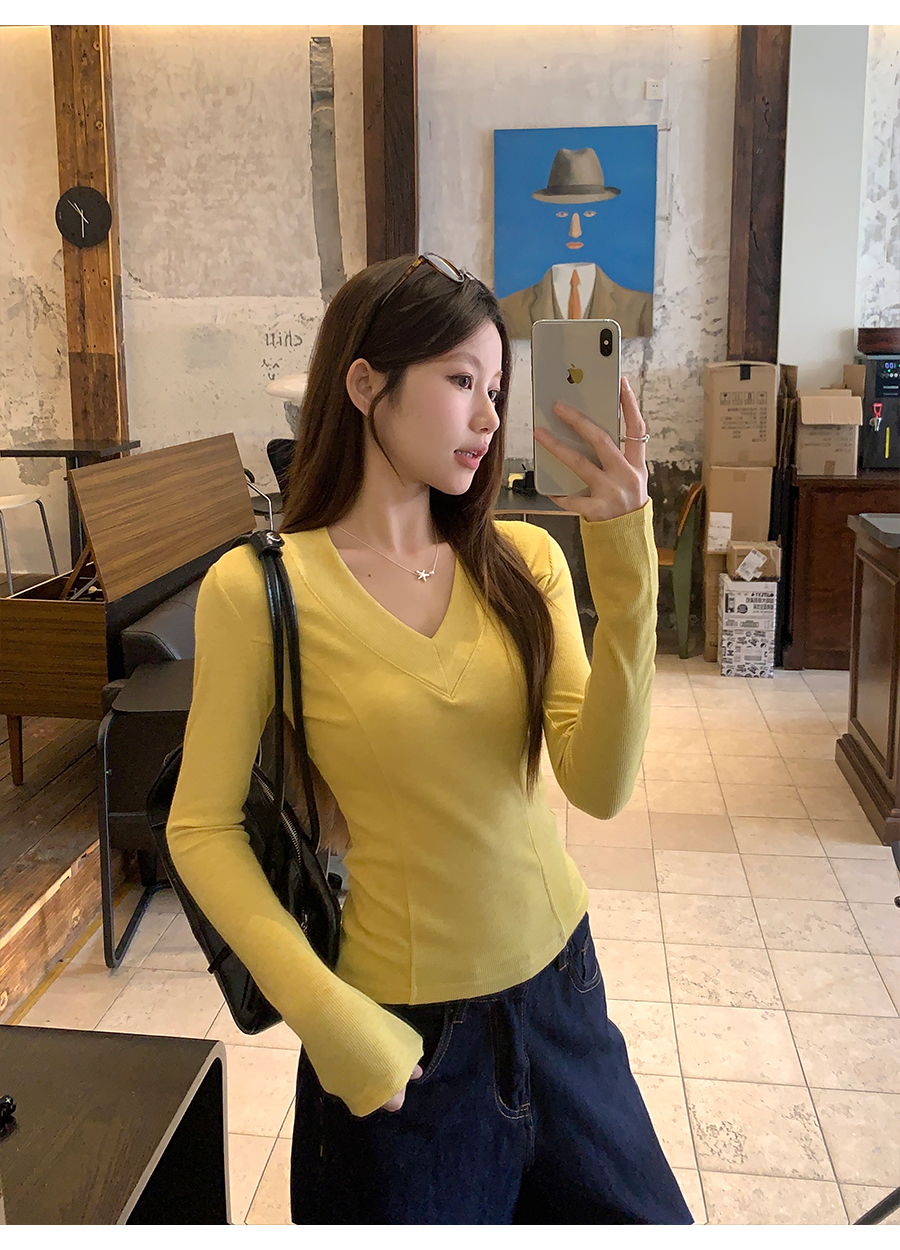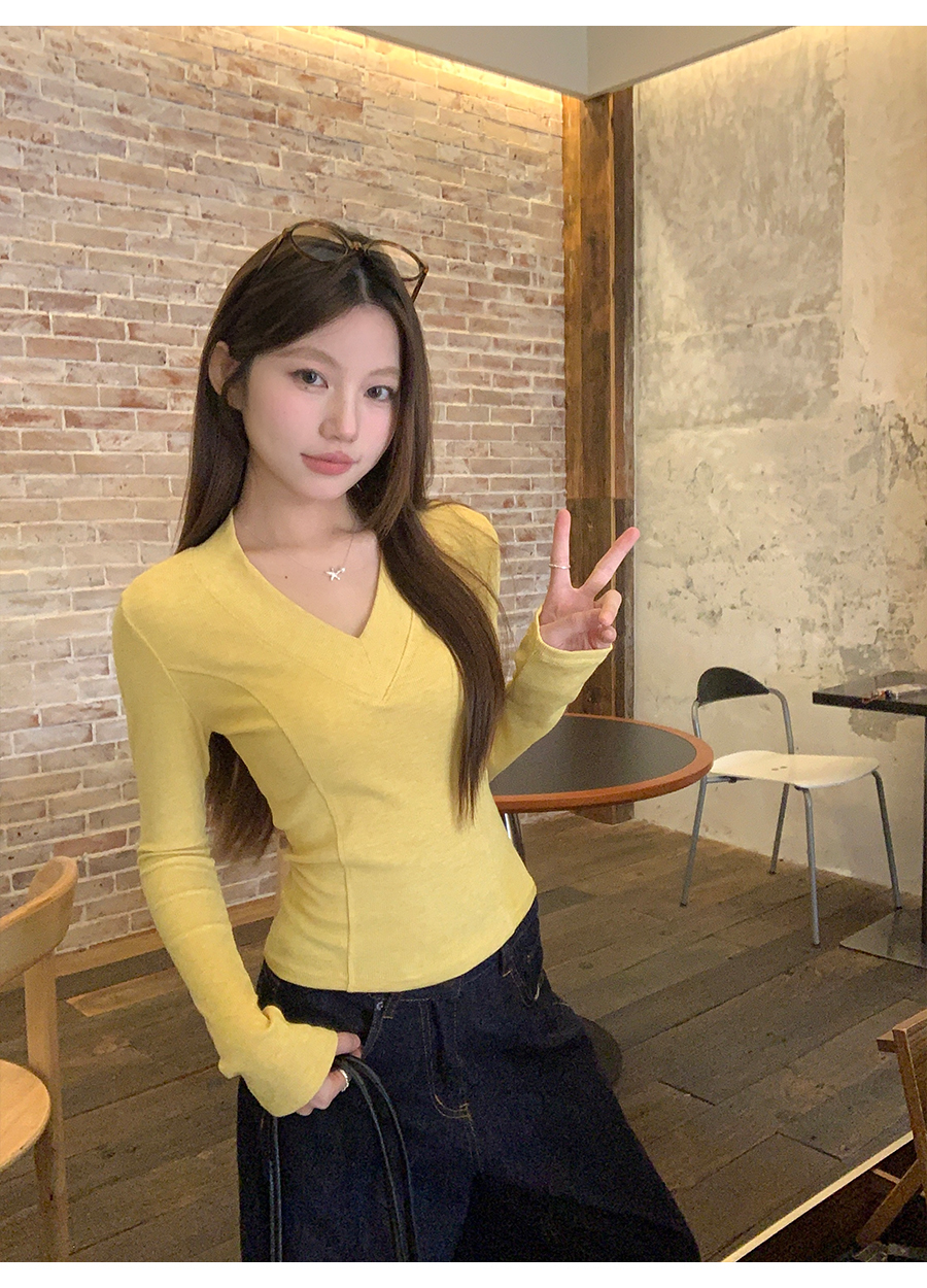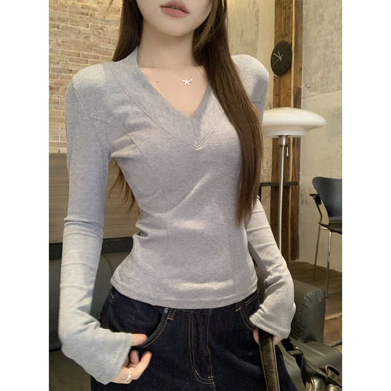 MY17657# 辣妹v领长袖t恤新款高级感修身显瘦气质内搭打底衫上衣女裝貨源服裝批發