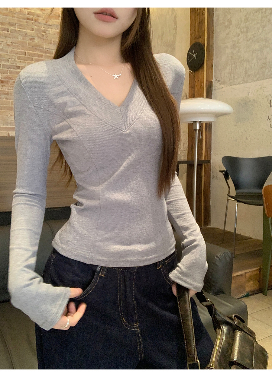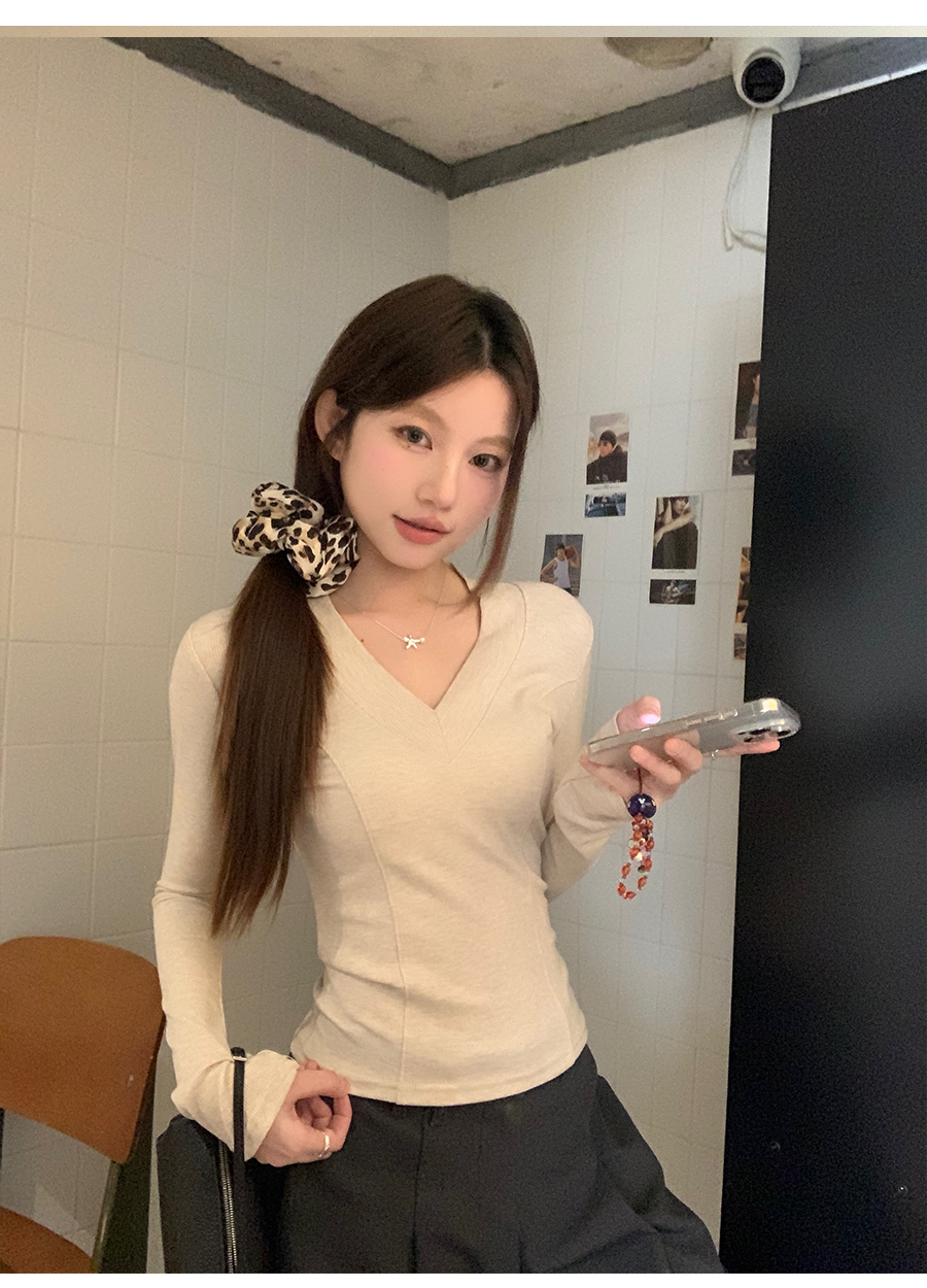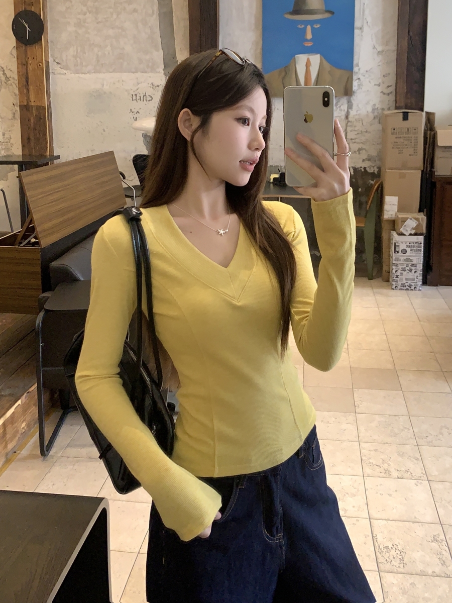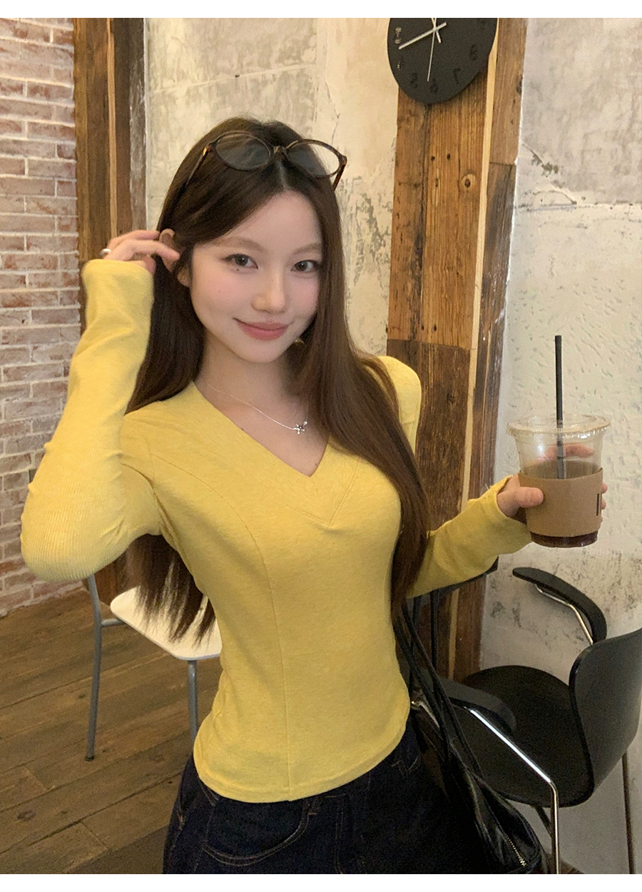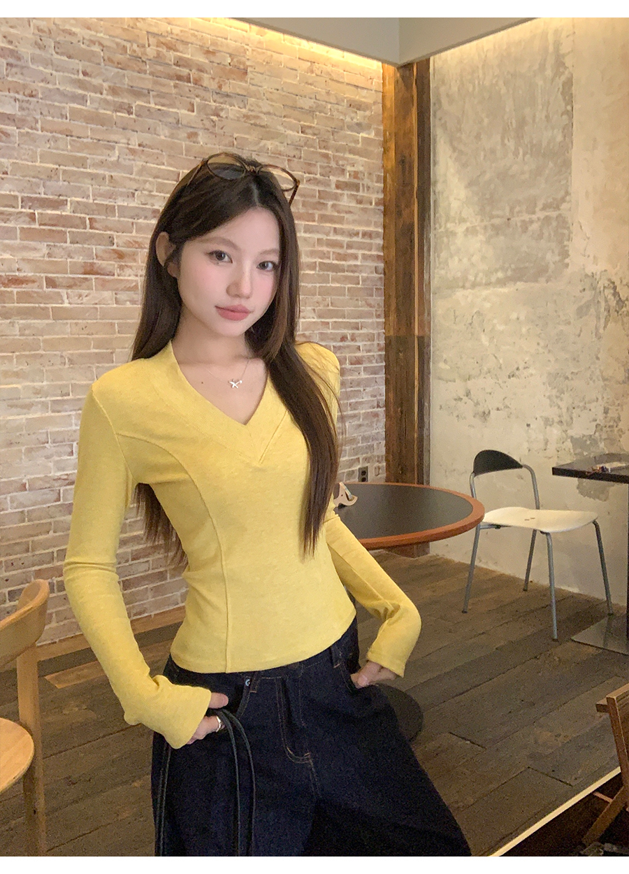 MY17657# 辣妹v领长袖t恤新款高级感修身显瘦气质内搭打底衫上衣女裝貨源服裝批發