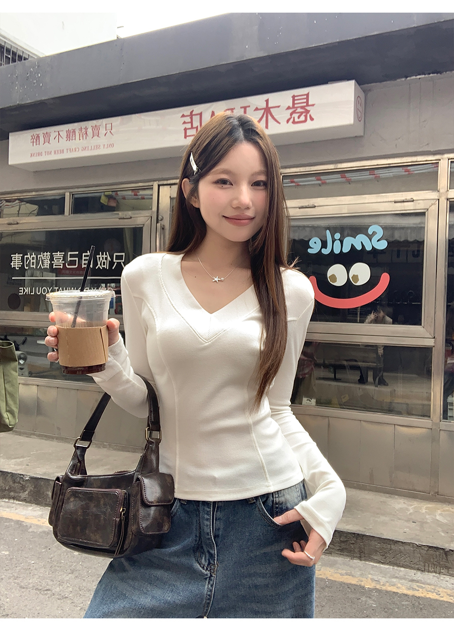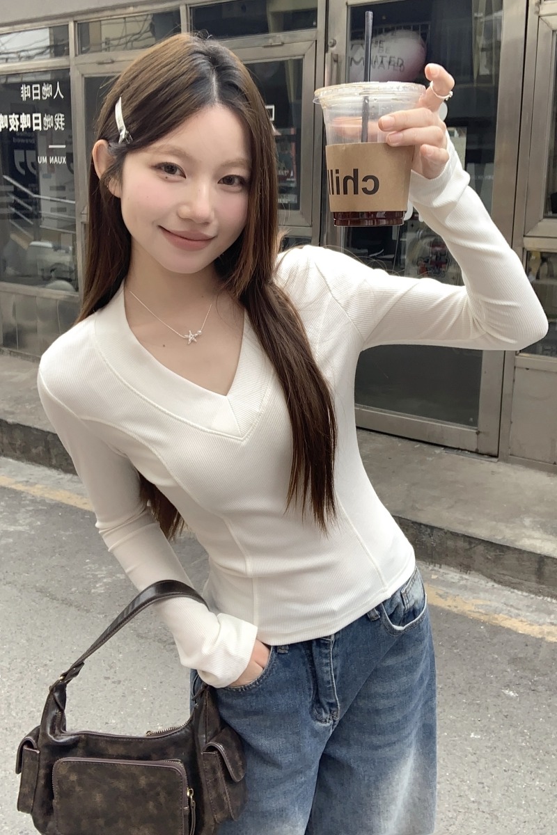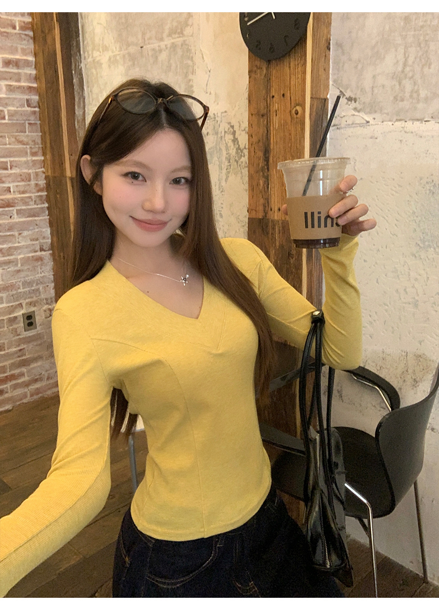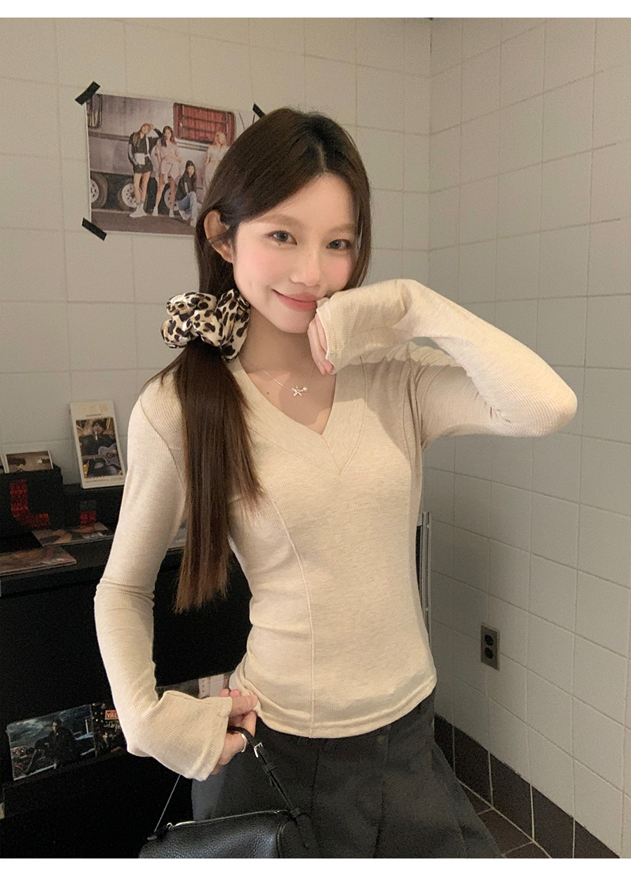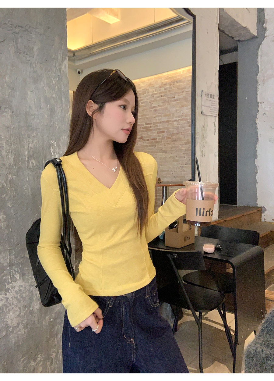 MY17657# 辣妹v领长袖t恤新款高级感修身显瘦气质内搭打底衫上衣女裝貨源服裝批發