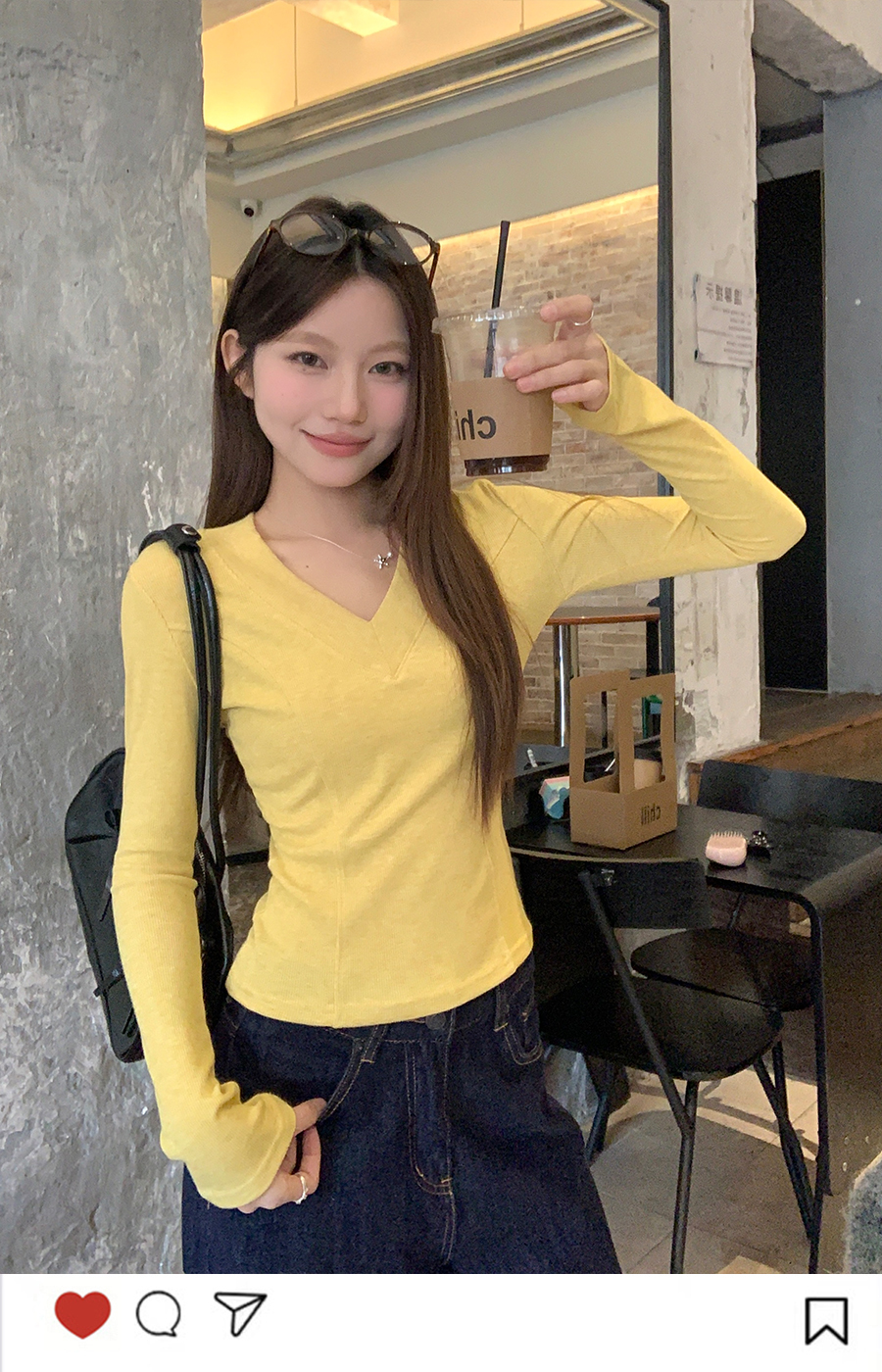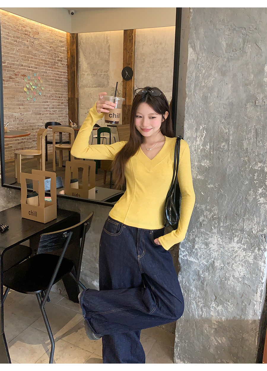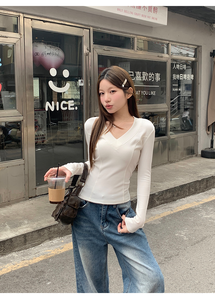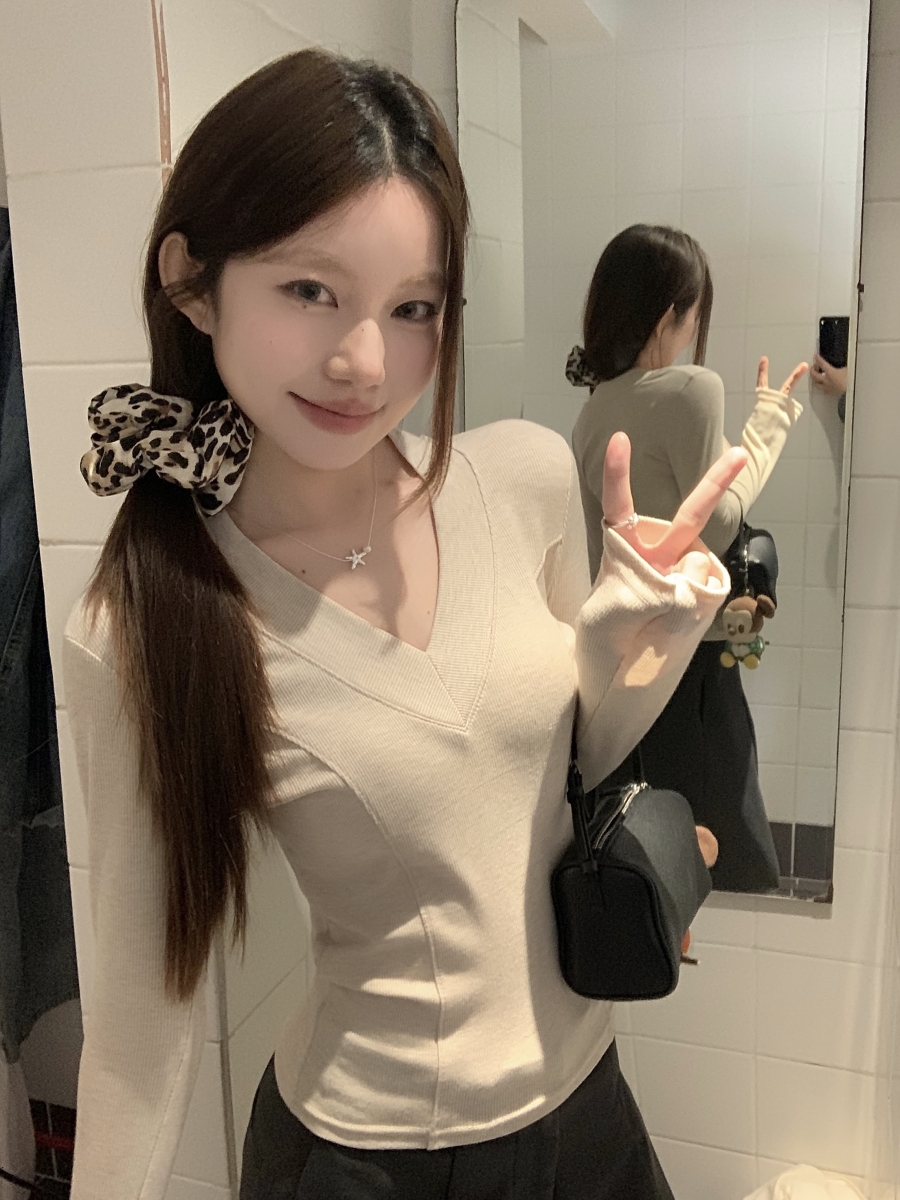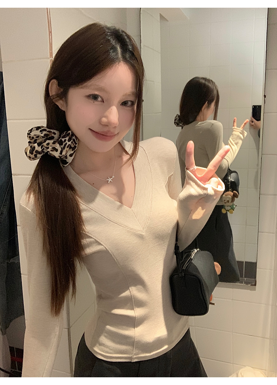 MY17657# 辣妹v领长袖t恤新款高级感修身显瘦气质内搭打底衫上衣女裝貨源服裝批發