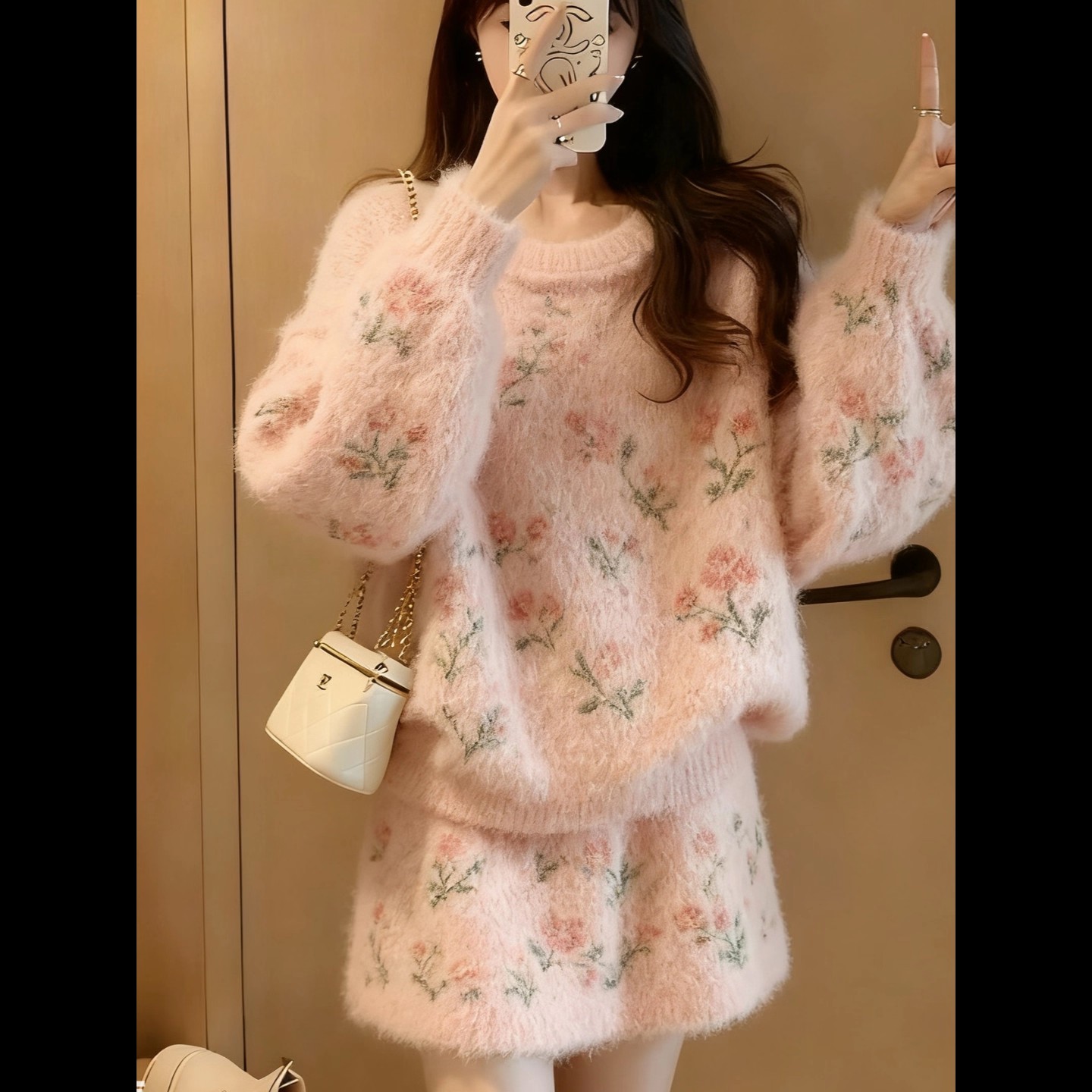 MY17668# 冬装搭配一整套贵气玫瑰花针织套装毛绒毛衣短裙两件套女裝貨源服裝批發