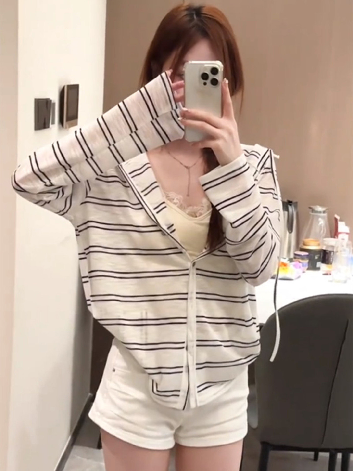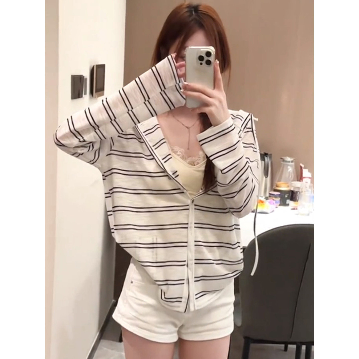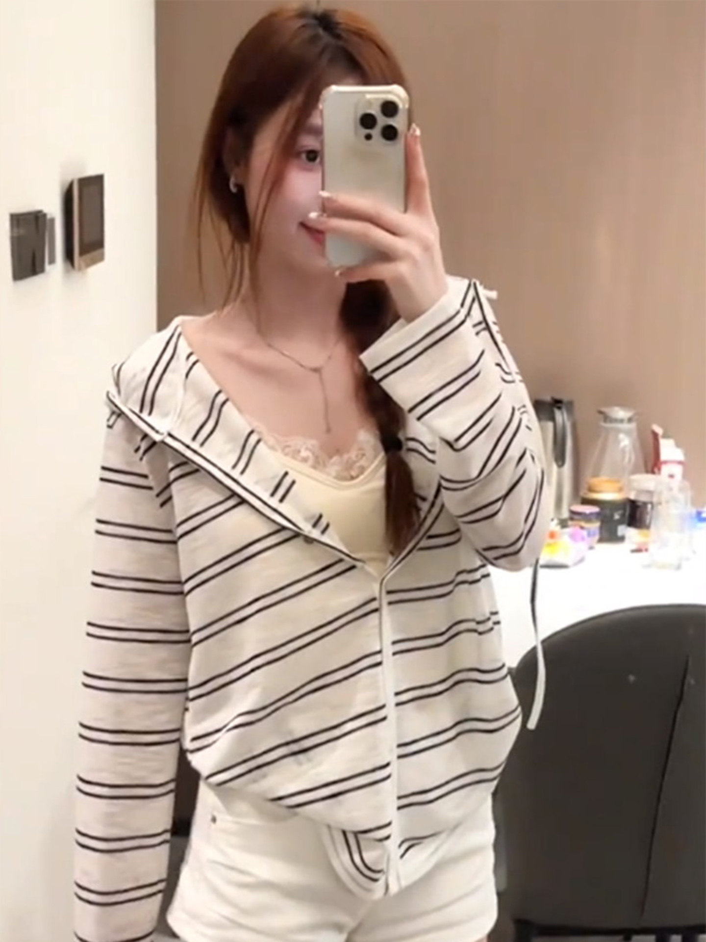 RY70055# 连帽条纹开衫女春秋韩系慵懒风上衣小外套