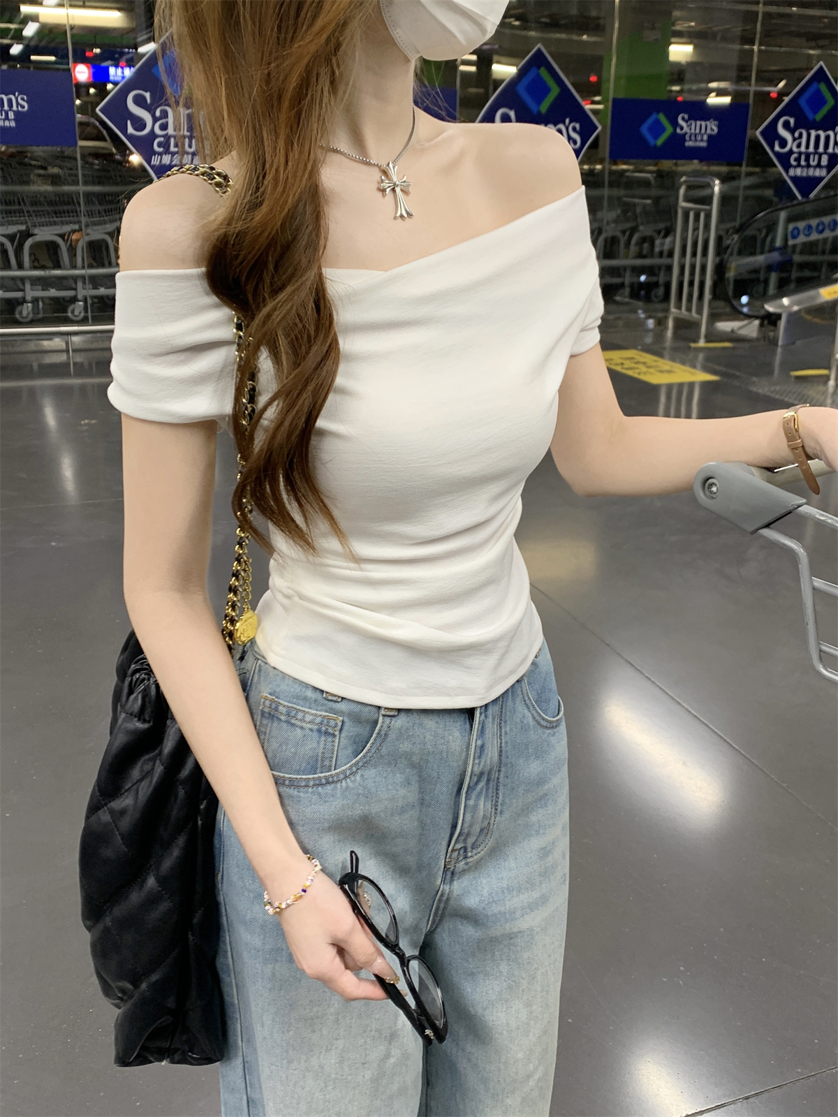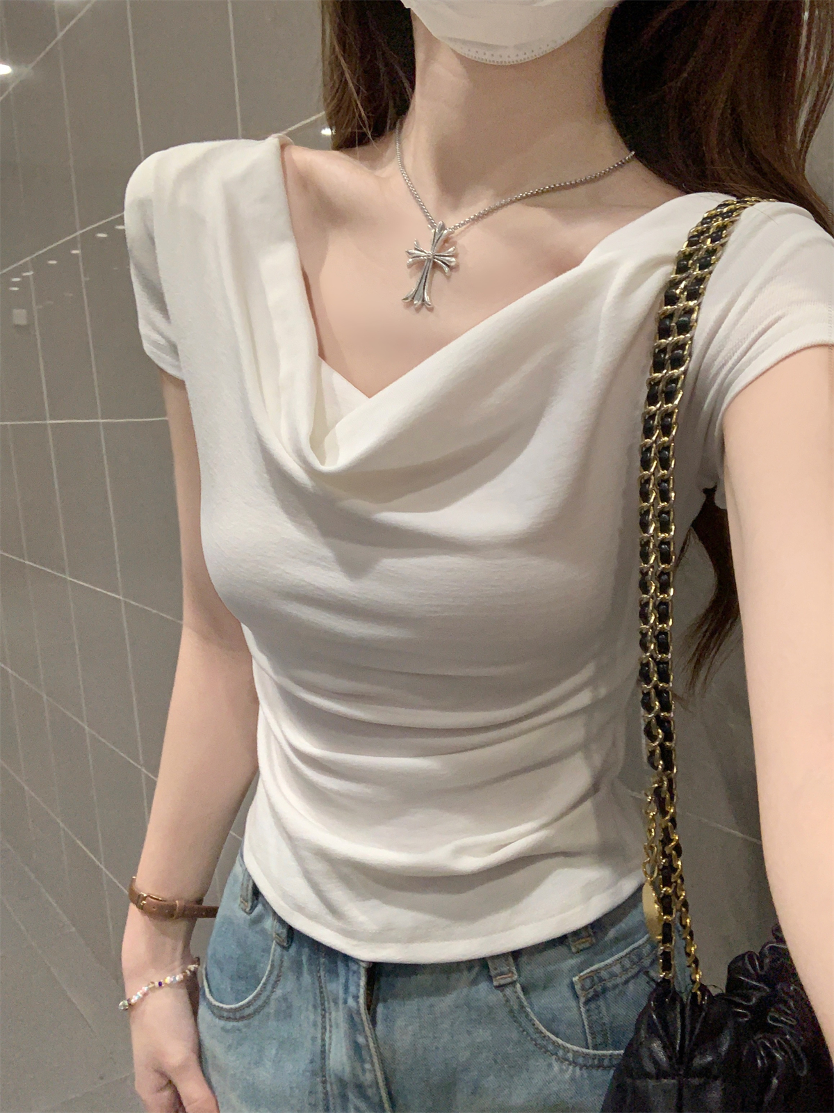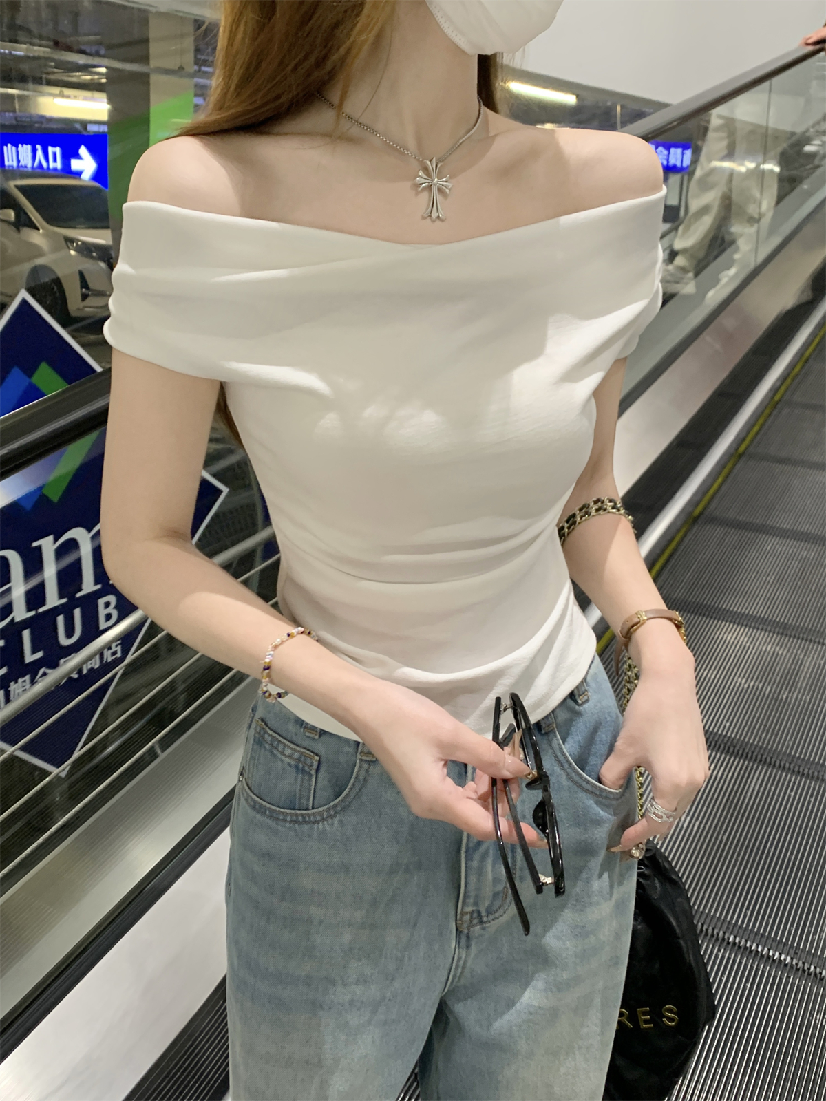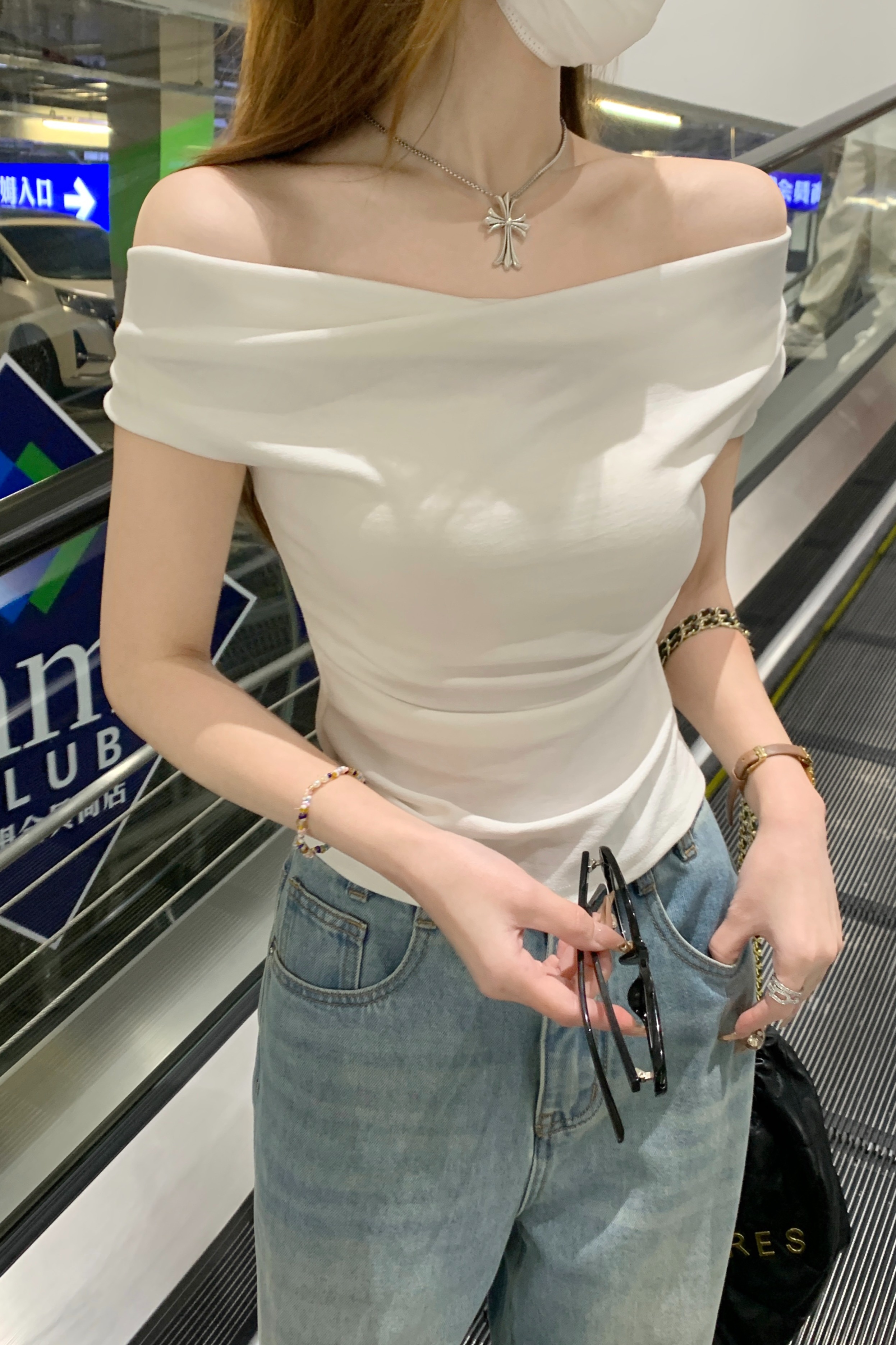 RY70130# 春夏韩版纯欲荡领气质一字肩修身显瘦设计短袖T恤上衣女