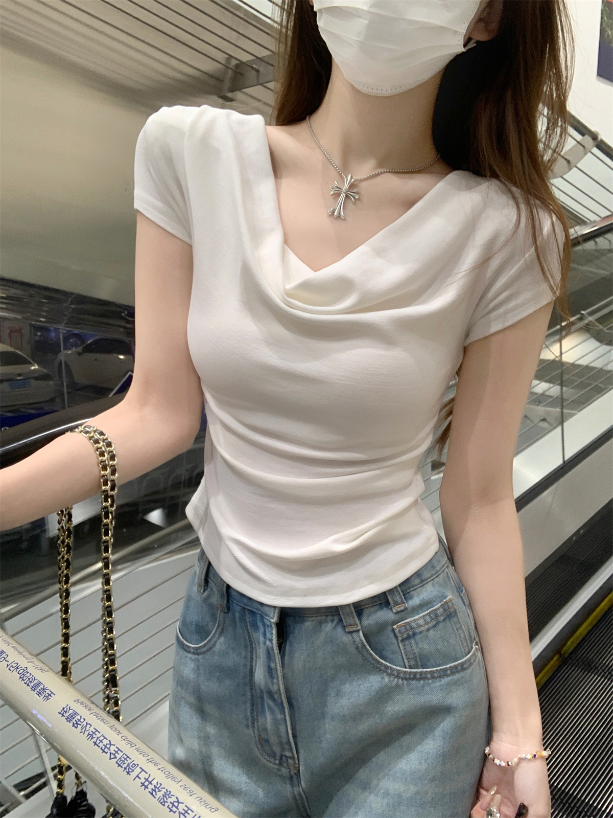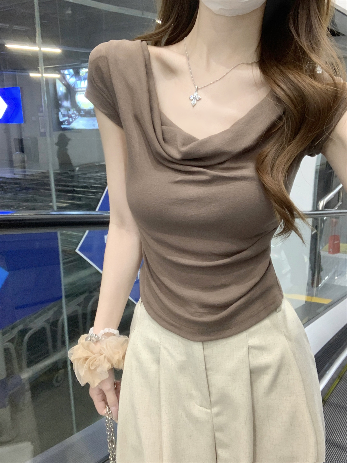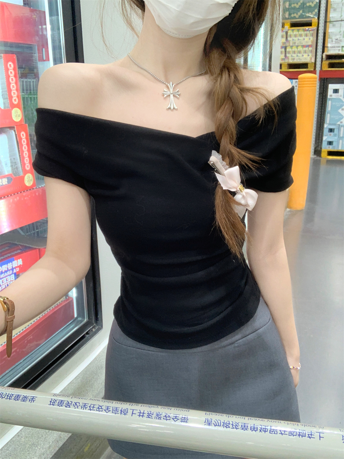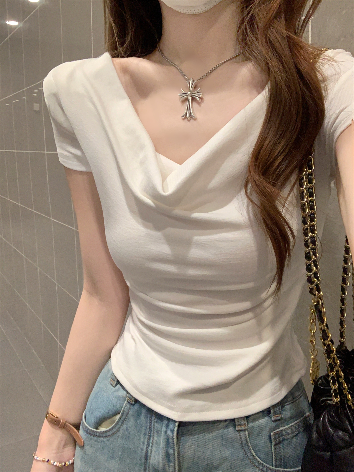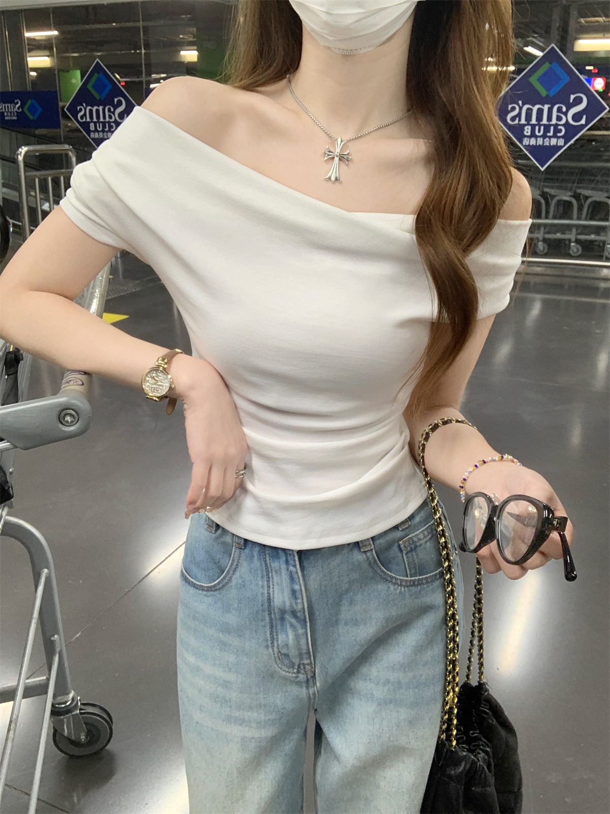 RY70130# 春夏韩版纯欲荡领气质一字肩修身显瘦设计短袖T恤上衣女