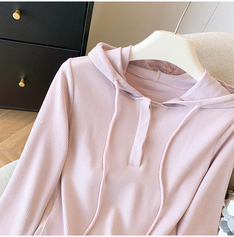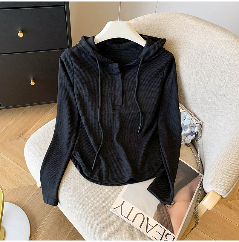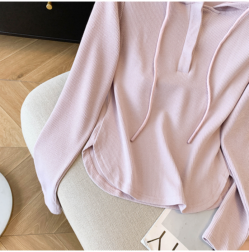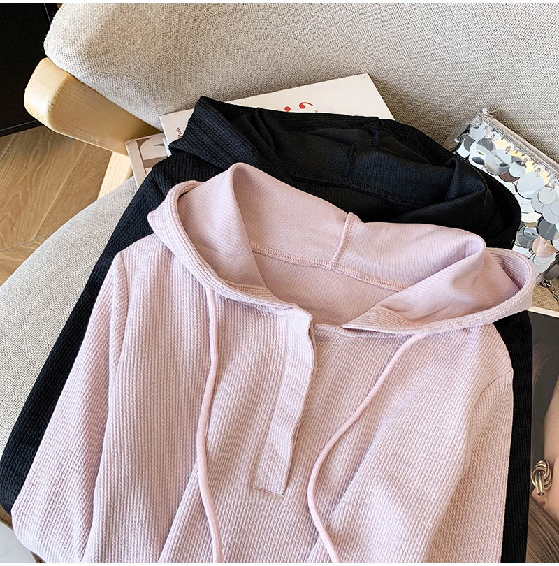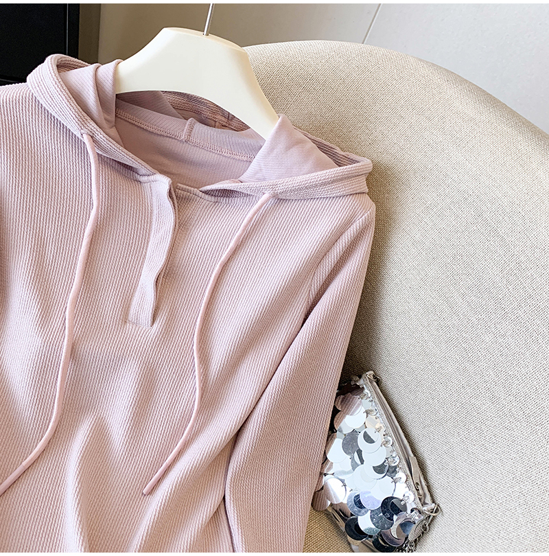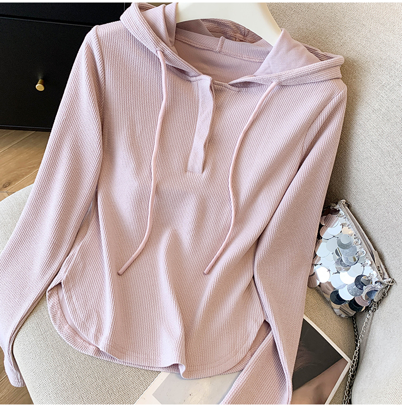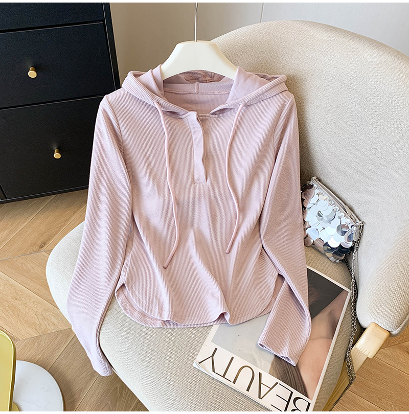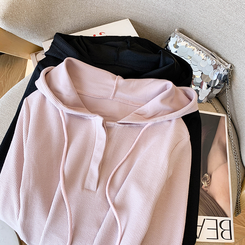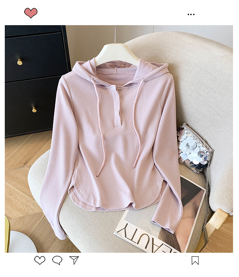 RY70149# 慵懒风连帽T恤螺纹开叉奶杏色打底衫ins风春秋软糯内搭长袖女上衣