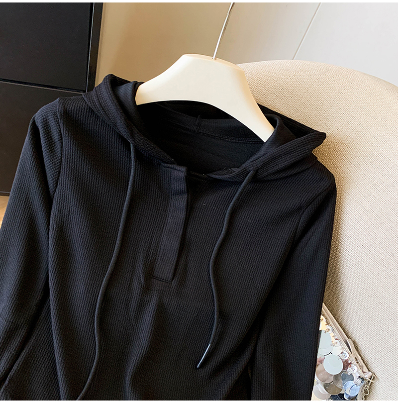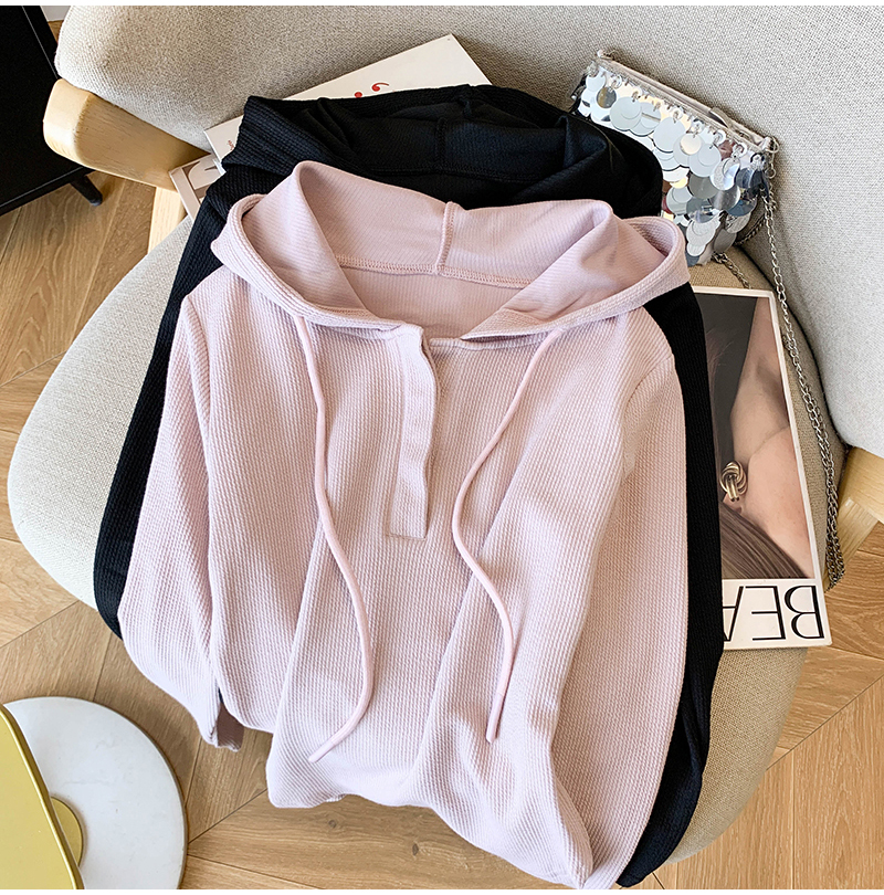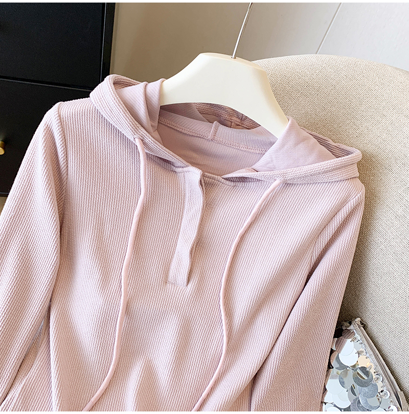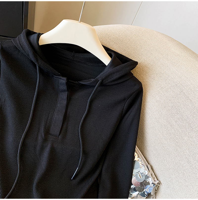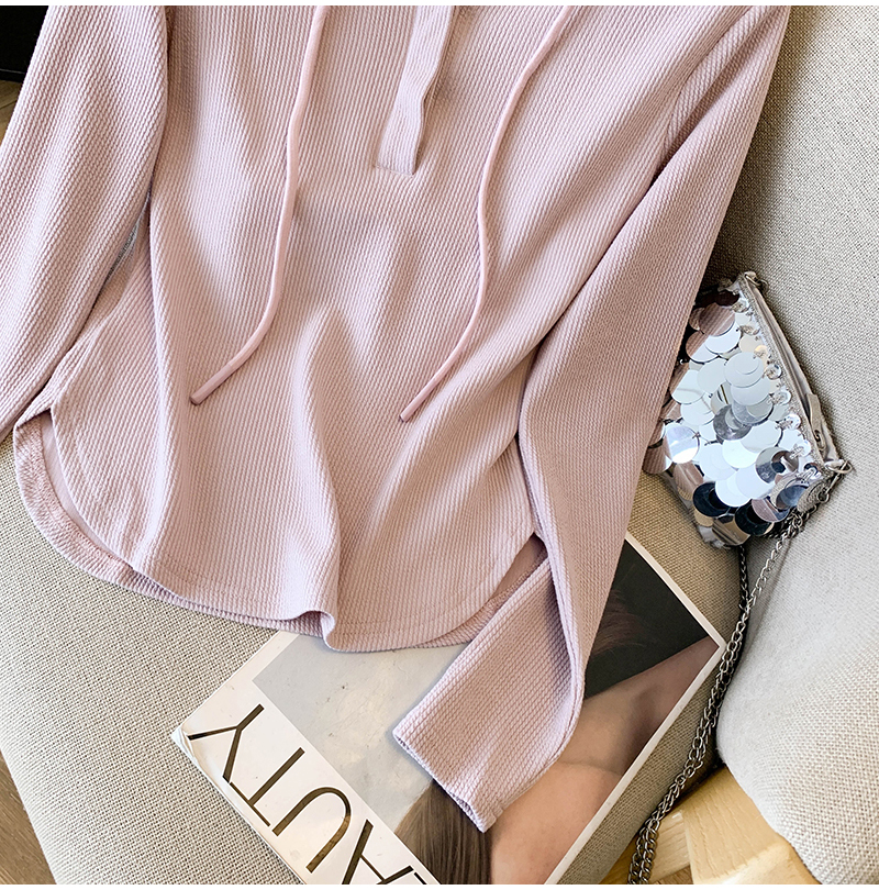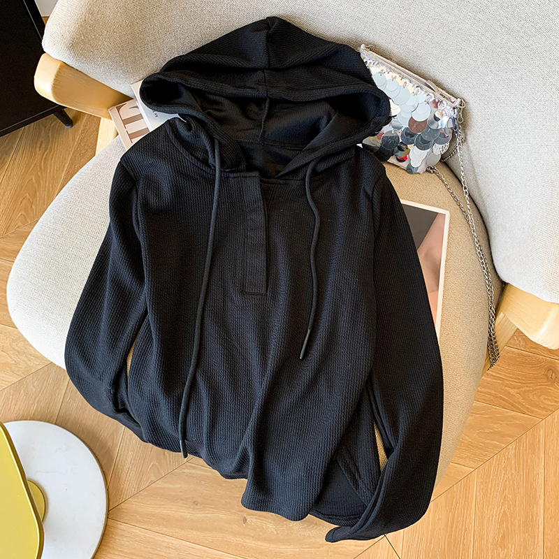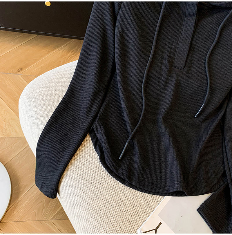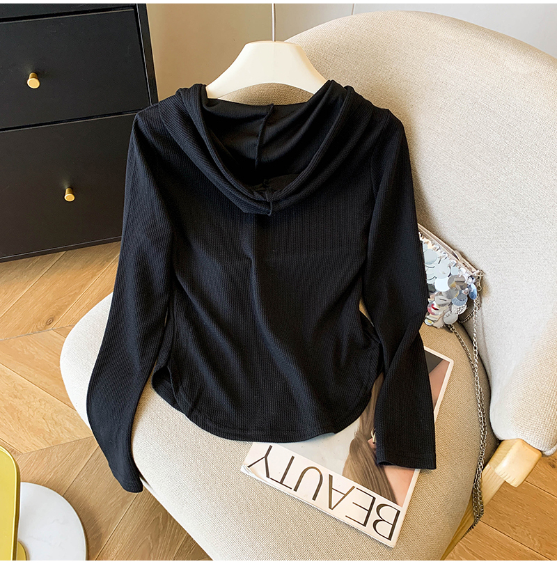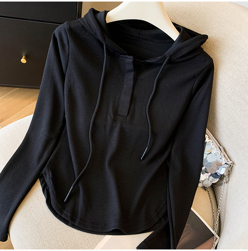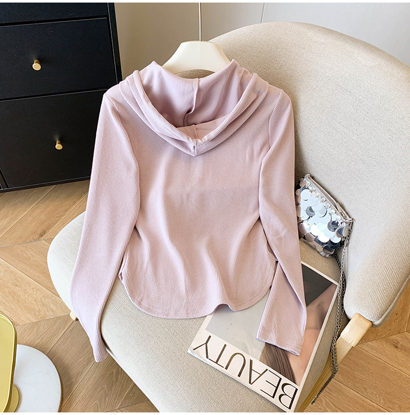 RY70149# 慵懒风连帽T恤螺纹开叉奶杏色打底衫ins风春秋软糯内搭长袖女上衣