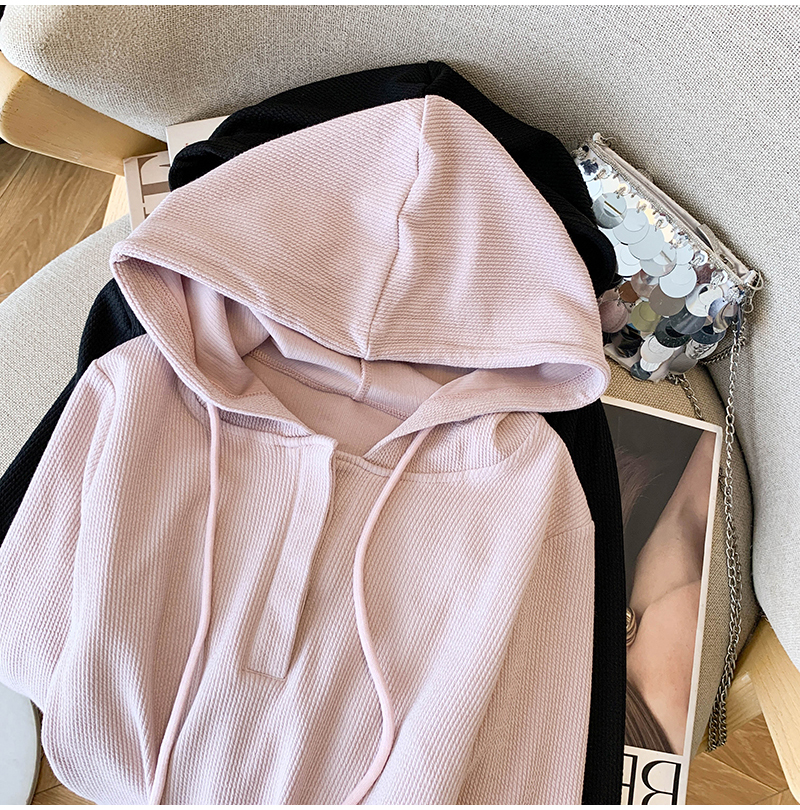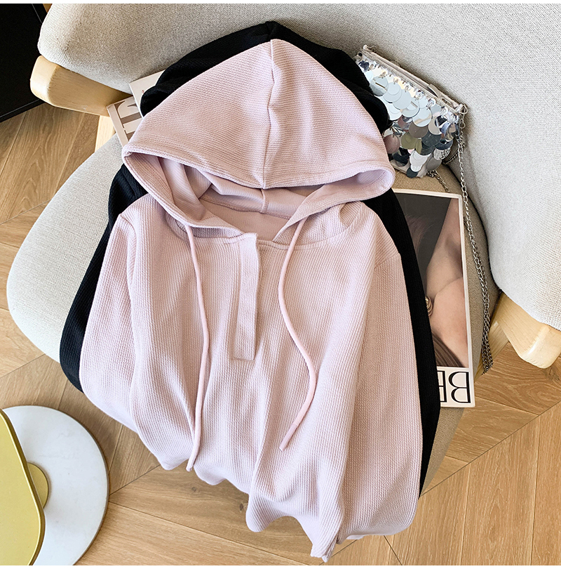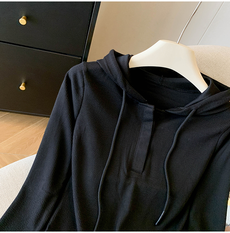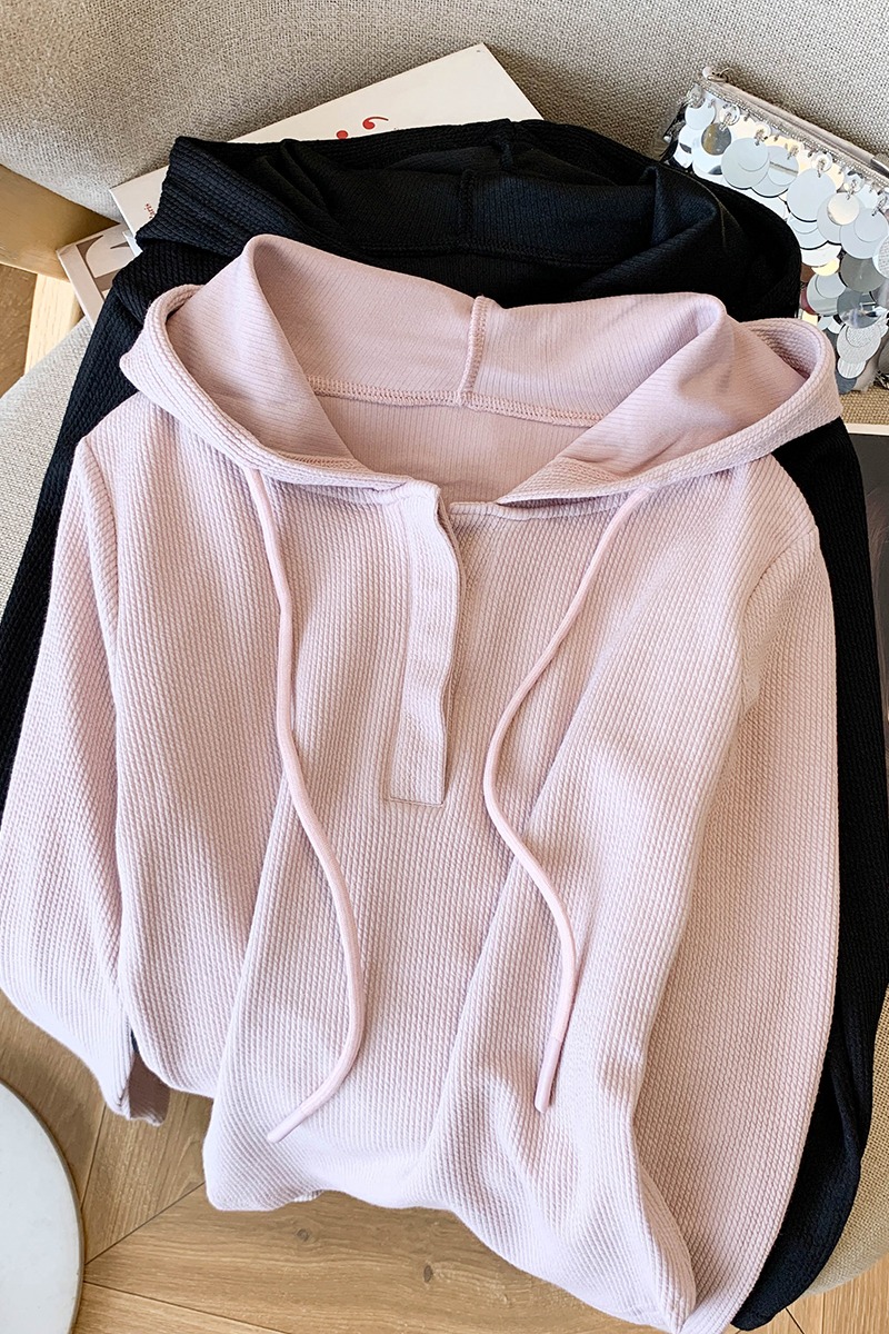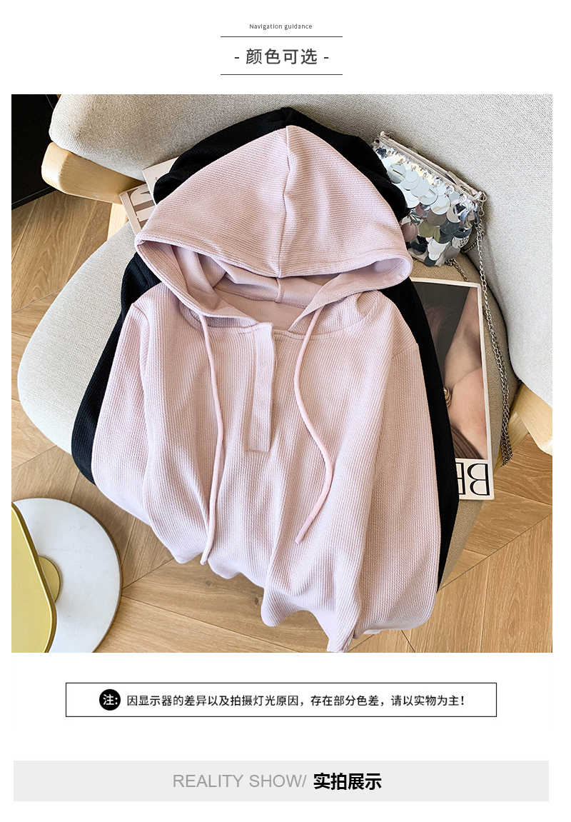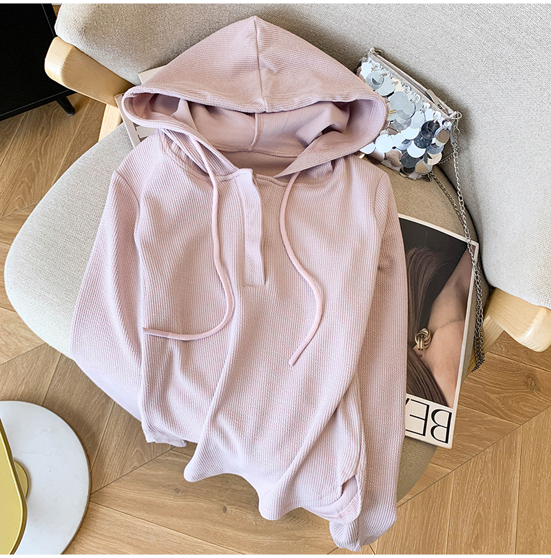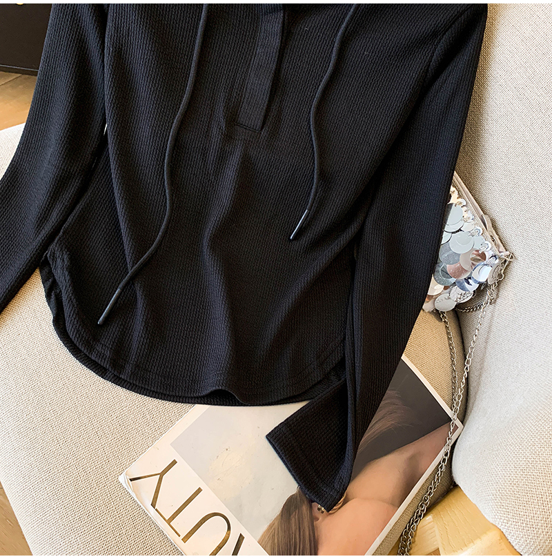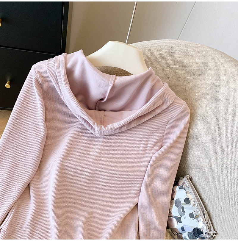 RY70149# 慵懒风连帽T恤螺纹开叉奶杏色打底衫ins风春秋软糯内搭长袖女上衣