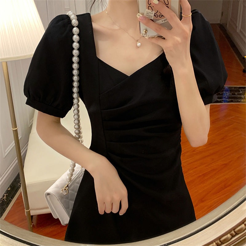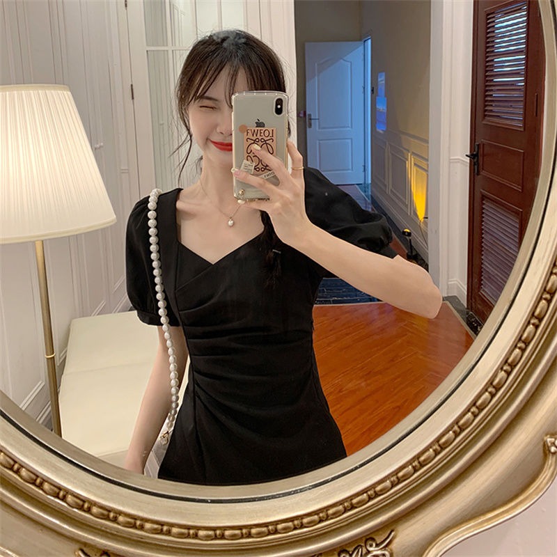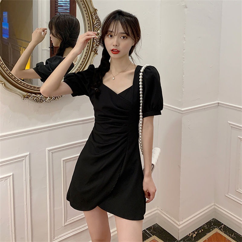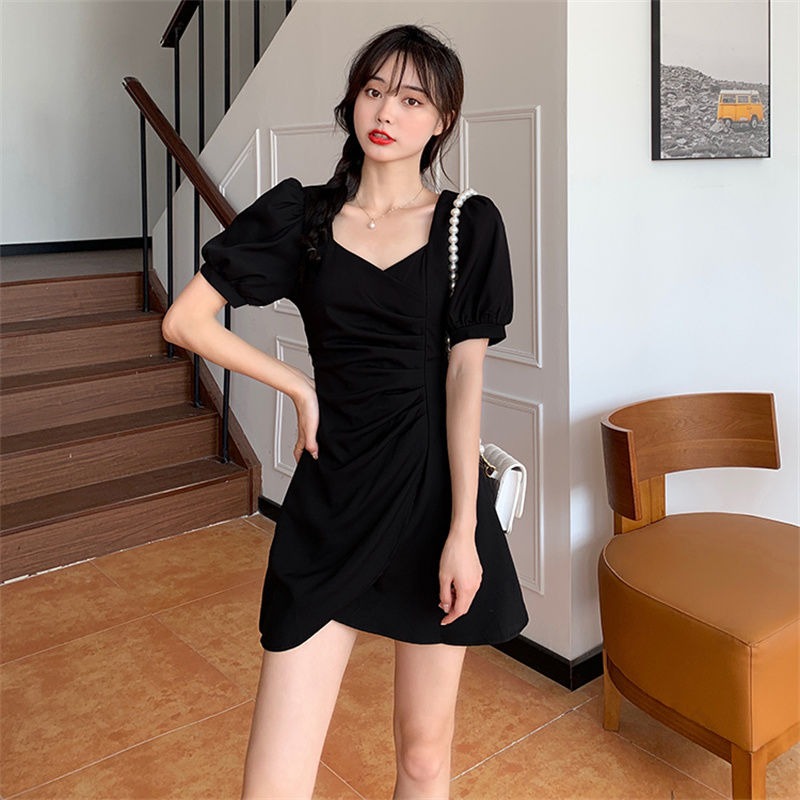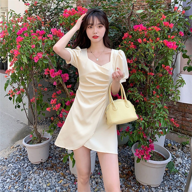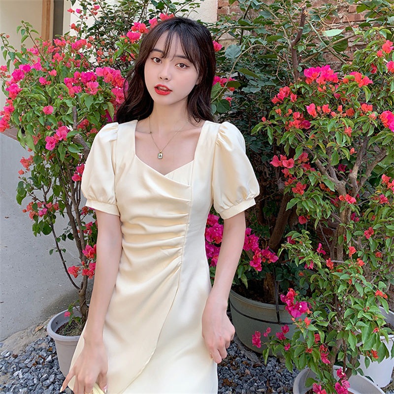 RY134# 法式方领褶皱泡泡袖不规则连衣裙女2026夏新款小个子收腰显瘦裙子
