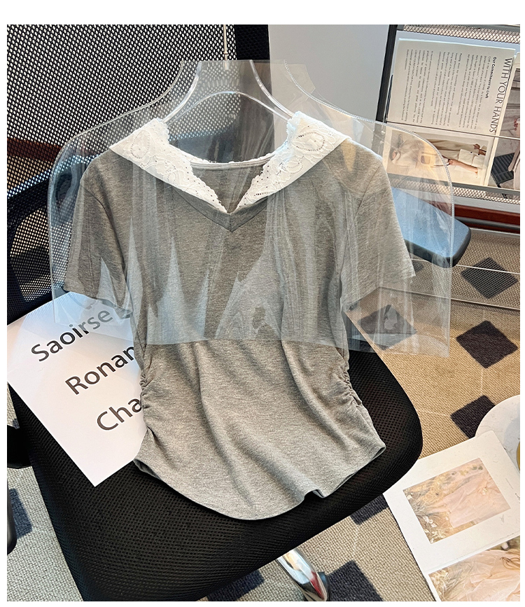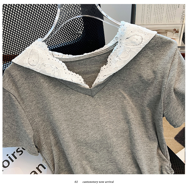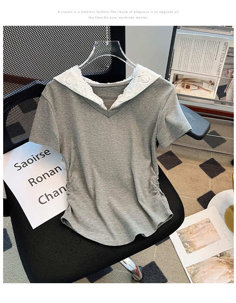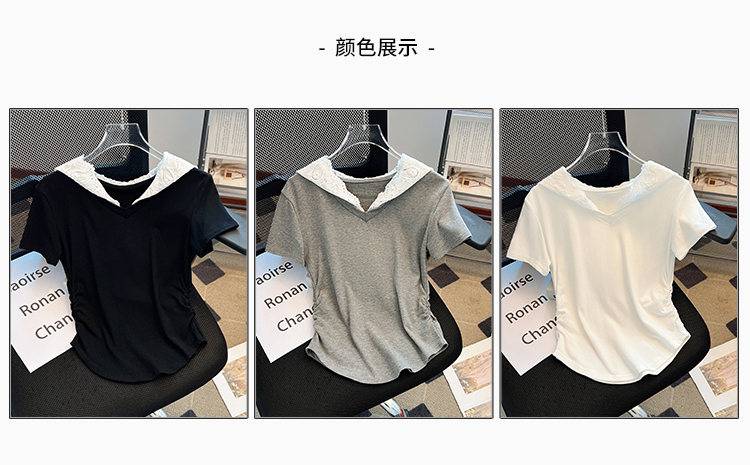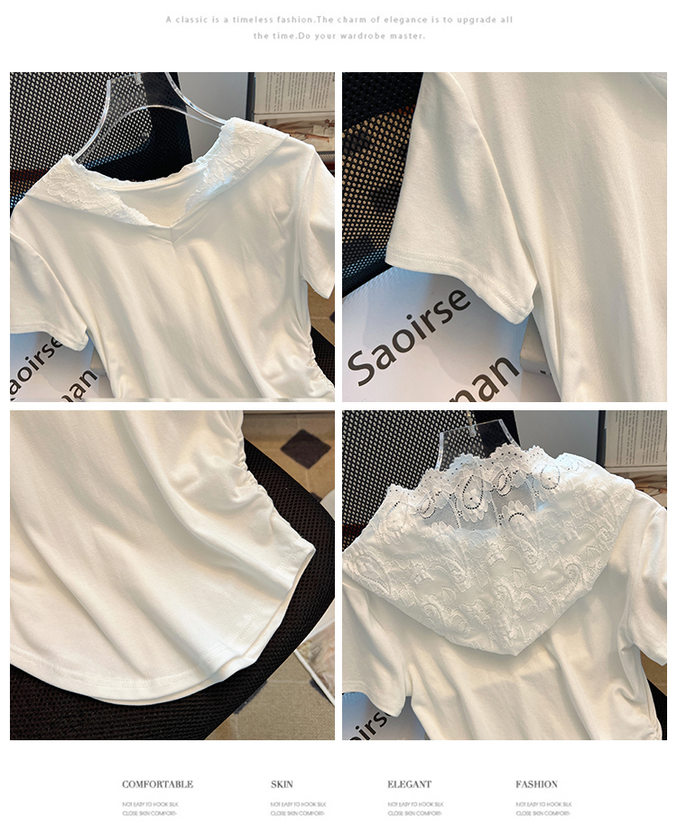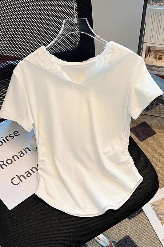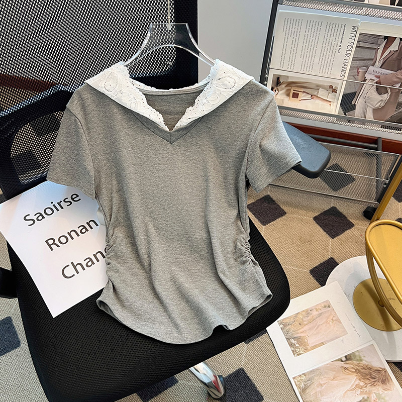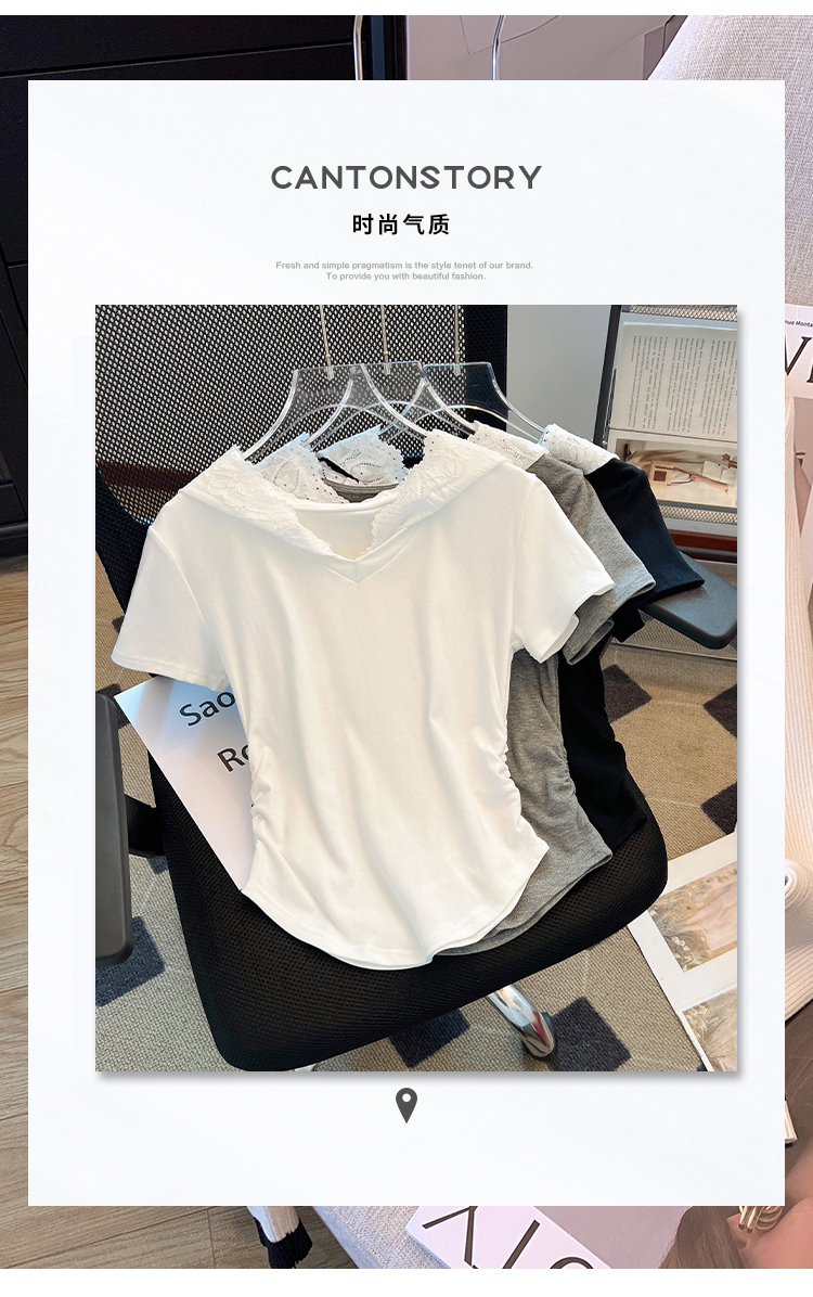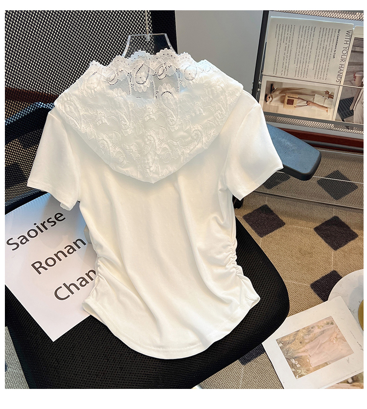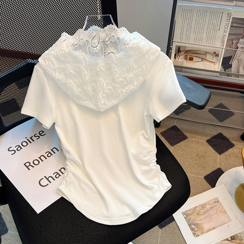 RY199# 实拍春夏新款连帽蕾丝V领短袖T恤女褶皱修身显瘦甜酷上衣
