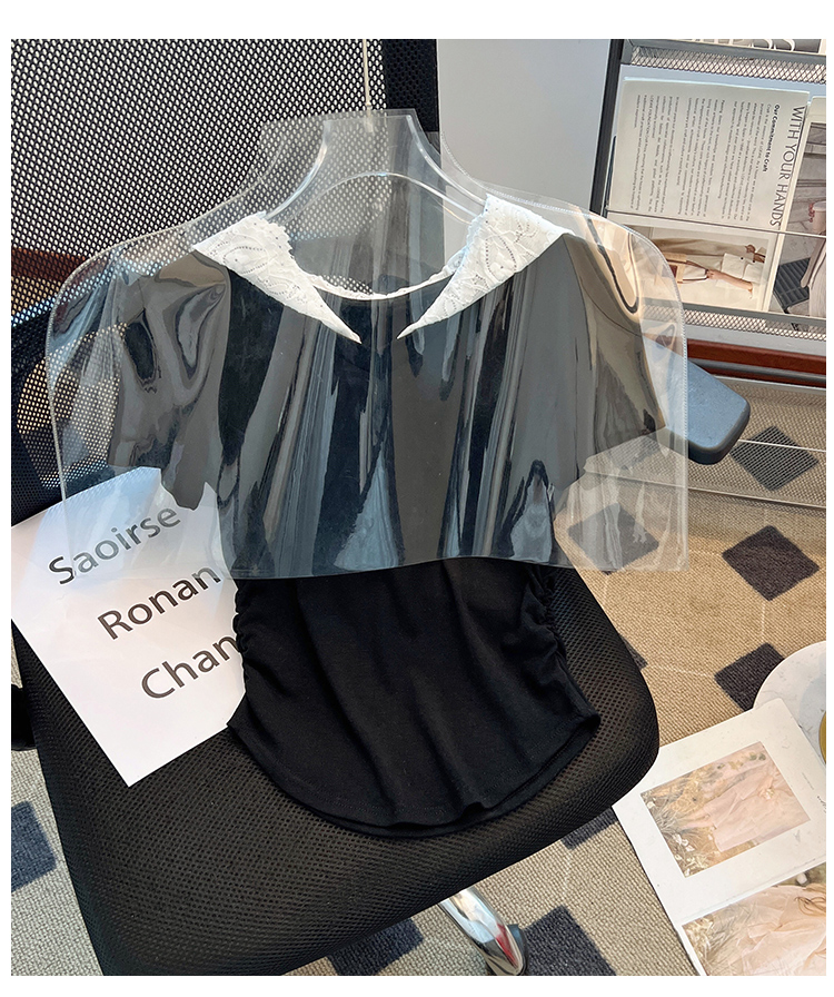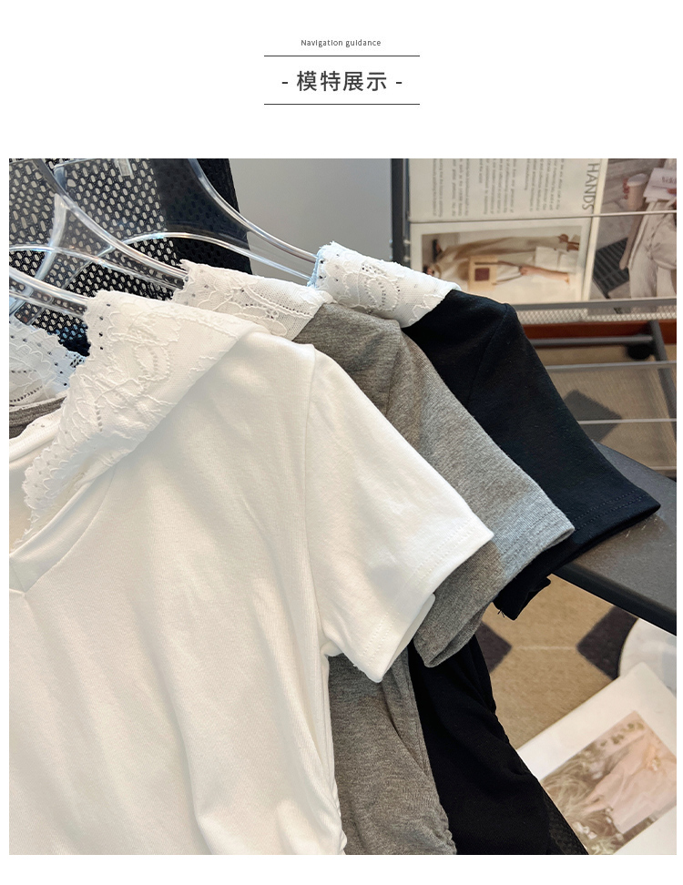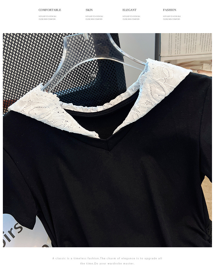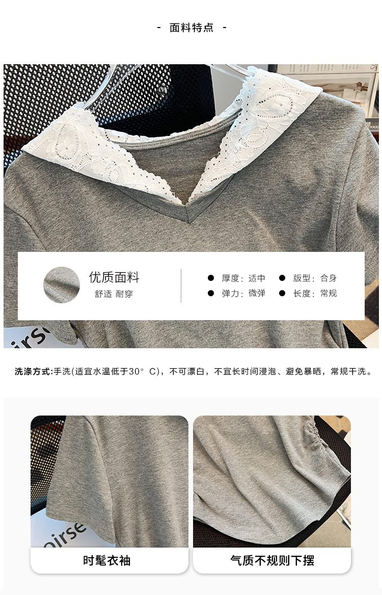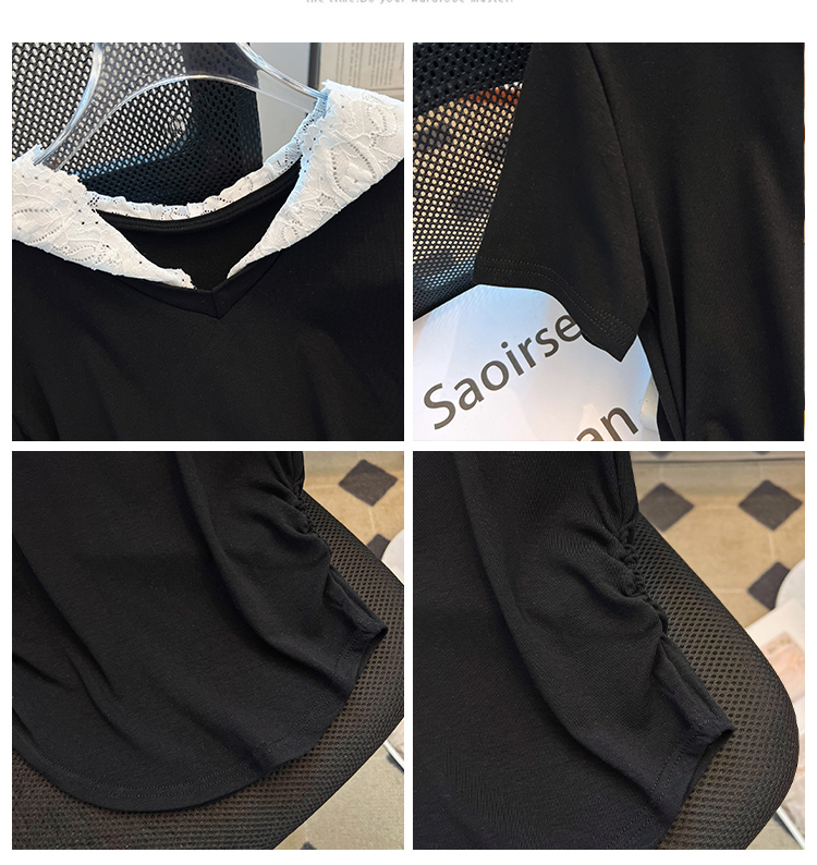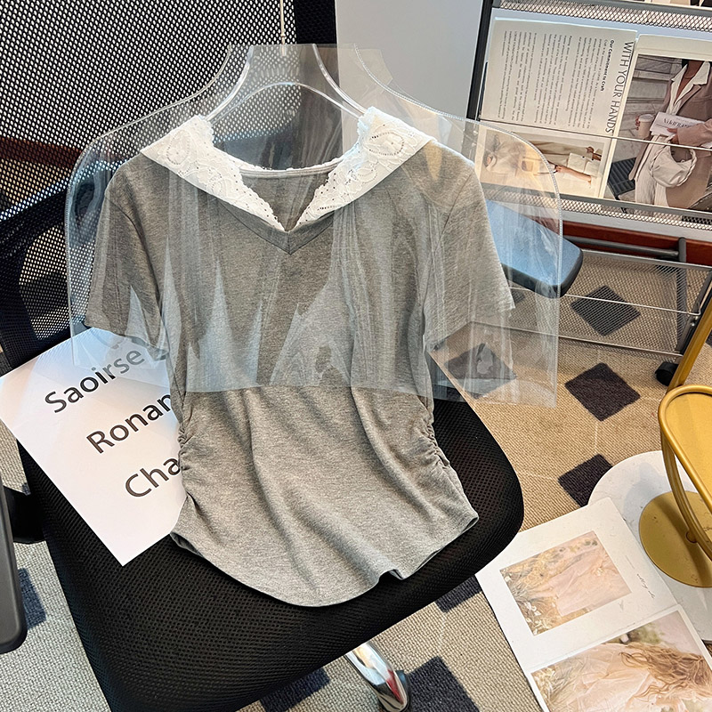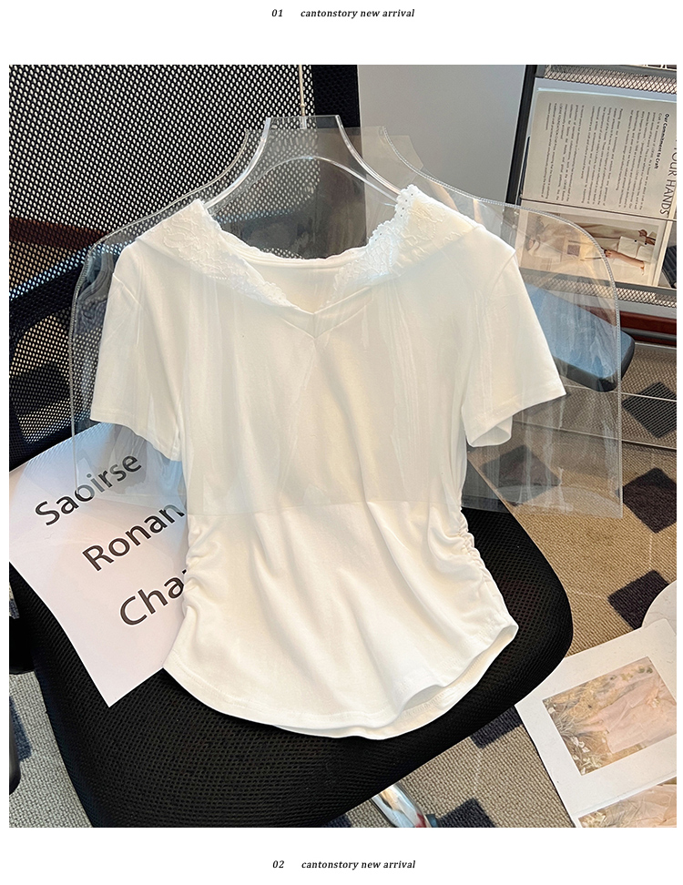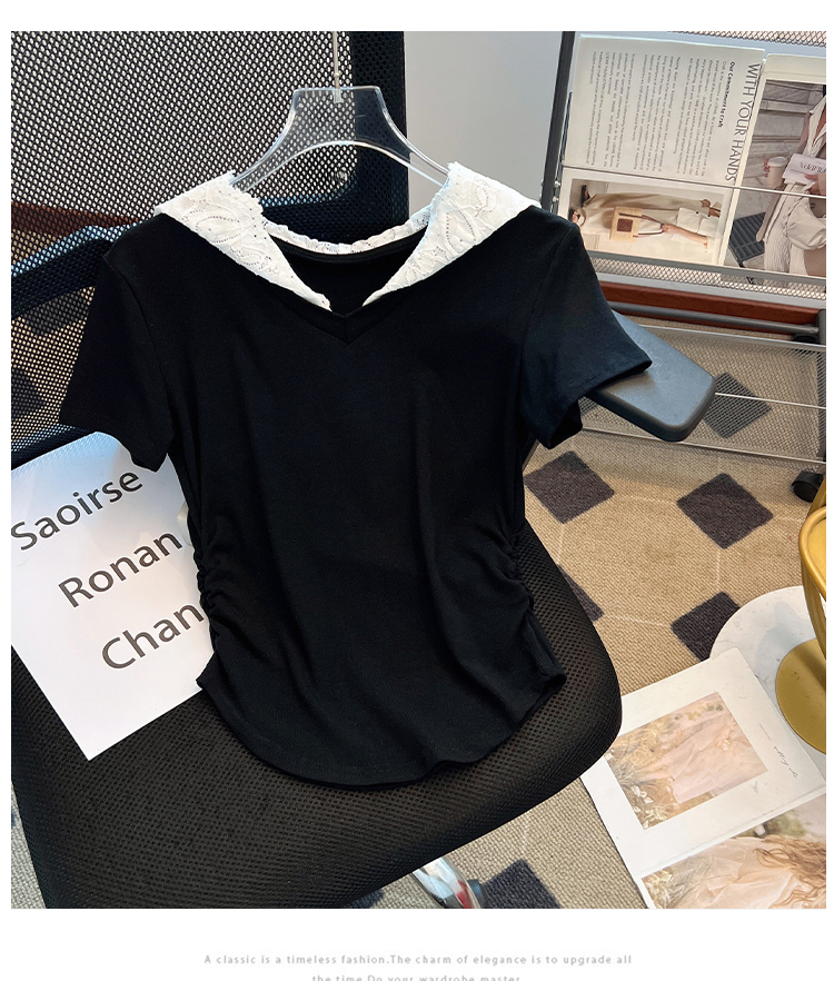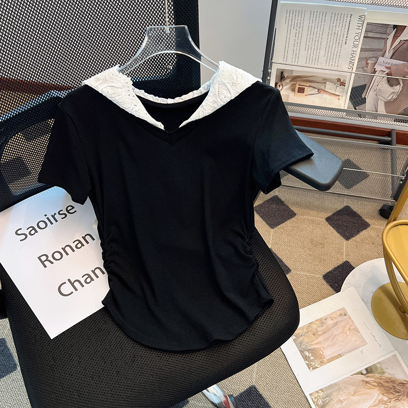 RY199# 实拍春夏新款连帽蕾丝V领短袖T恤女褶皱修身显瘦甜酷上衣