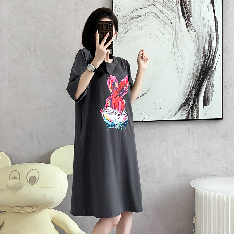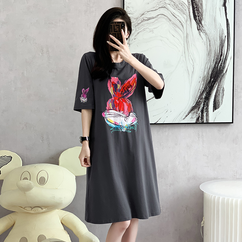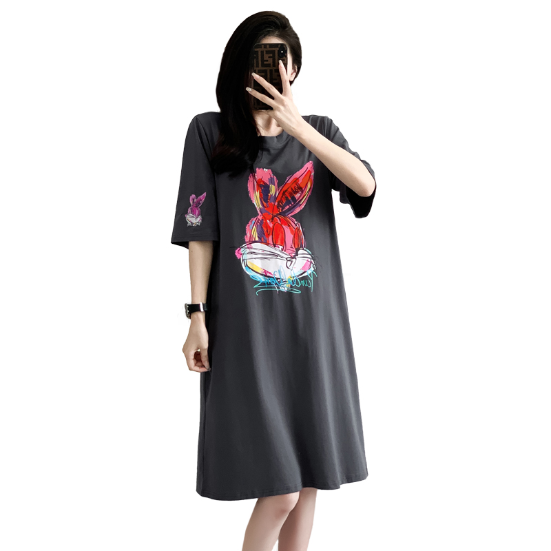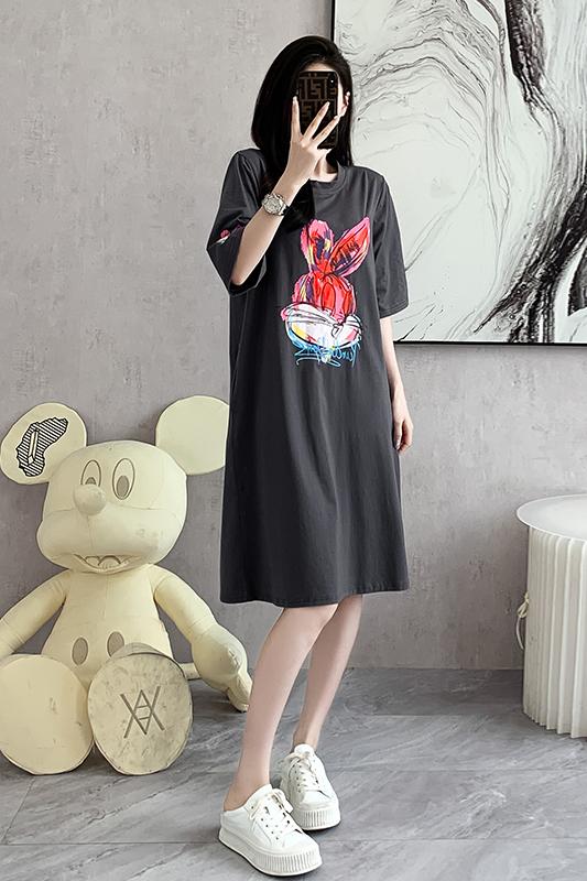 RY269# 实拍2026夏季新款连衣裙中长款T恤裙印花兔子大码连衣裙女