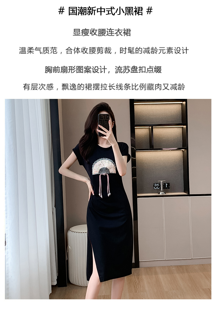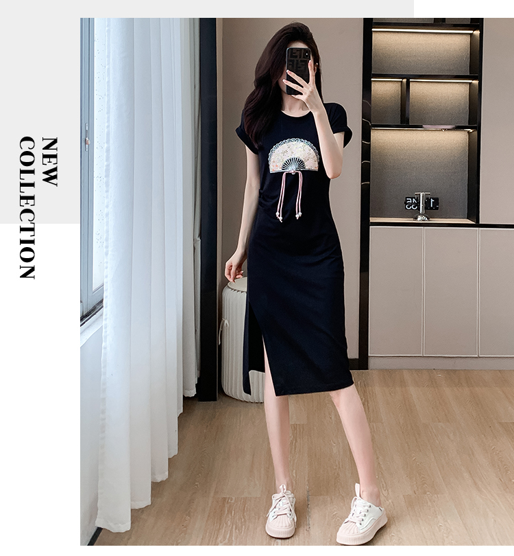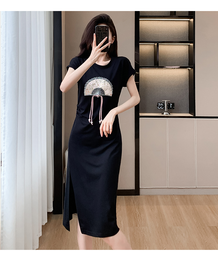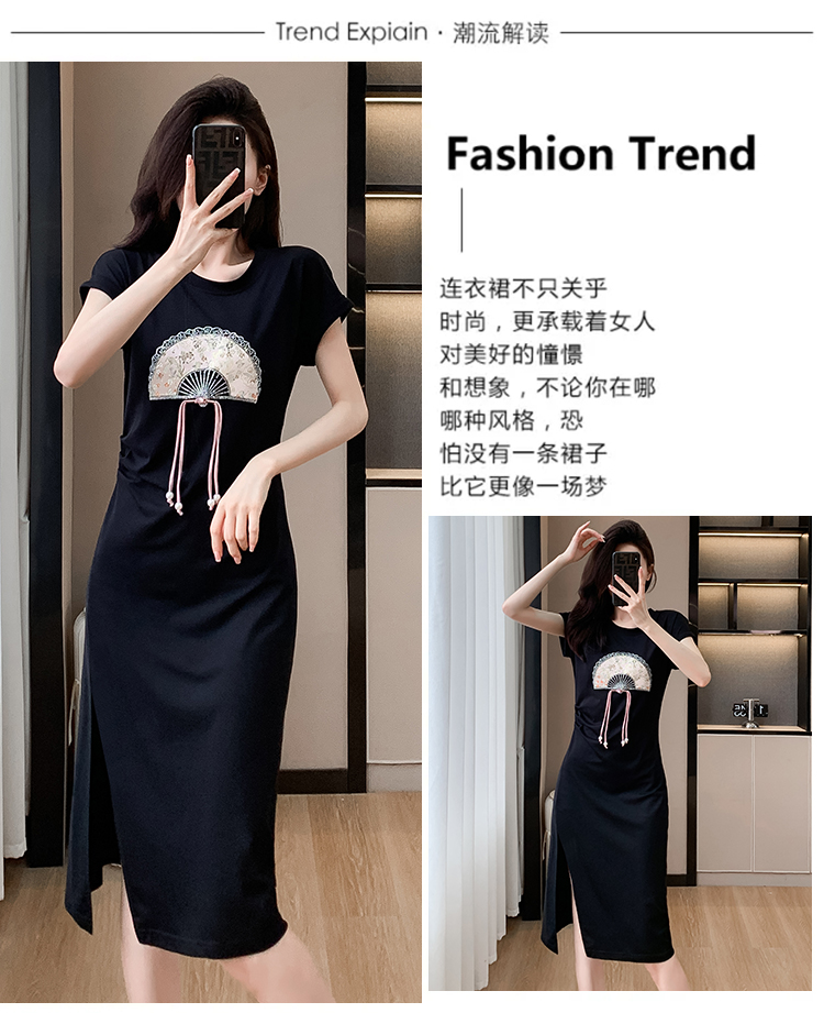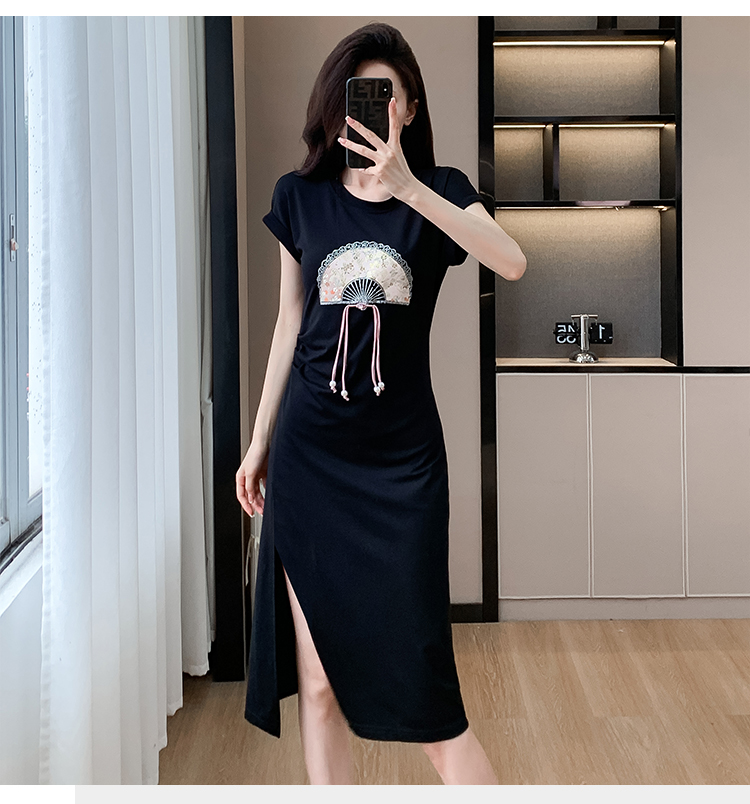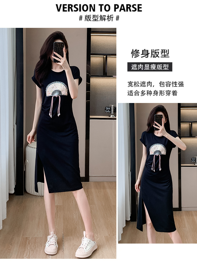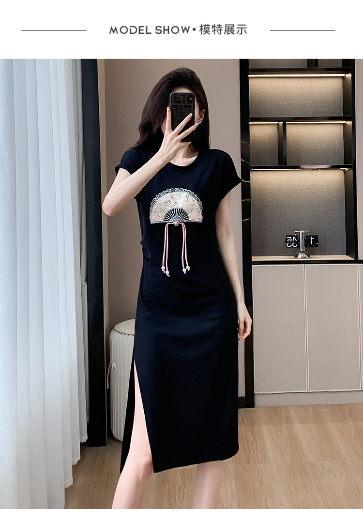 RY281# 实拍国风连衣裙扇子水钻皱褶开叉中长款大T恤裙女夏