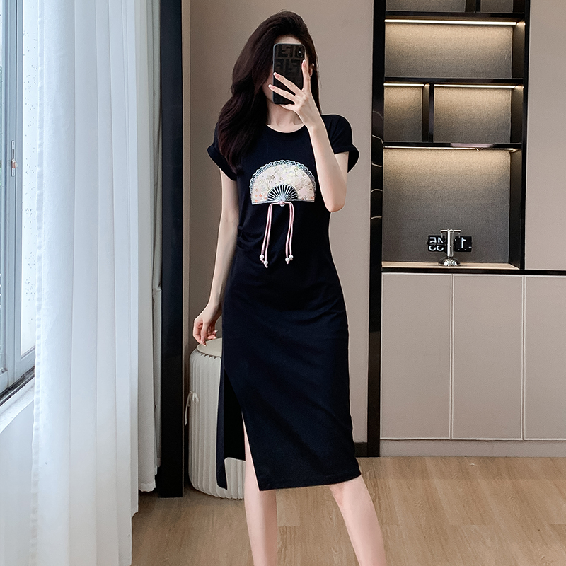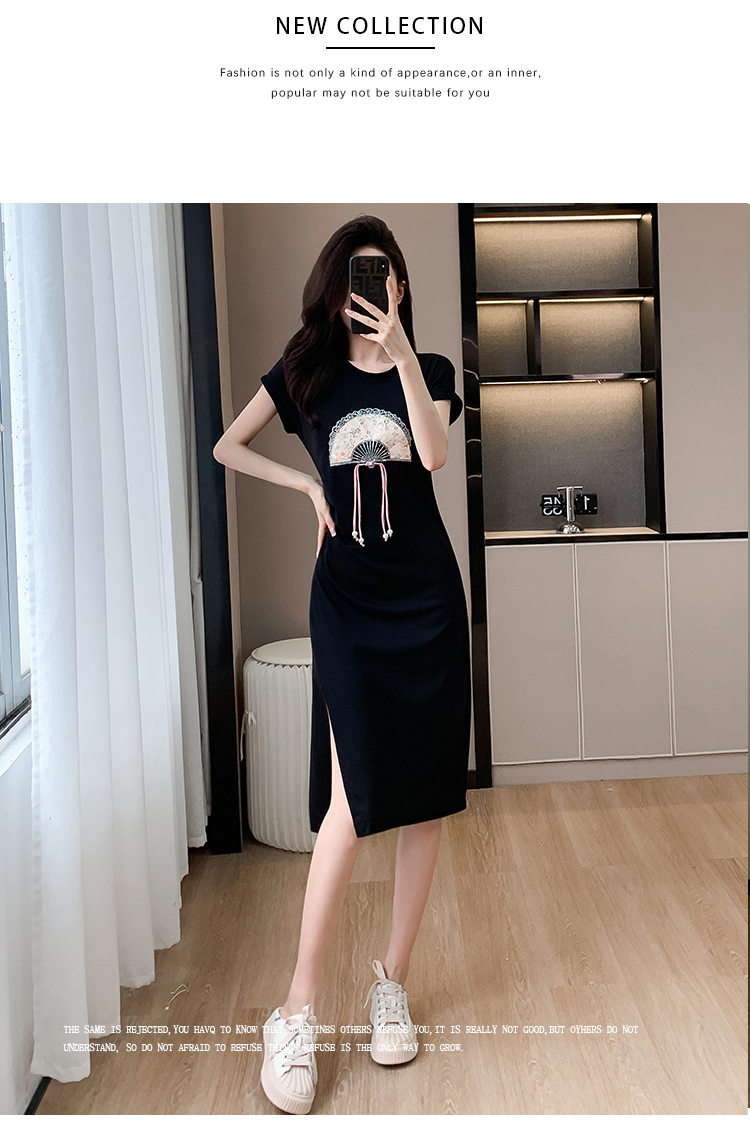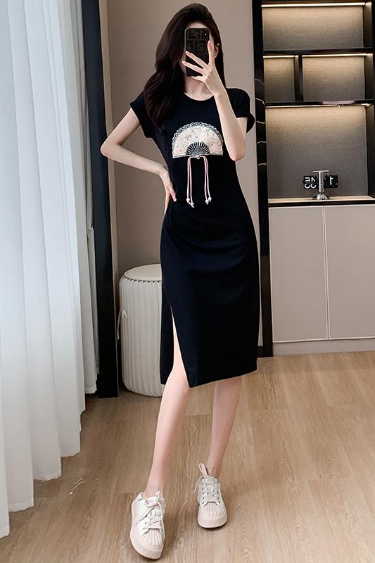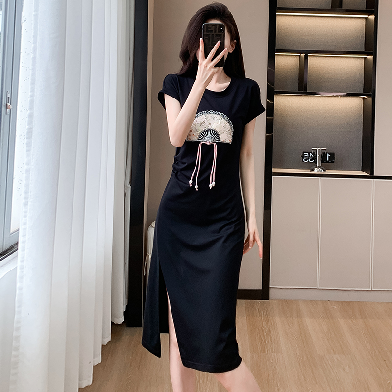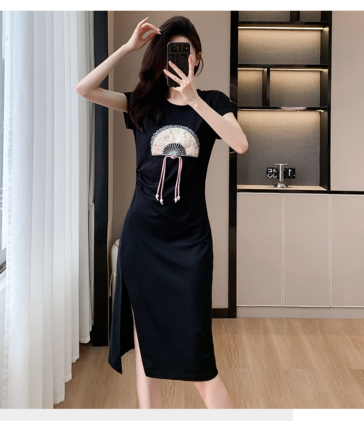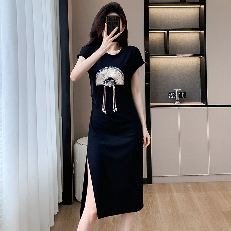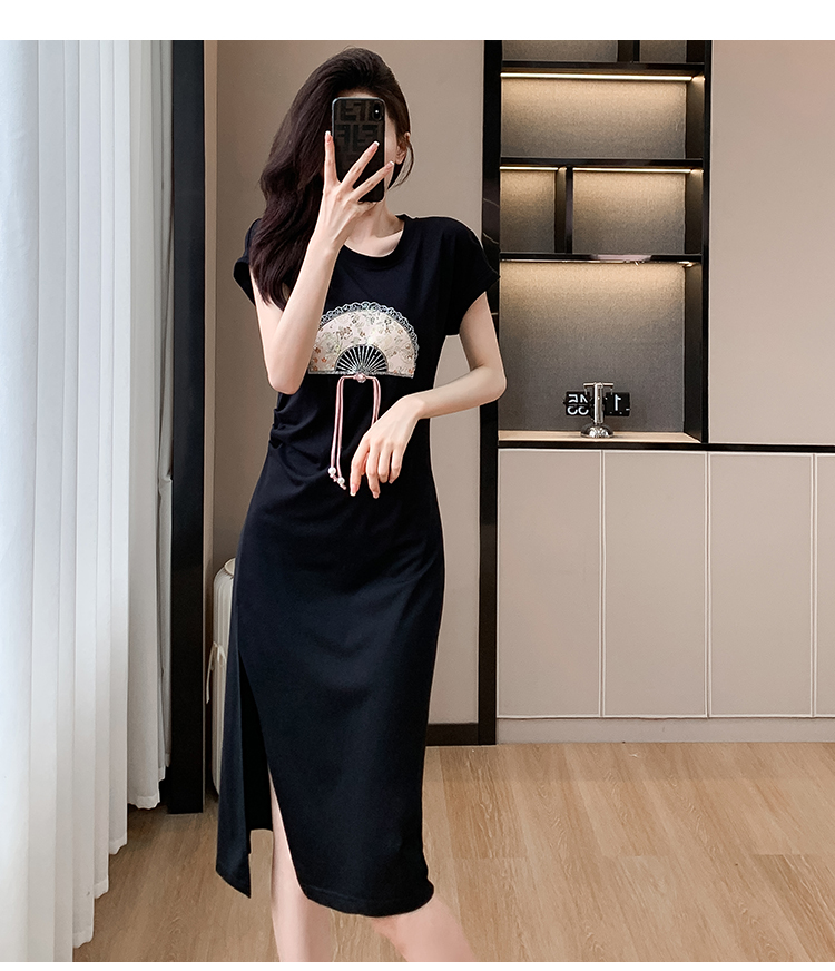 RY281# 实拍国风连衣裙扇子水钻皱褶开叉中长款大T恤裙女夏