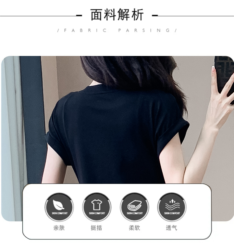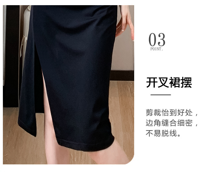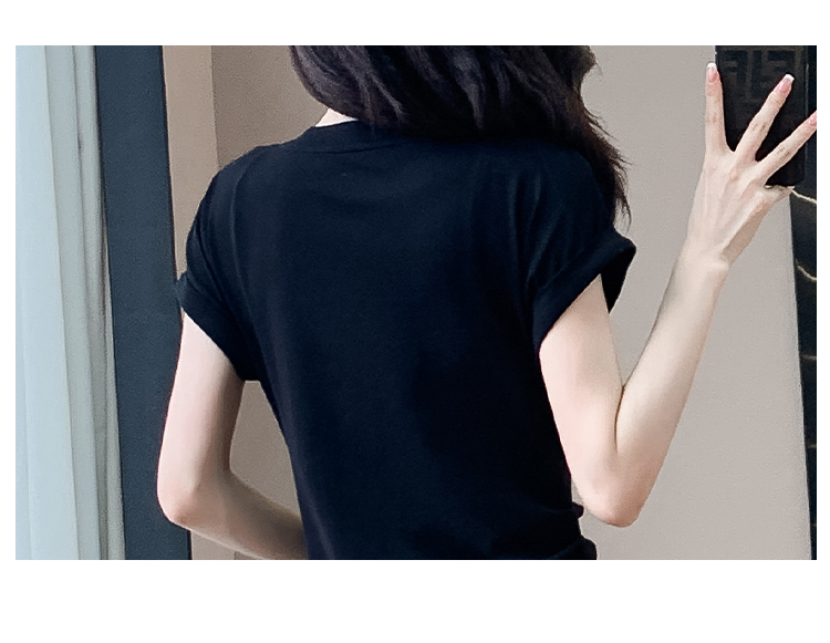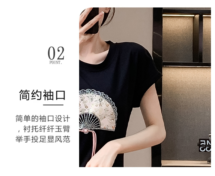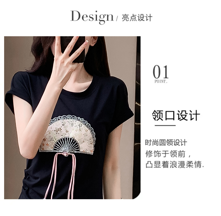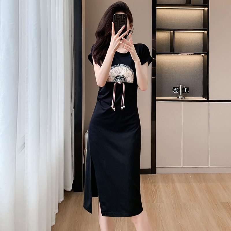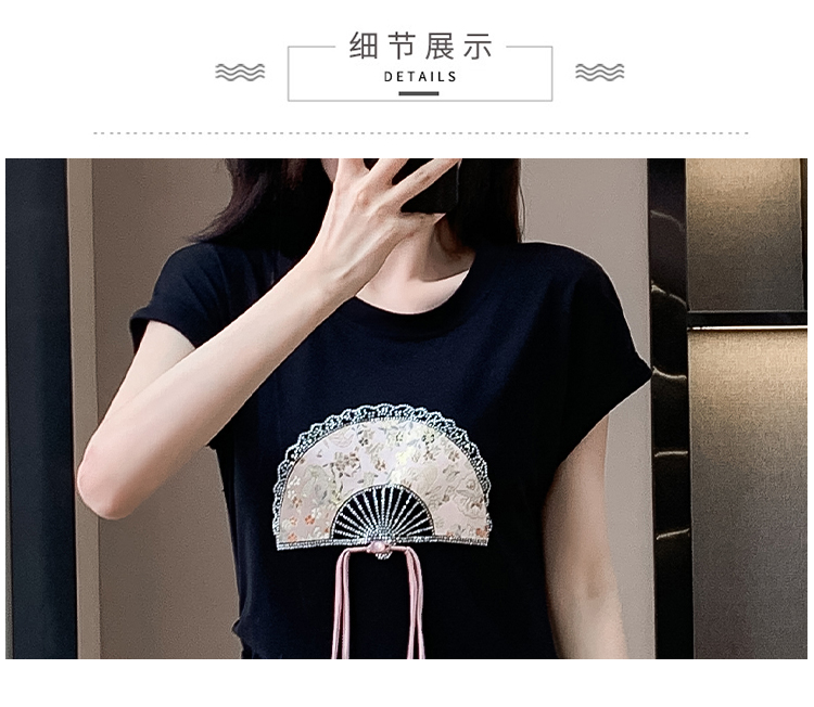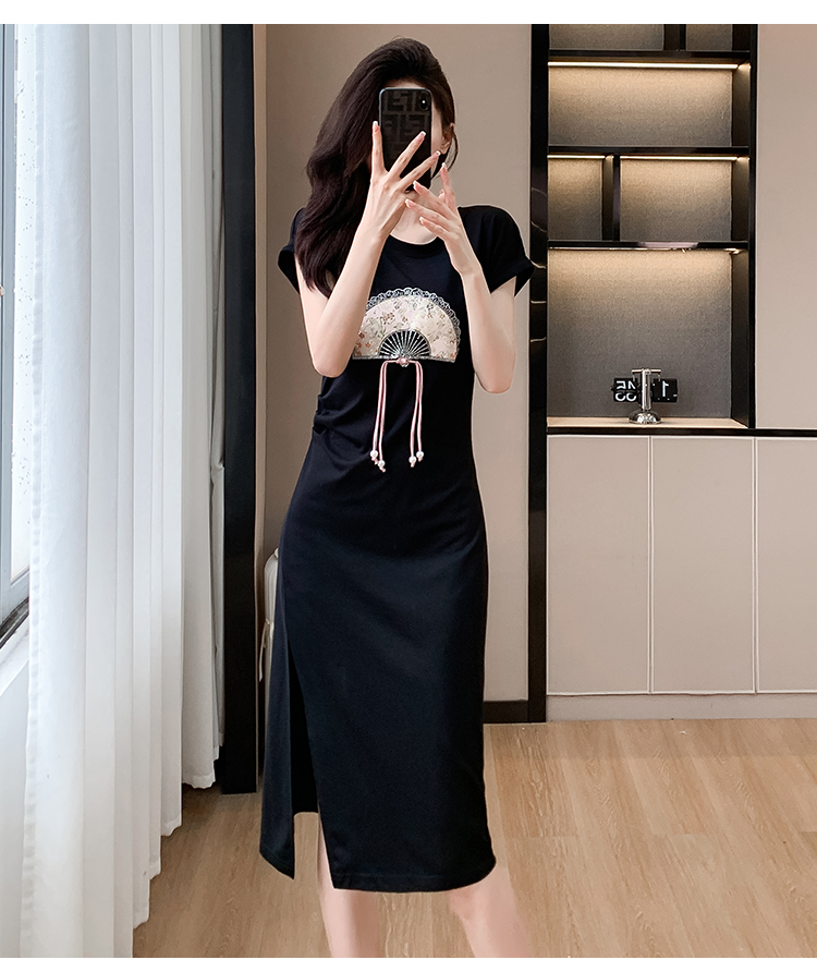 RY281# 实拍国风连衣裙扇子水钻皱褶开叉中长款大T恤裙女夏