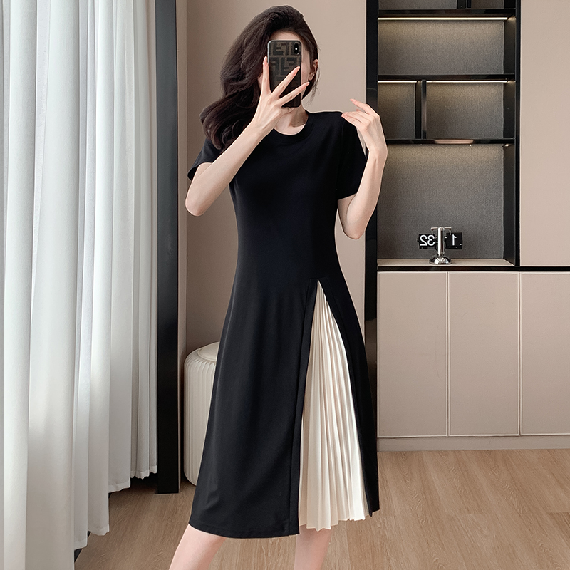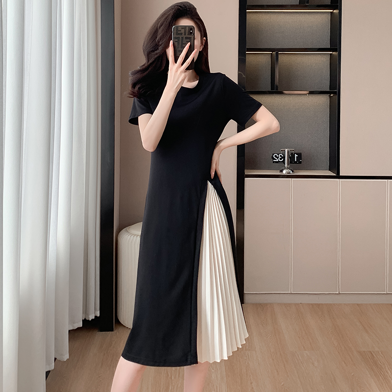 RY282# 实拍撞色连衣裙女夏皱褶拼接设计感遮肉显瘦大码中长款T恤裙女
