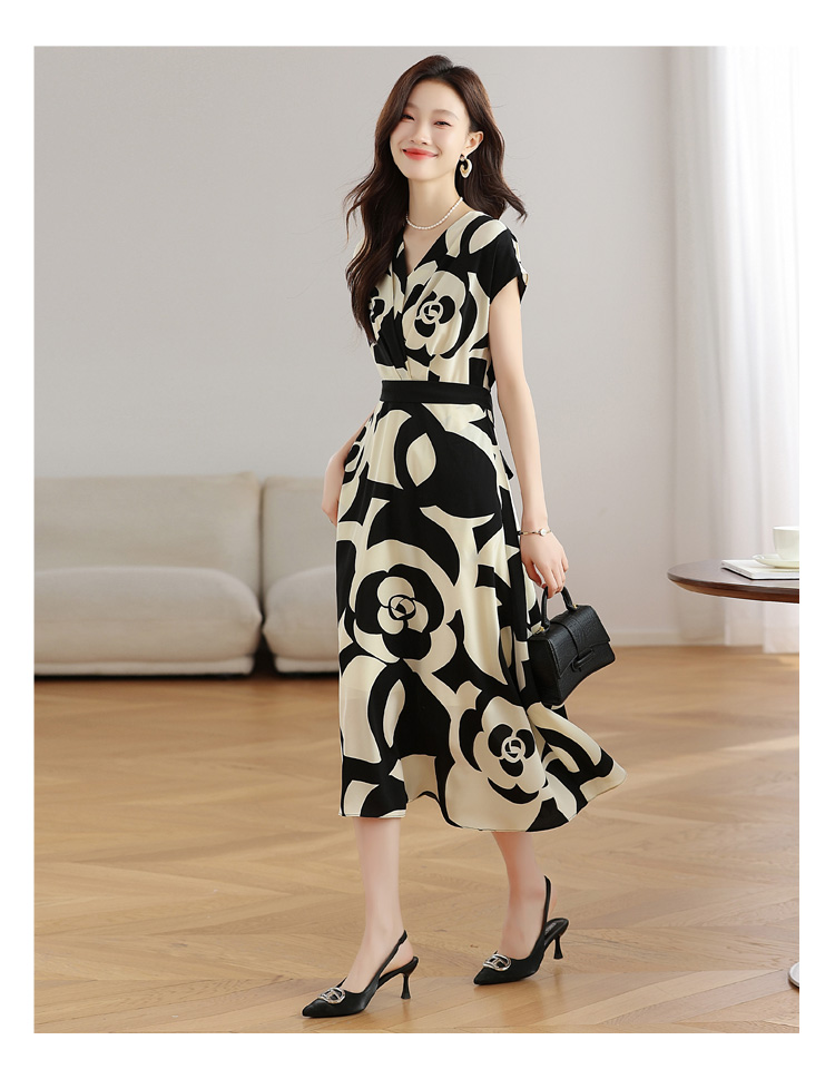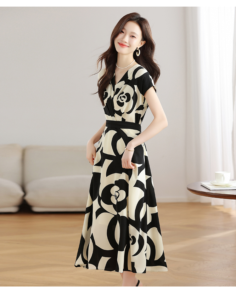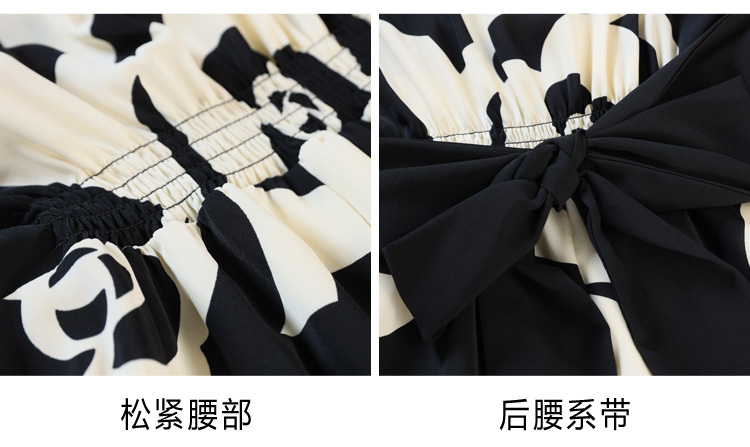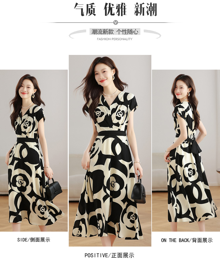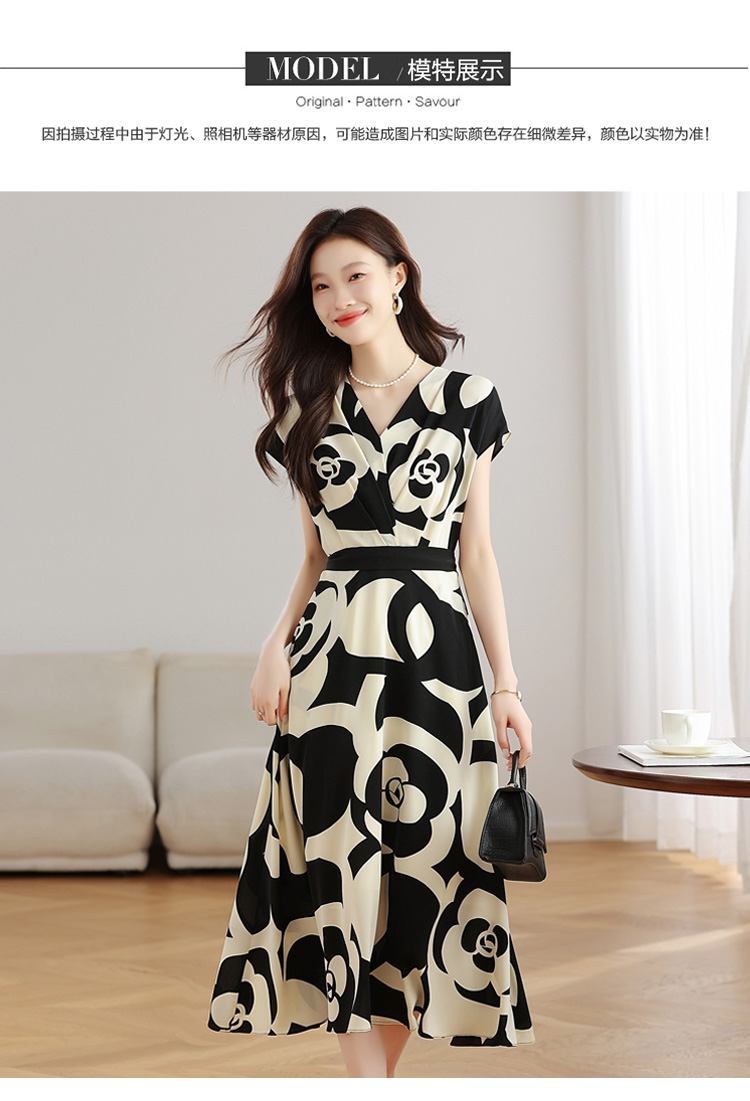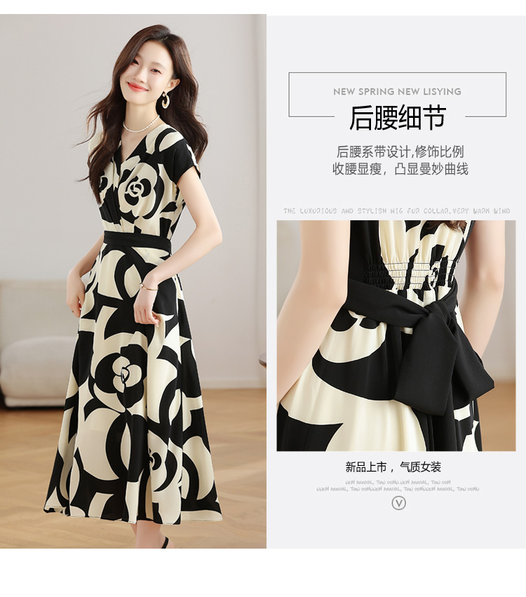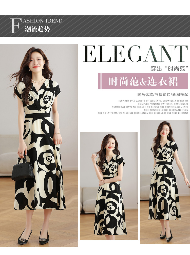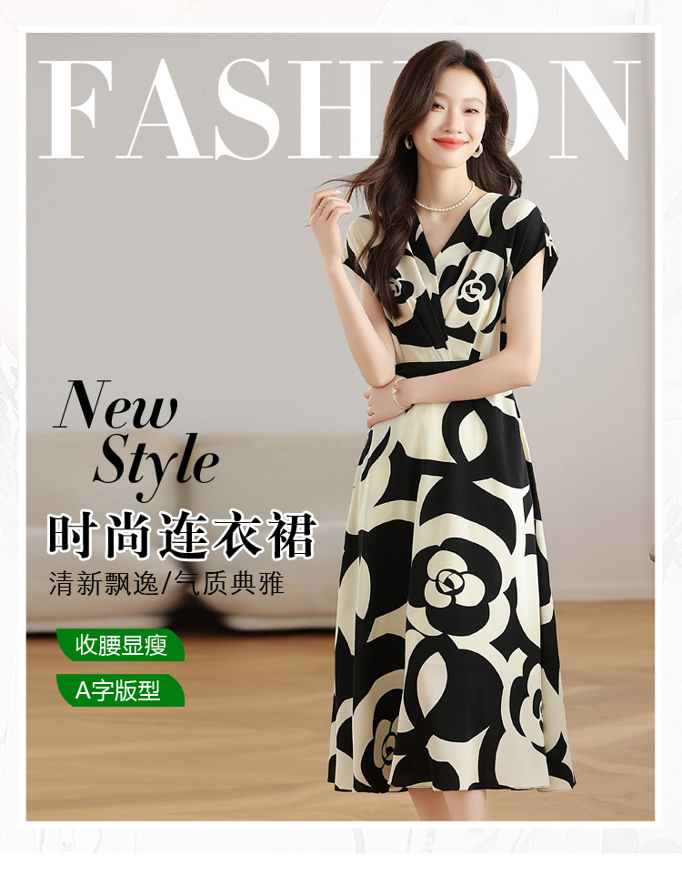 RY307# 实拍夏季新款女法式v领收腰气质a字裙温柔风印花中长款雪纺连衣裙