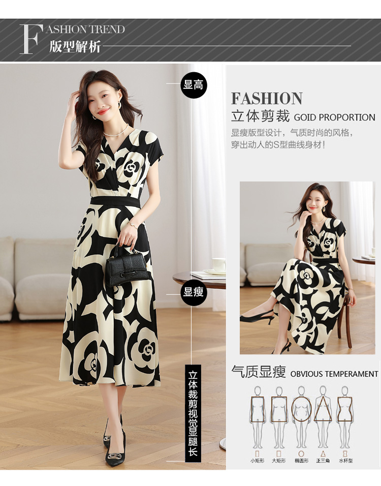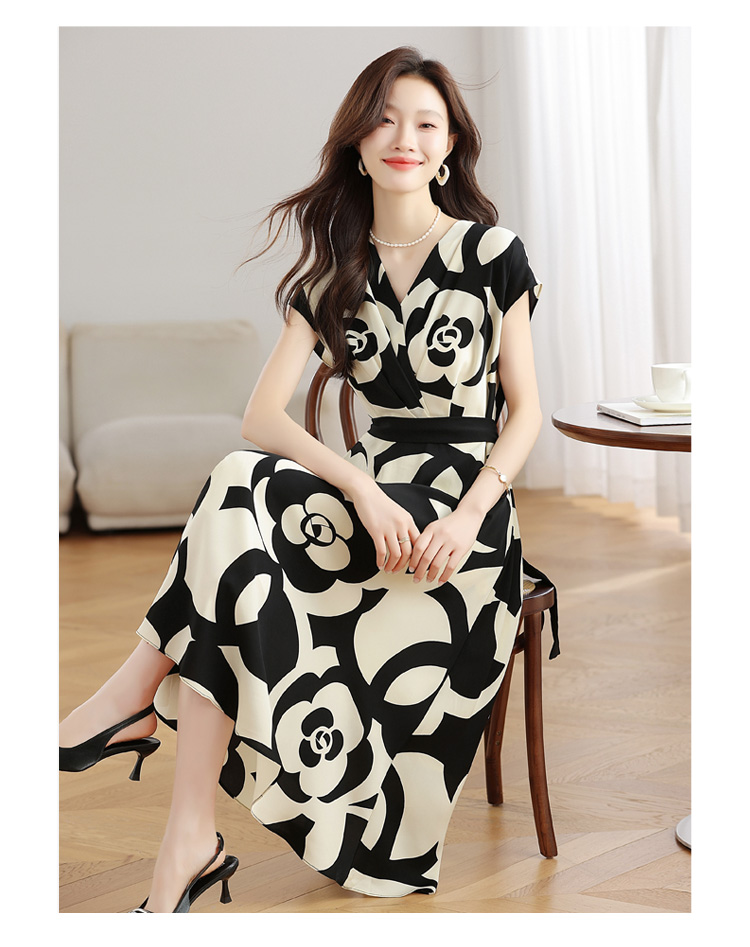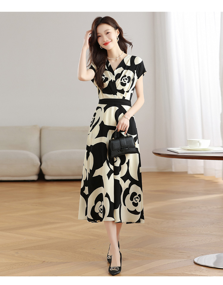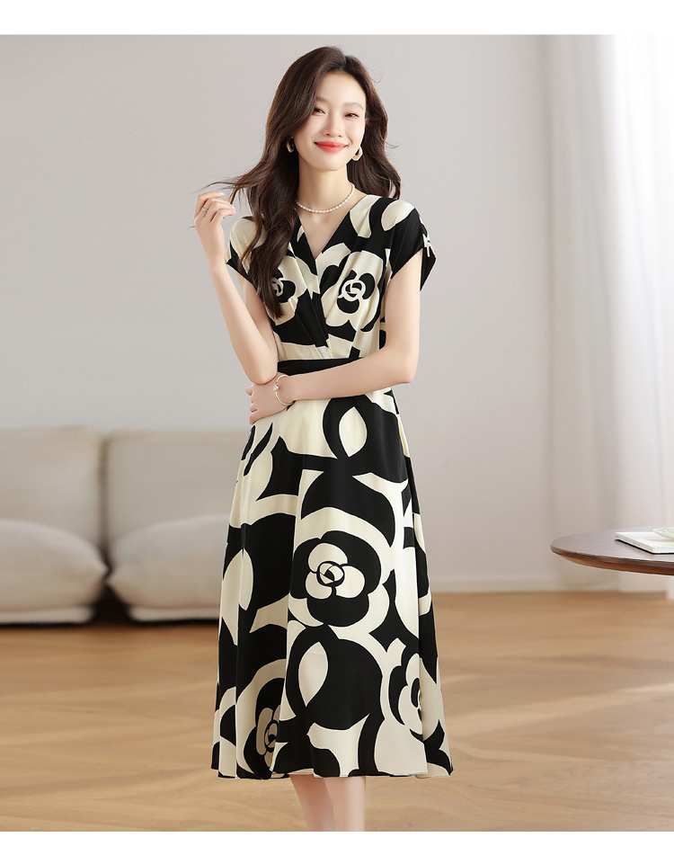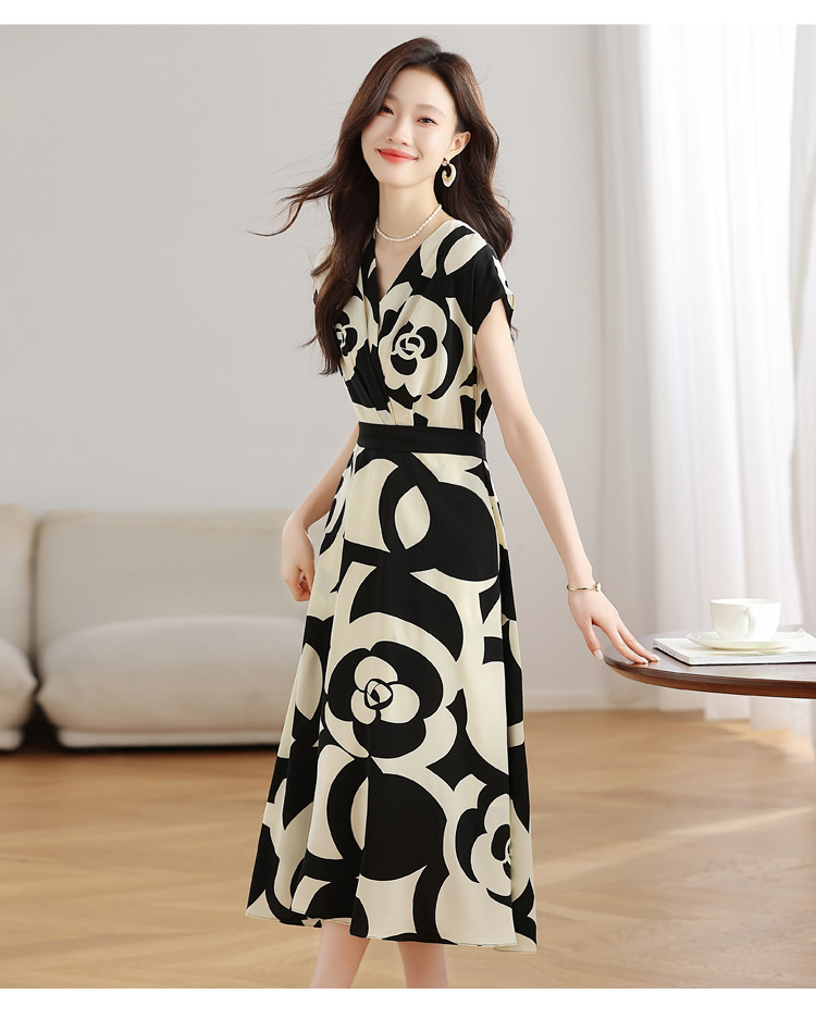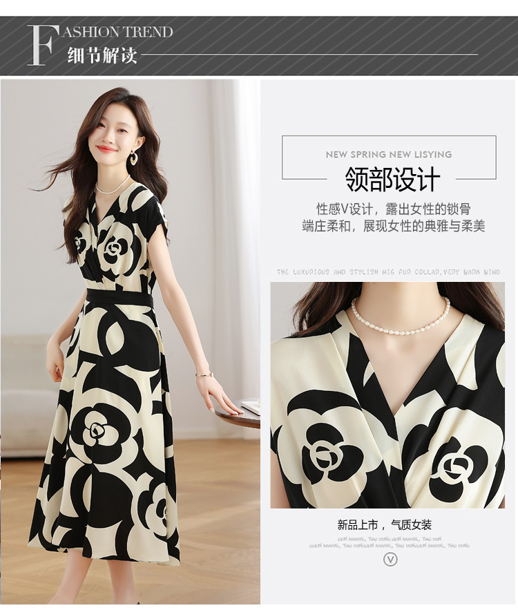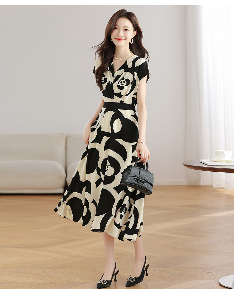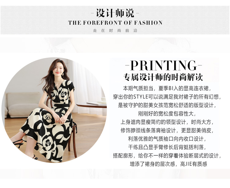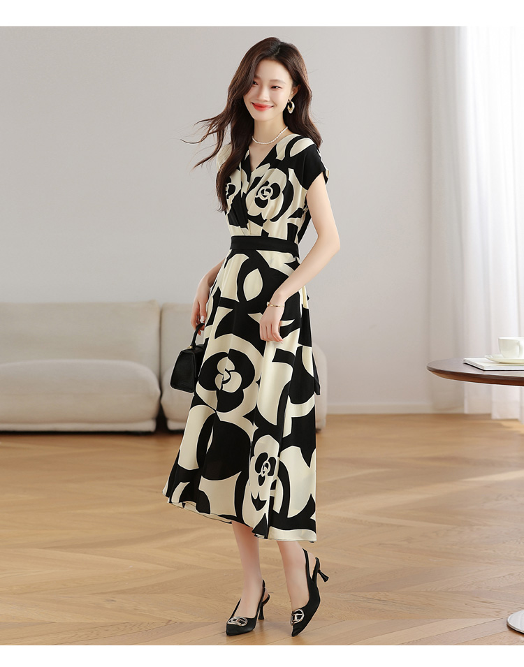 RY307# 实拍夏季新款女法式v领收腰气质a字裙温柔风印花中长款雪纺连衣裙