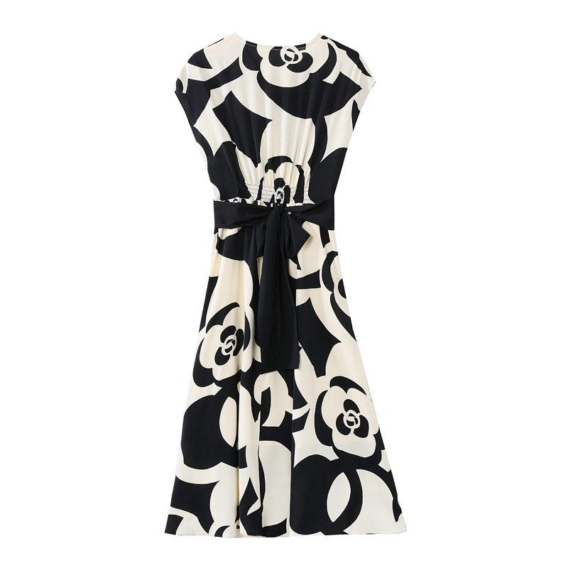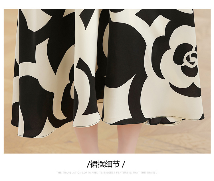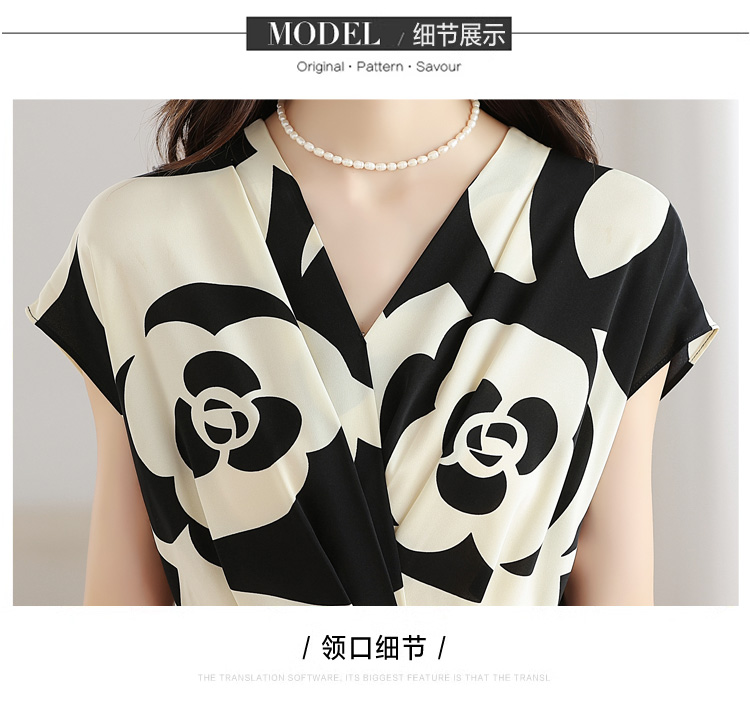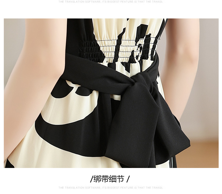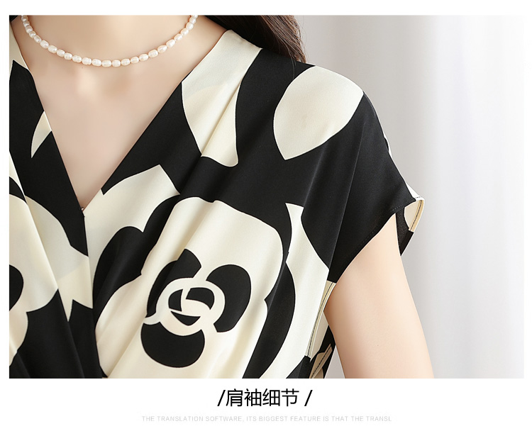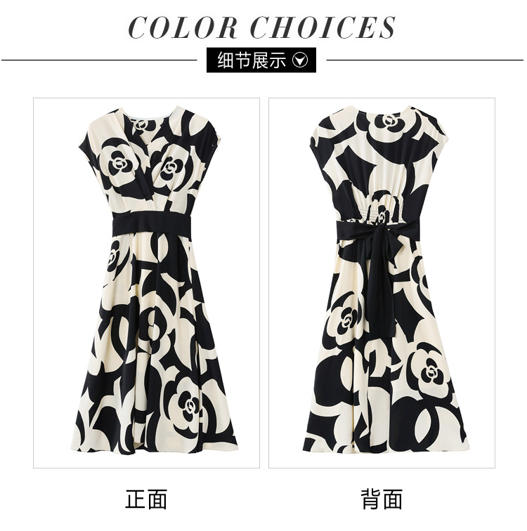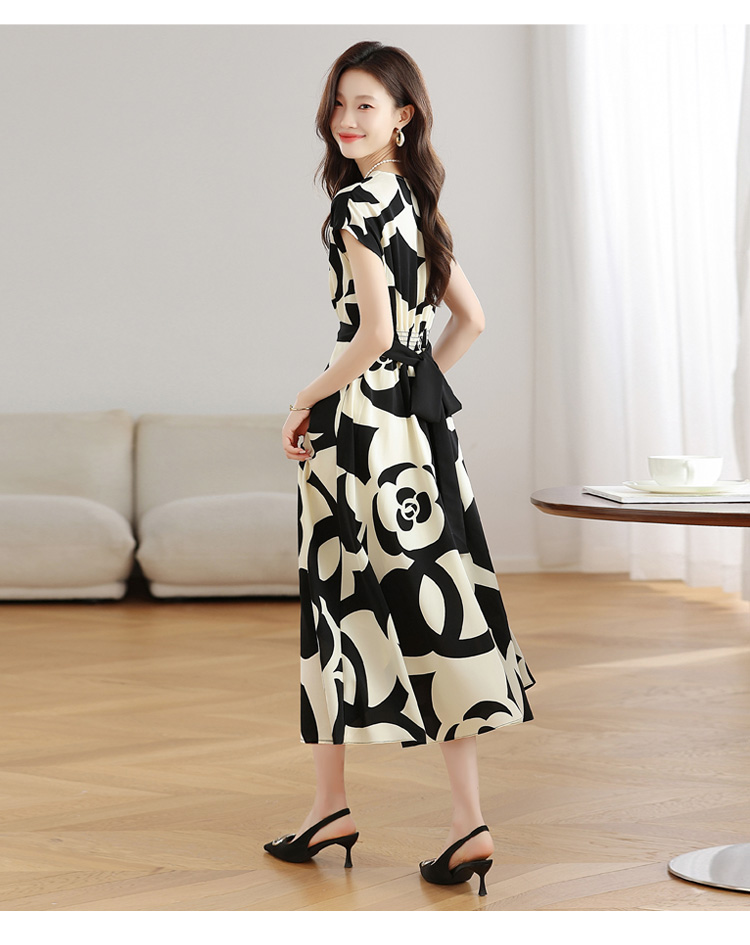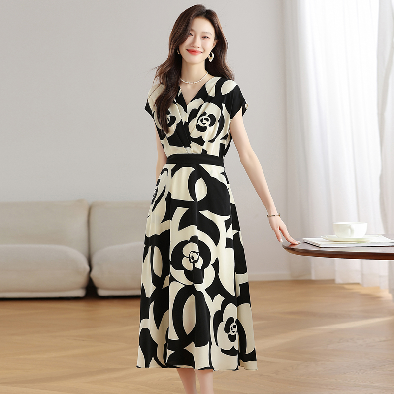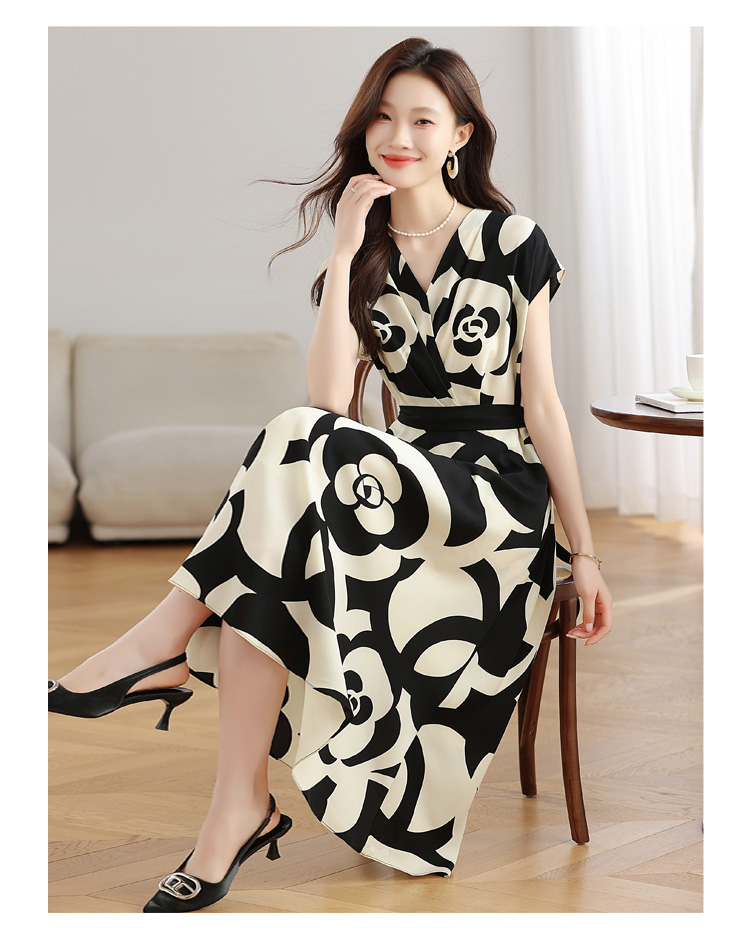 RY307# 实拍夏季新款女法式v领收腰气质a字裙温柔风印花中长款雪纺连衣裙