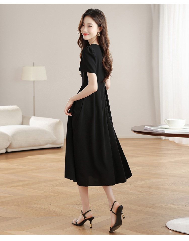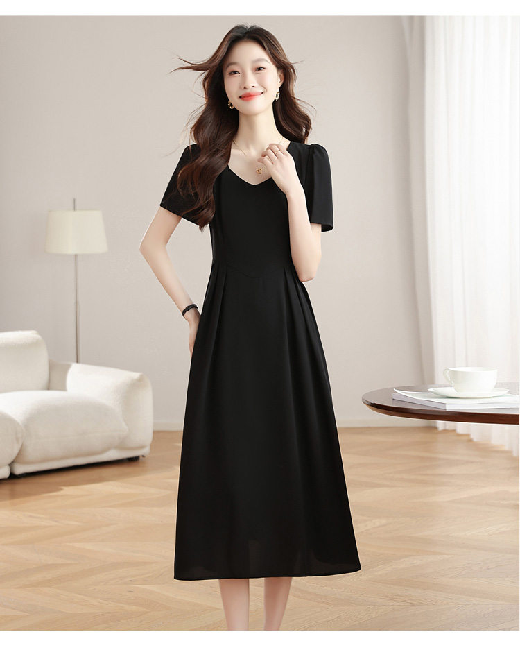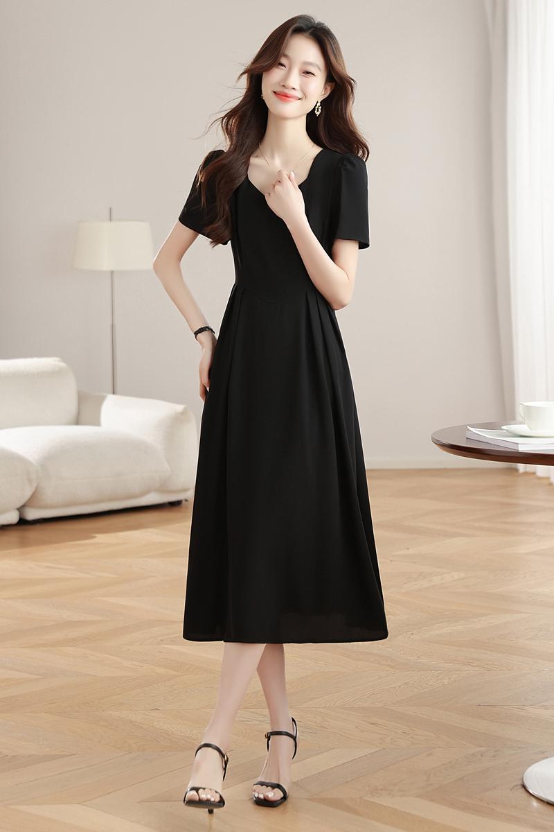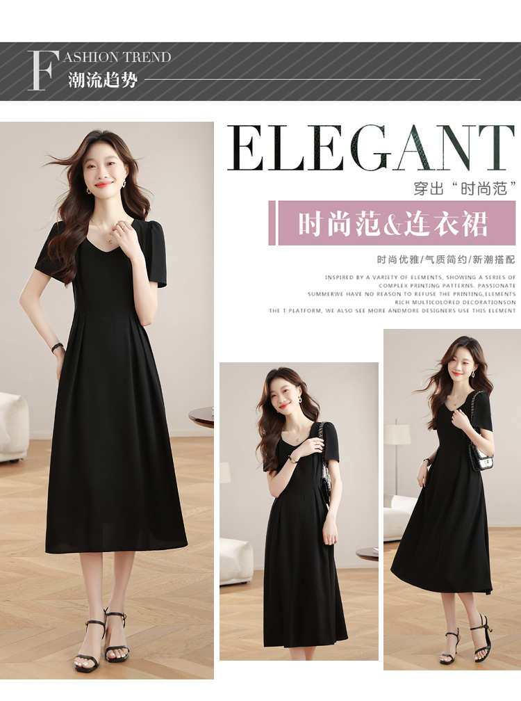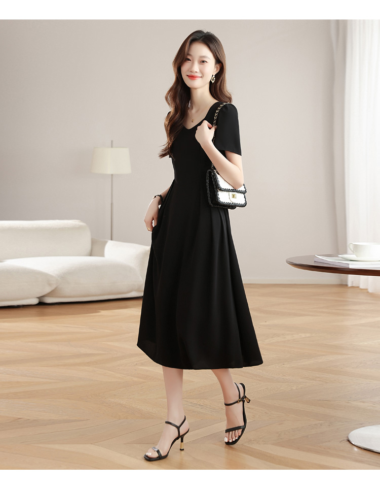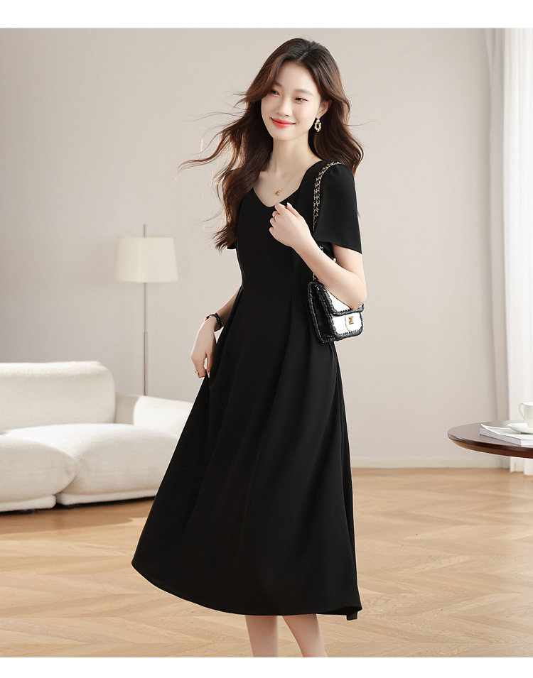 RY311# 实拍 高级感赫本风短袖连衣裙女夏新款显瘦收腰长裙U领a字裙子女