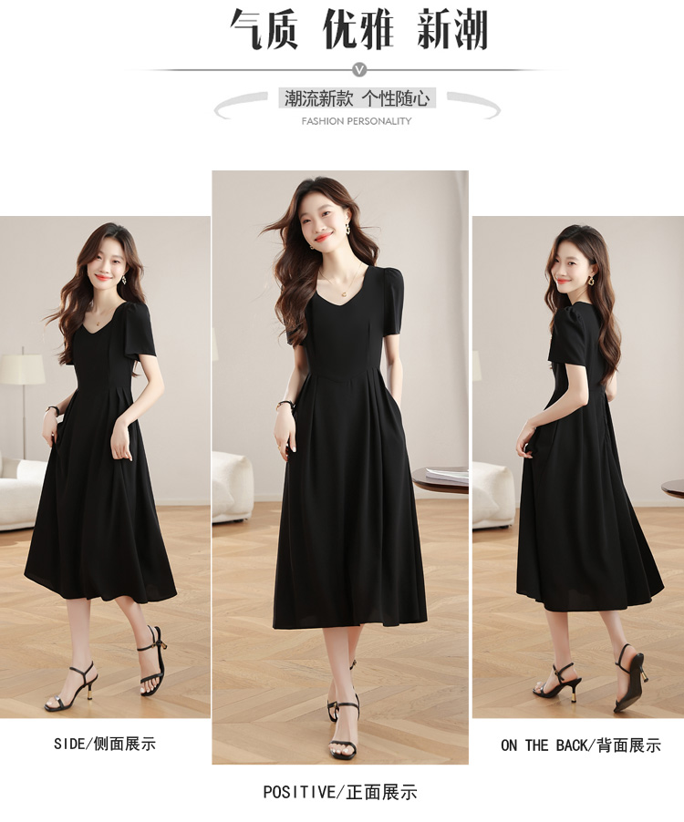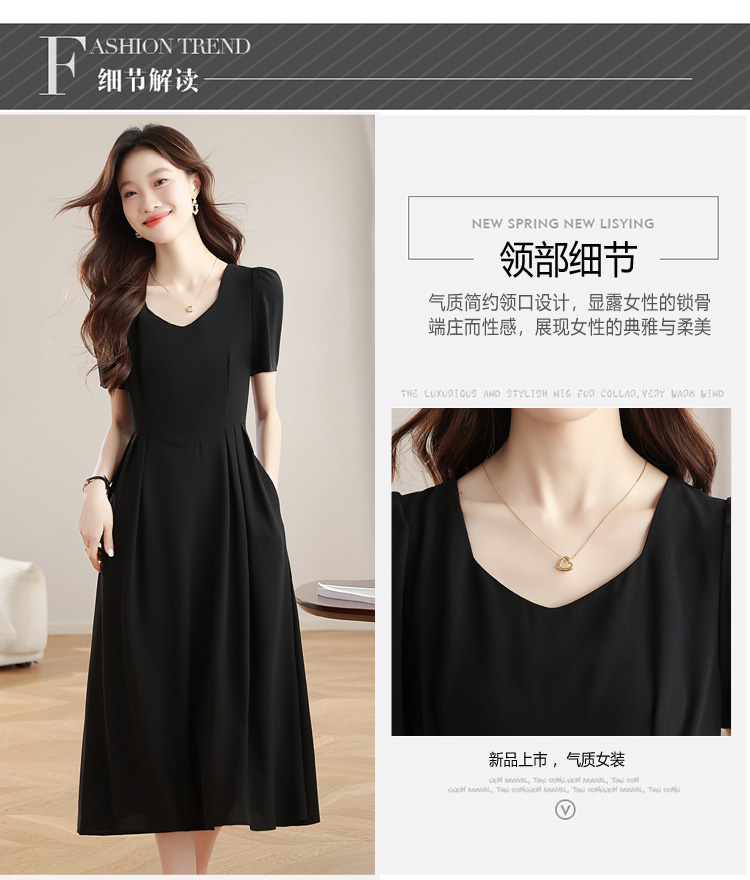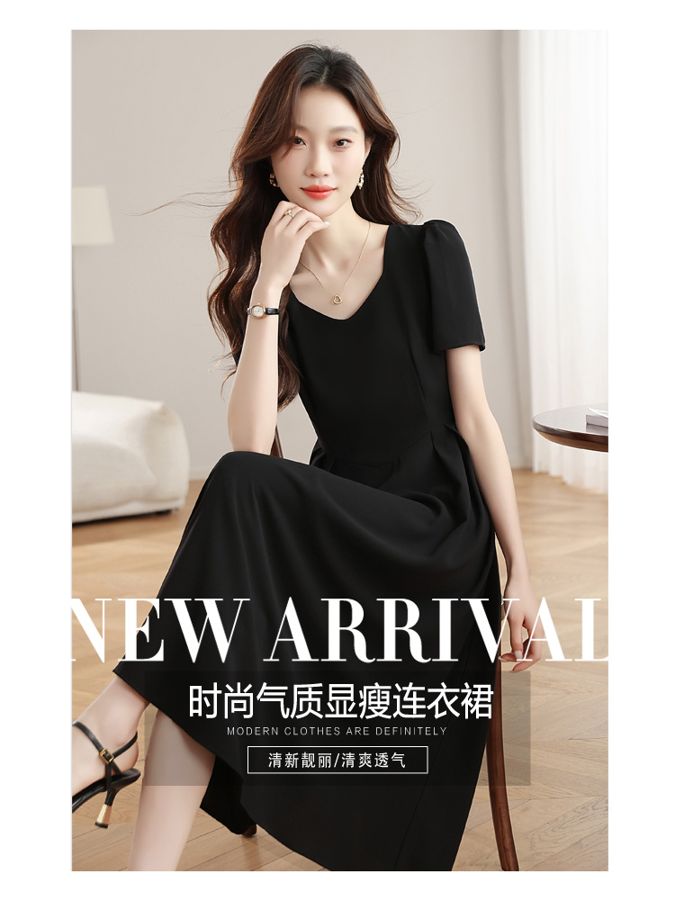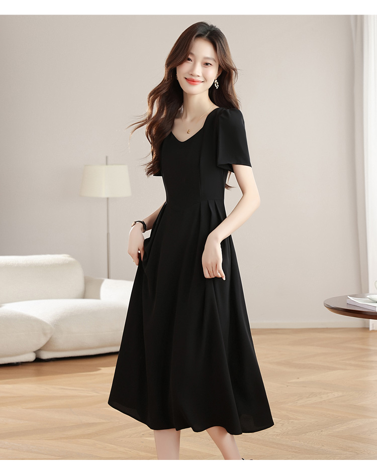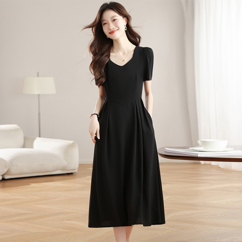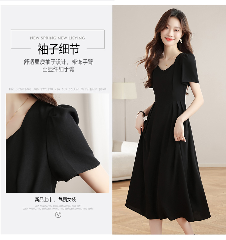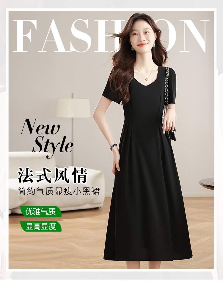 RY311# 实拍 高级感赫本风短袖连衣裙女夏新款显瘦收腰长裙U领a字裙子女