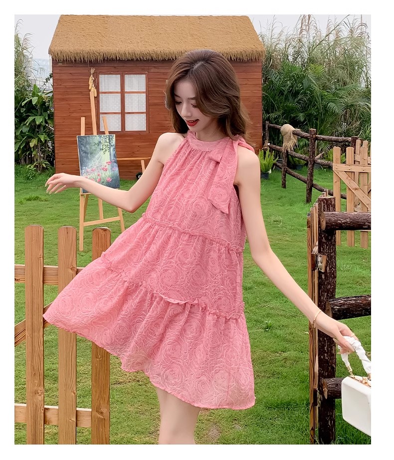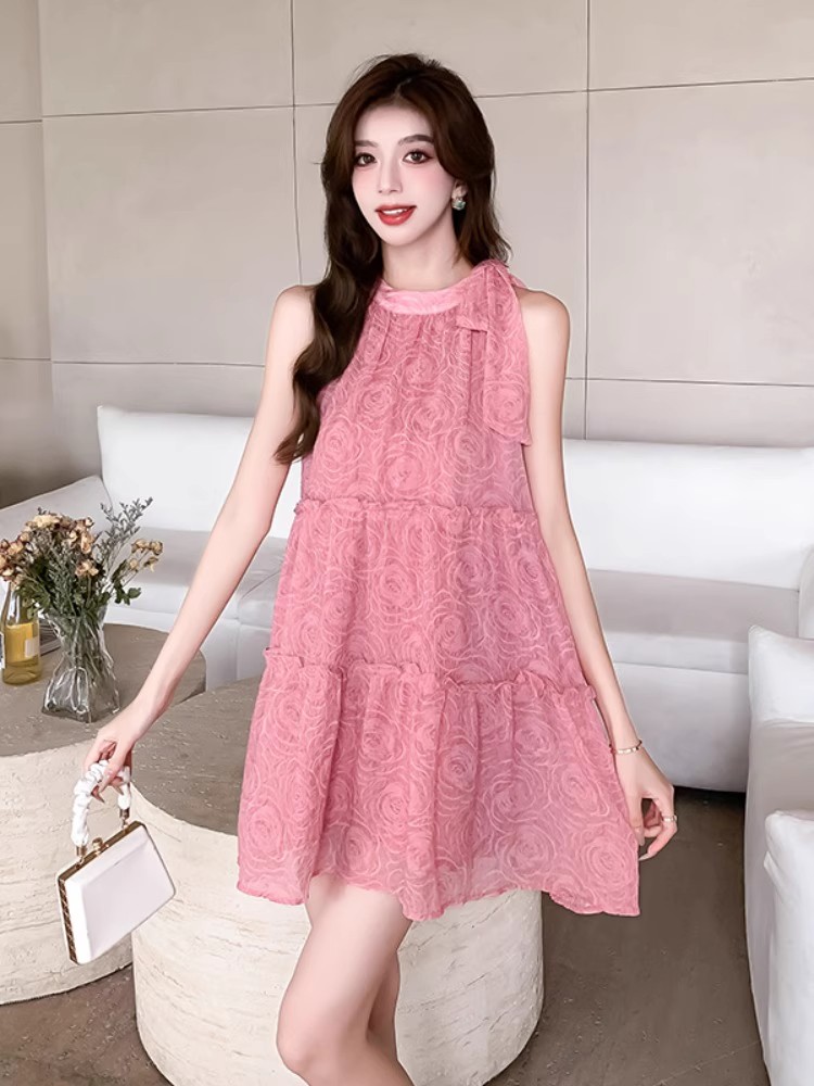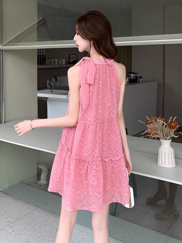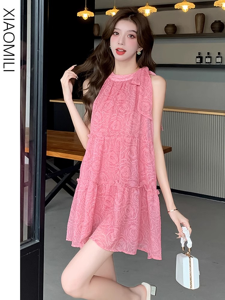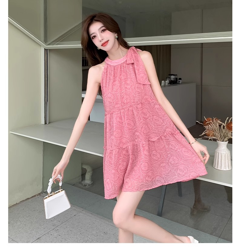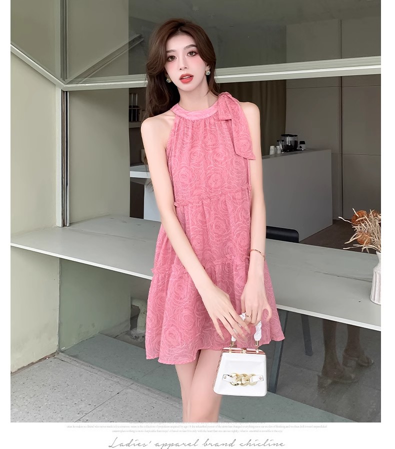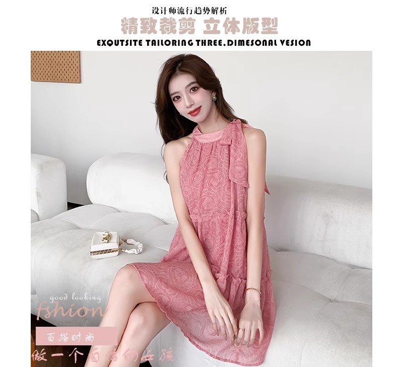 RY323# 温柔风粉色挂脖连衣裙女夏日海边度假沙滩裙超好看印花大摆短裙子