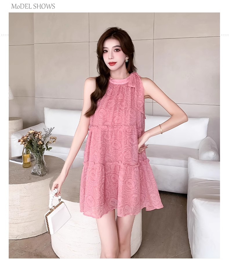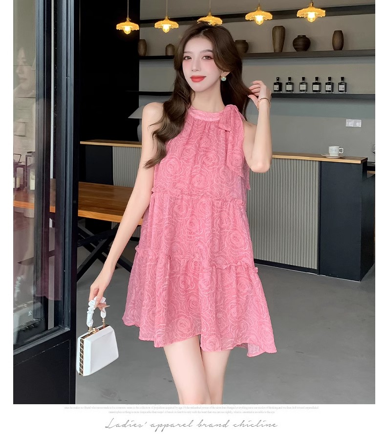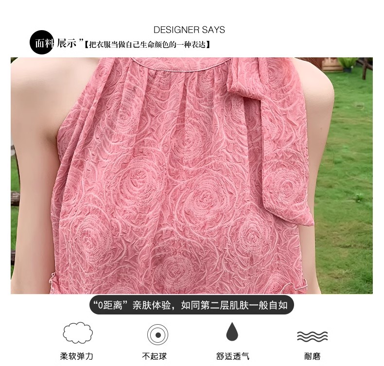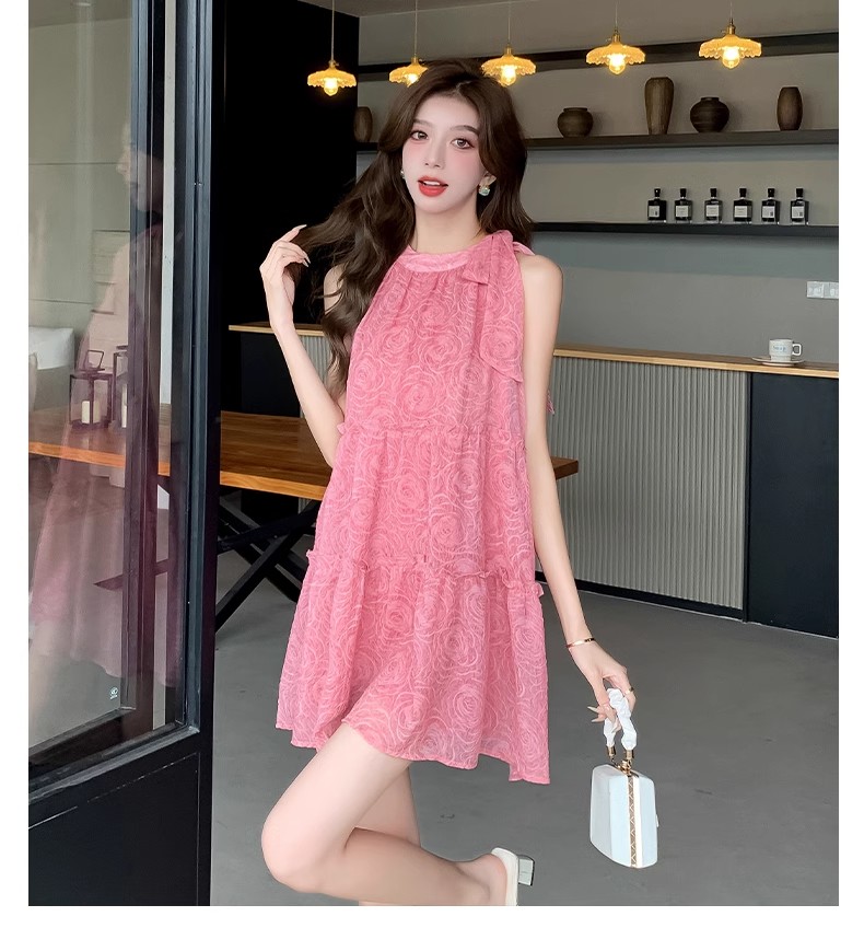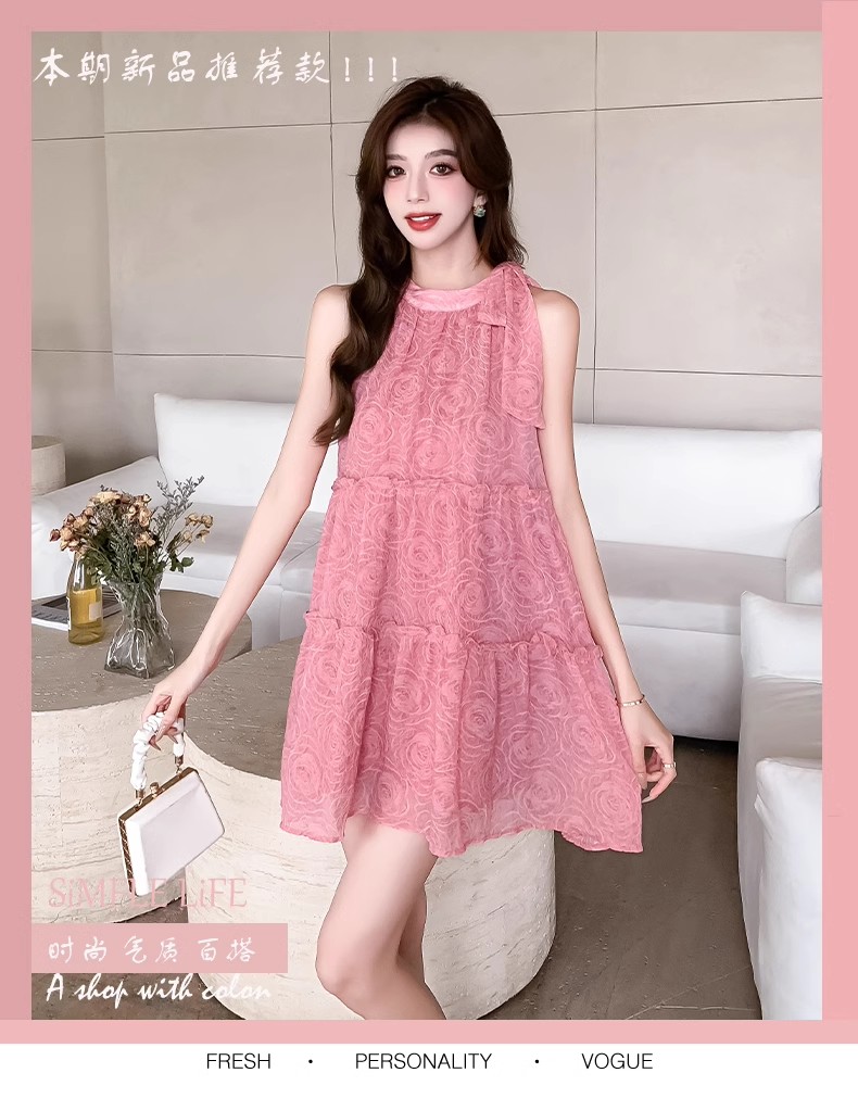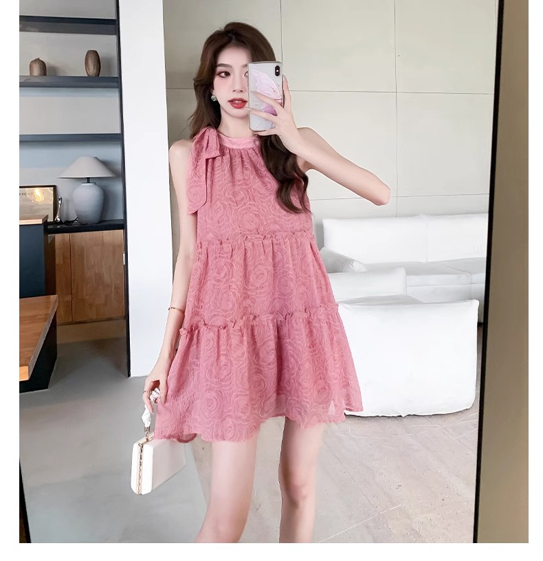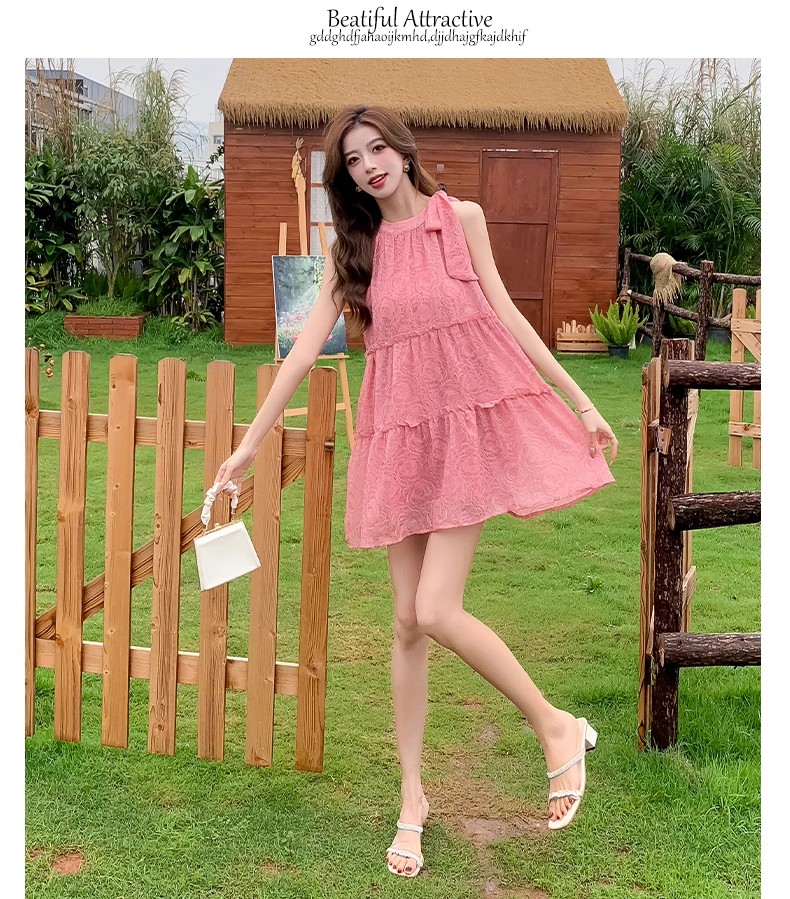 RY323# 温柔风粉色挂脖连衣裙女夏日海边度假沙滩裙超好看印花大摆短裙子