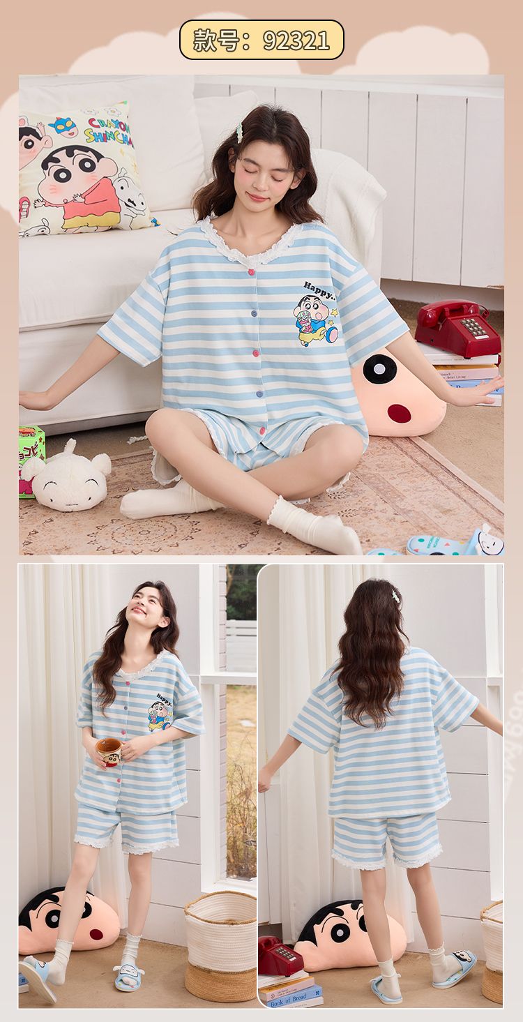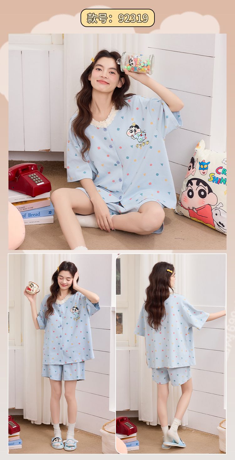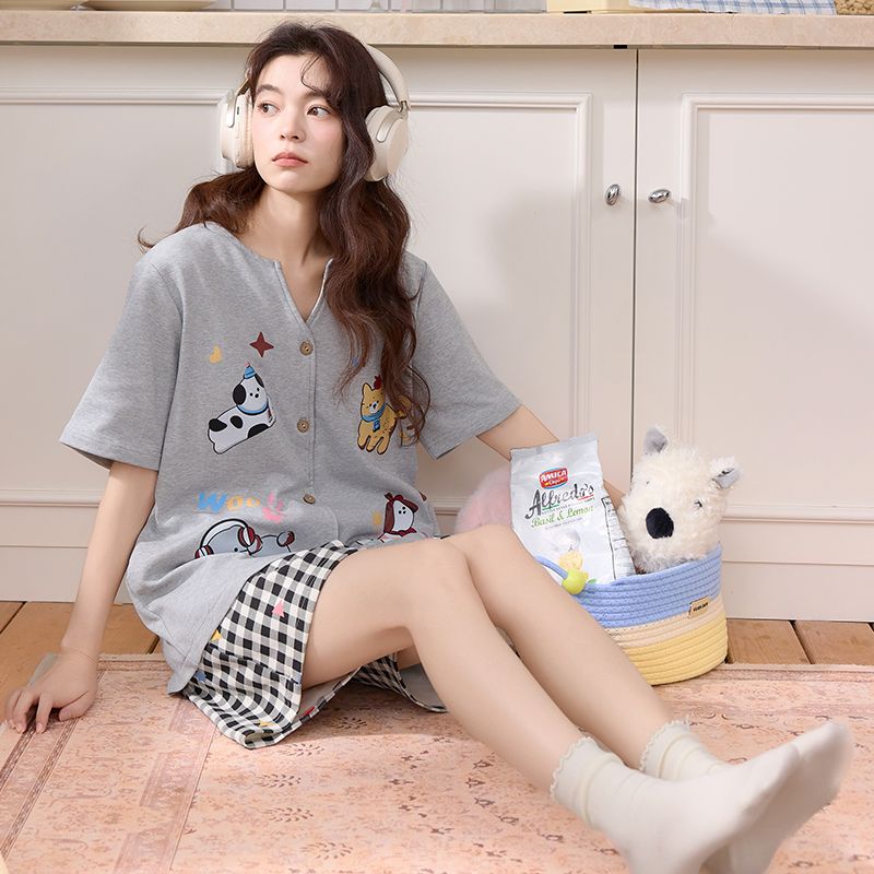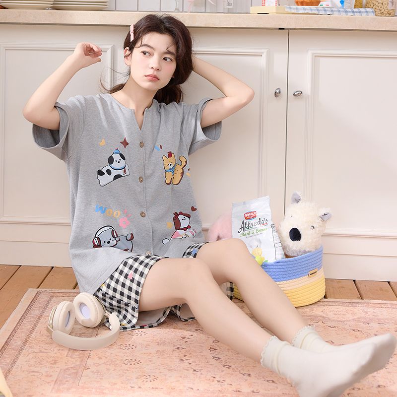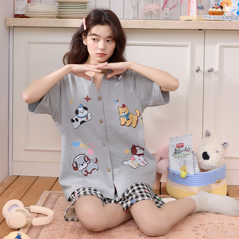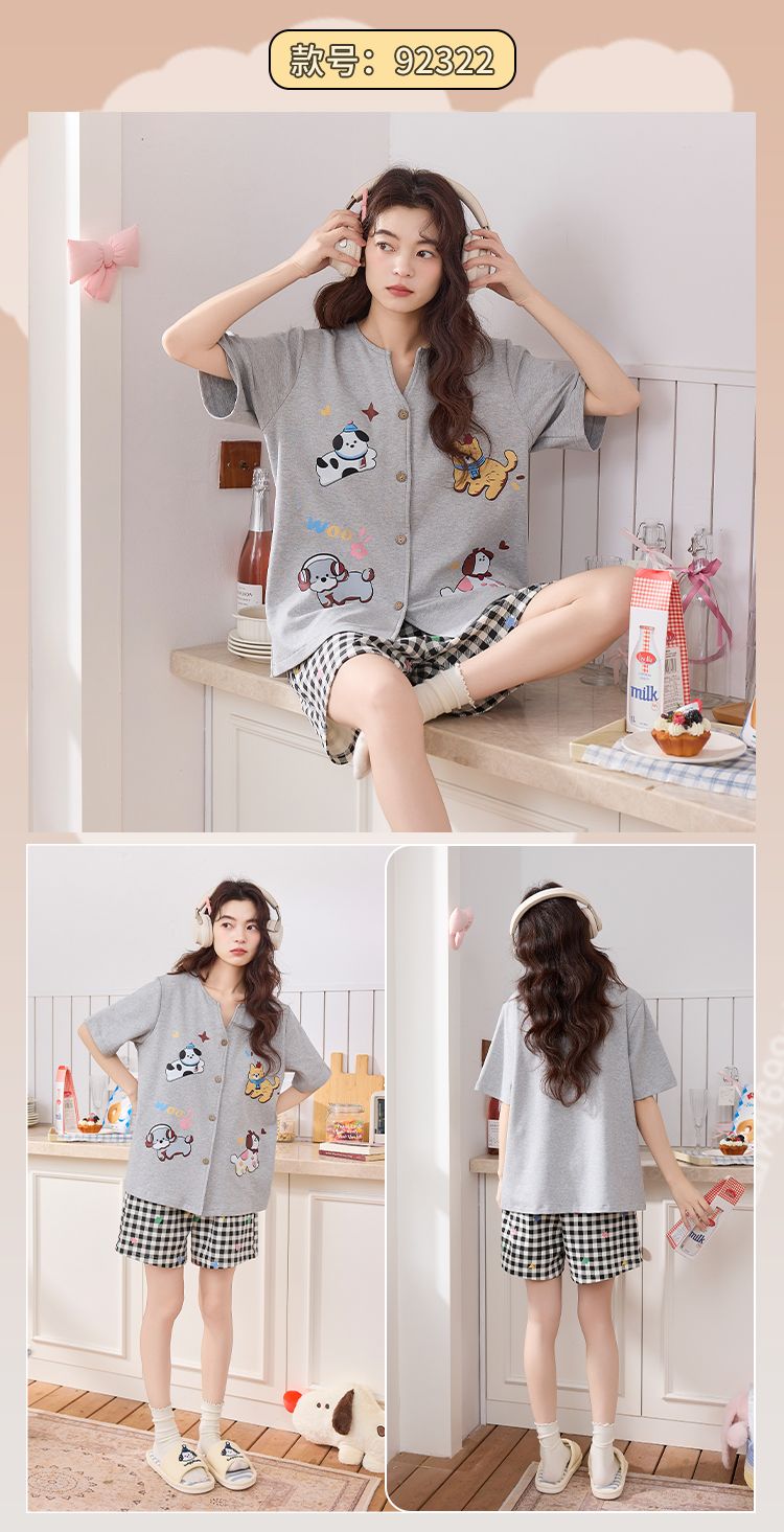 RY337# 果子狸 夏季短袖短裤开衫圆领睡衣女简约舒适拉架仿棉家居服